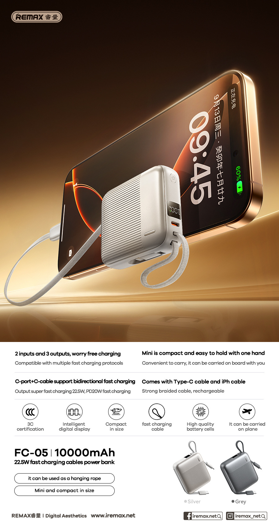 Remax 새로운 자동 이중 라인 고속 충전 보조베터리 소형 10000mAh 22.5w 내장 케이블 보조베터리
