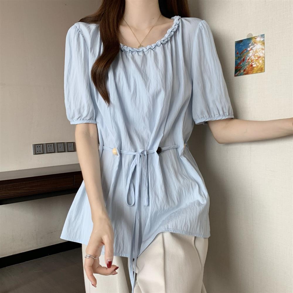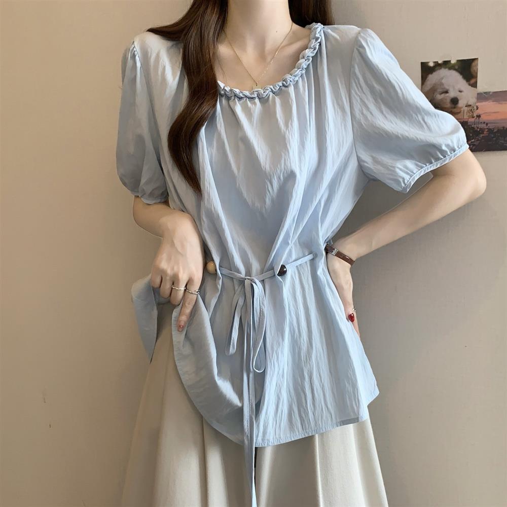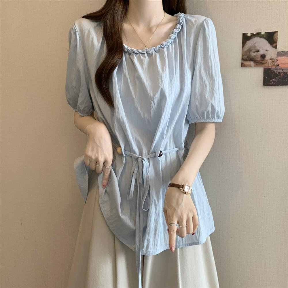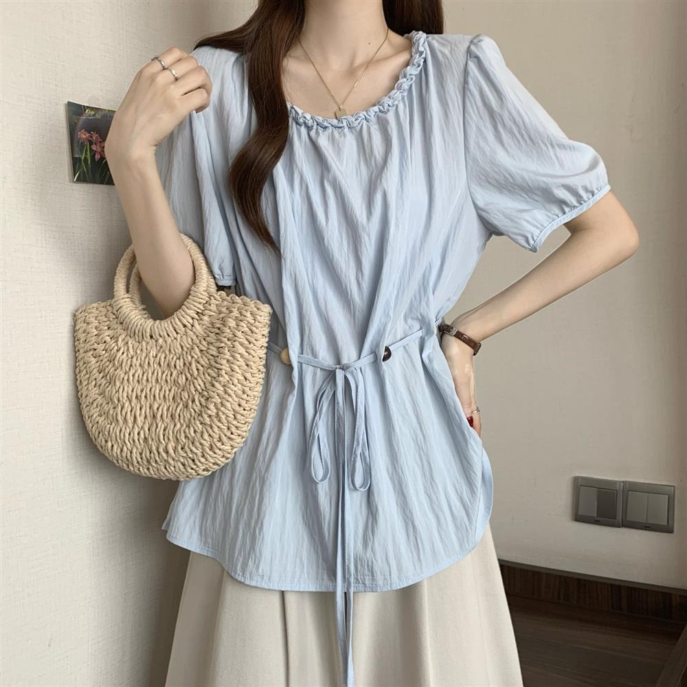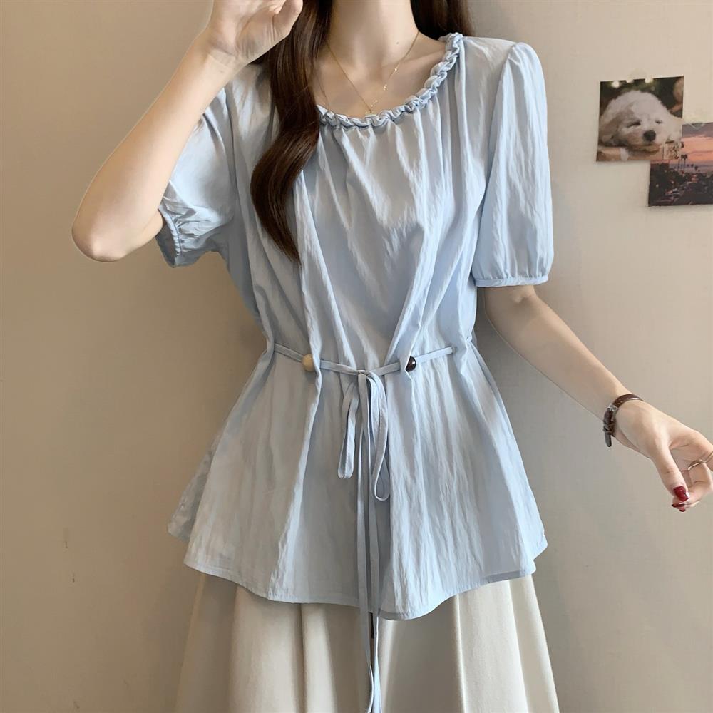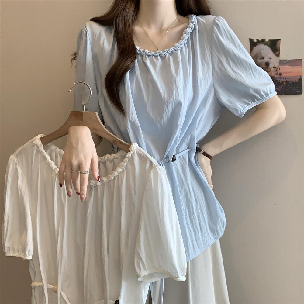 블루 버블 슬리브 쉬폰 반팔 셔츠 여성용 2025 년 여름 플러스 사이즈 통통녀 배꼽 허리 인형 셔츠 탑스토어 가기