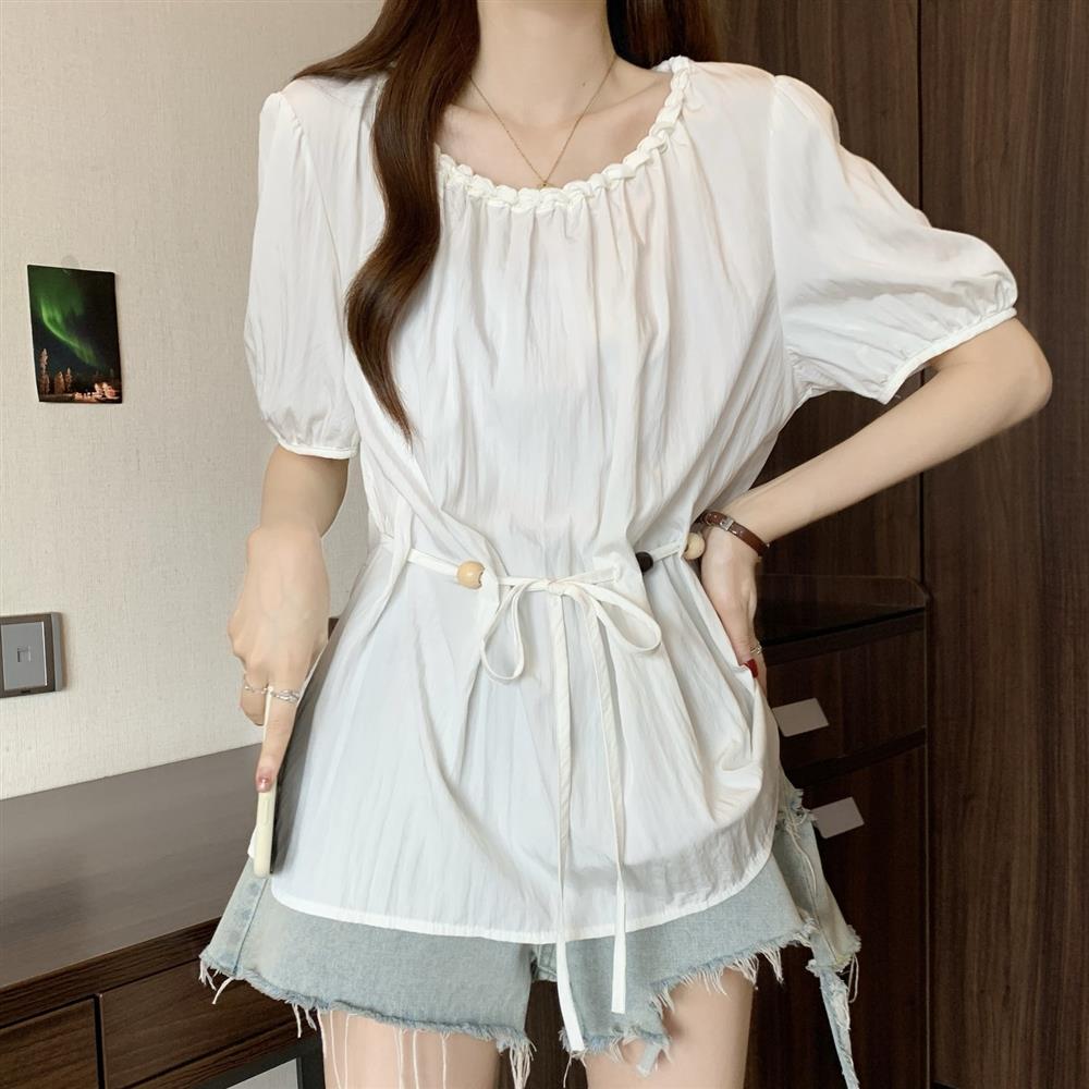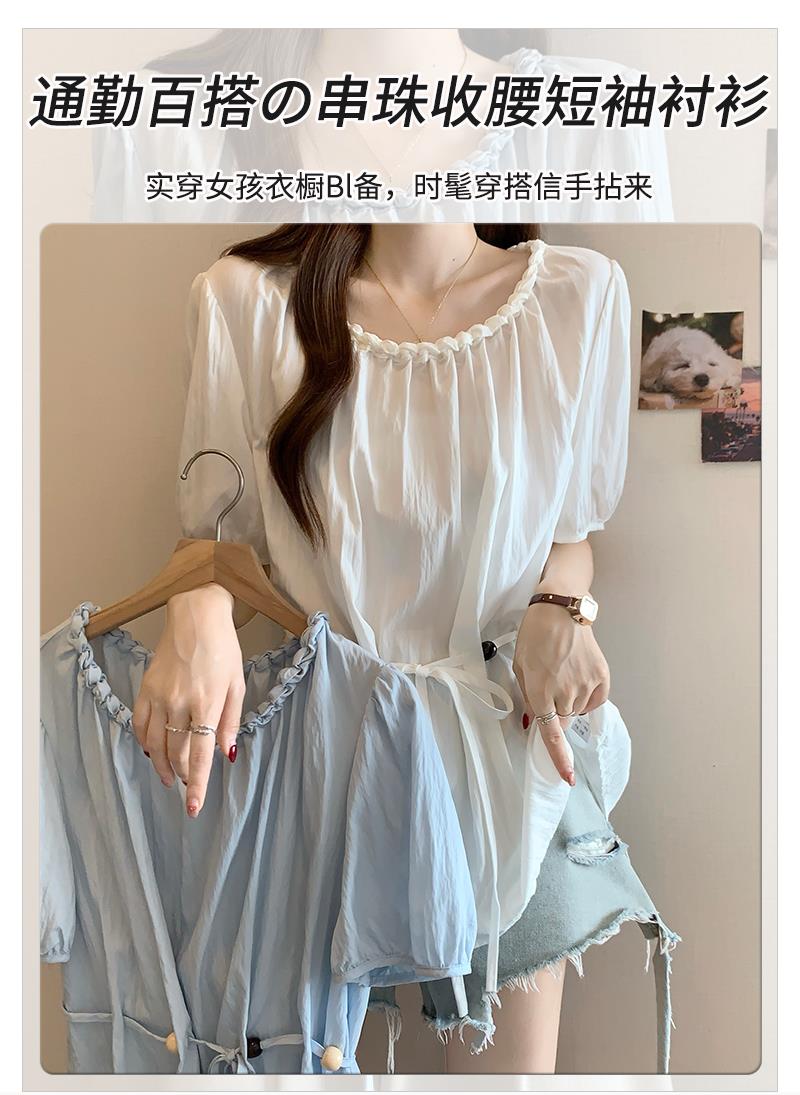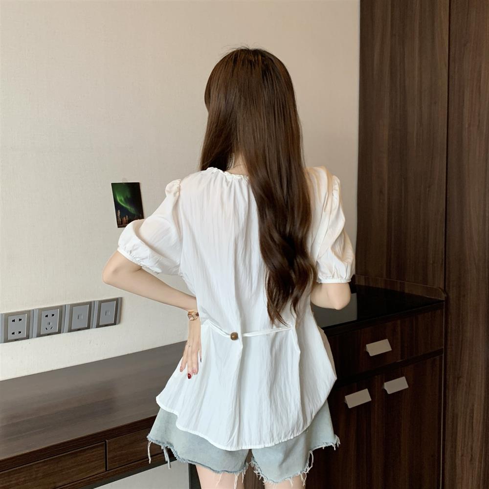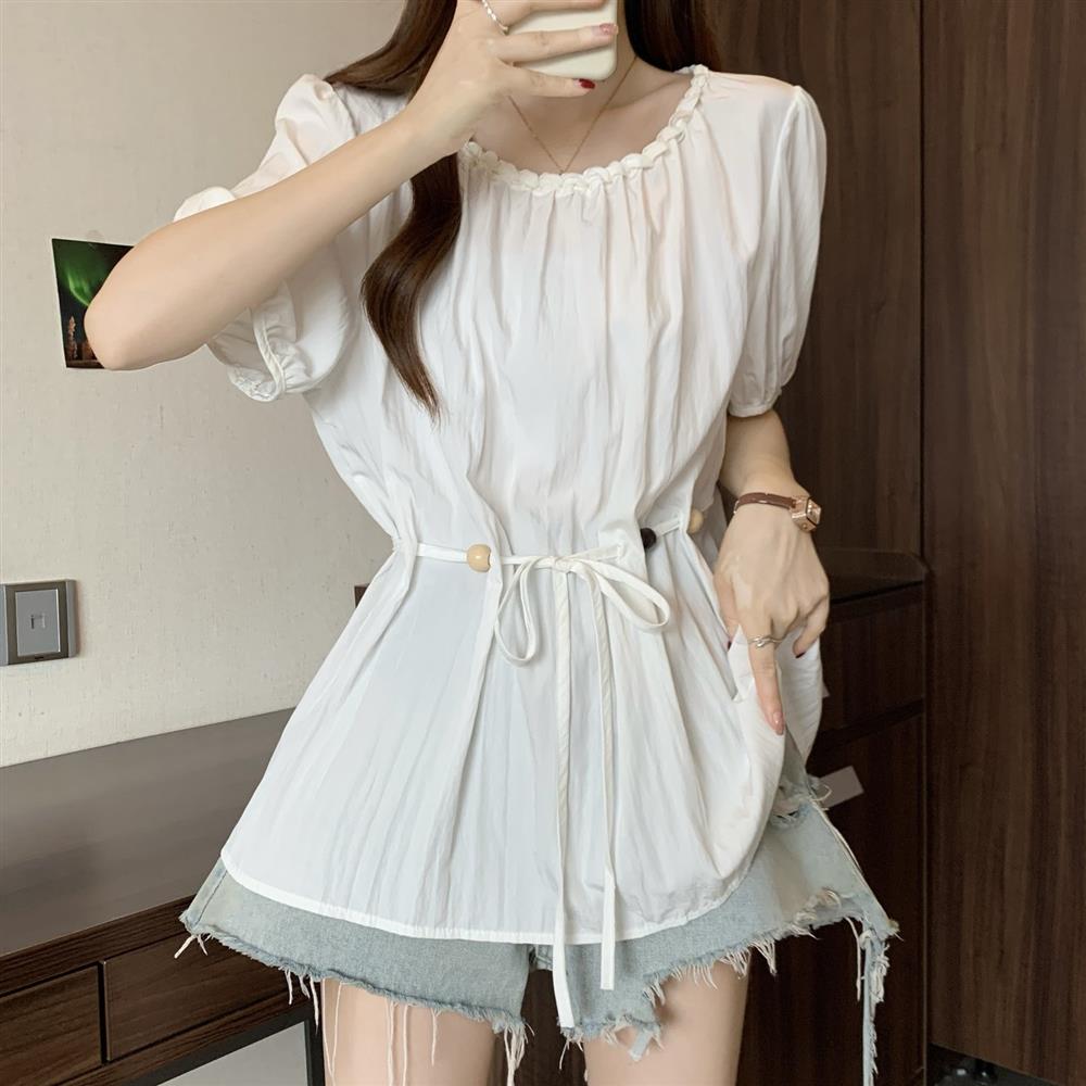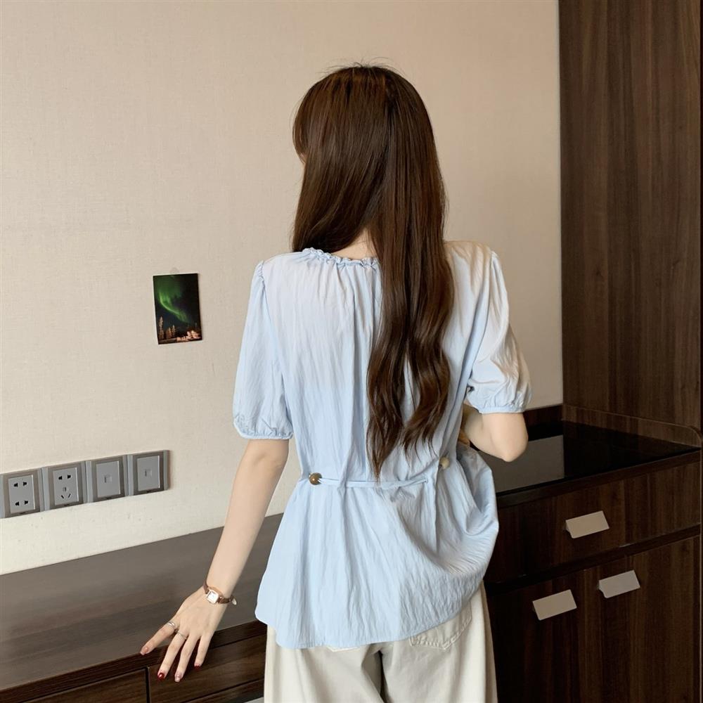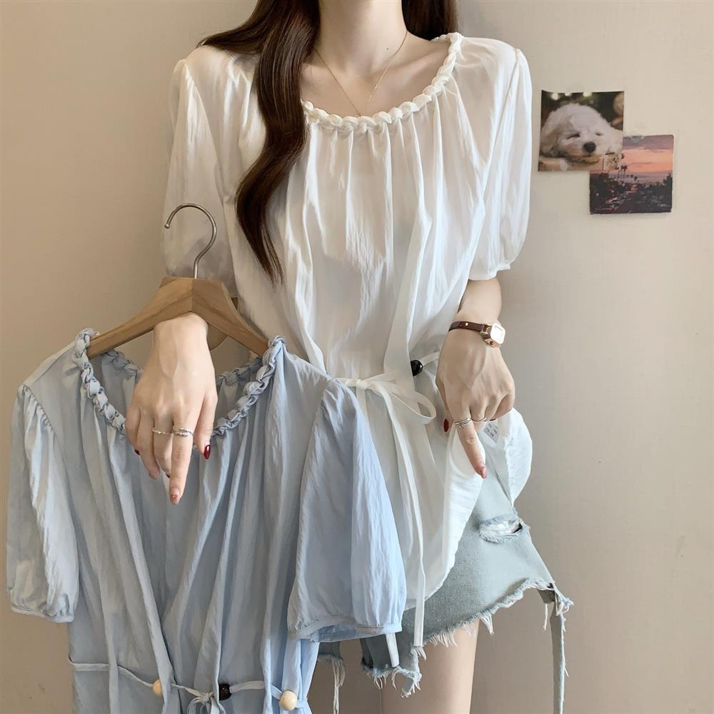블루 버블 슬리브 쉬폰 반팔 셔츠 여성용 2025 년 여름 플러스 사이즈 통통녀 배꼽 허리 인형 셔츠 탑스토어 가기