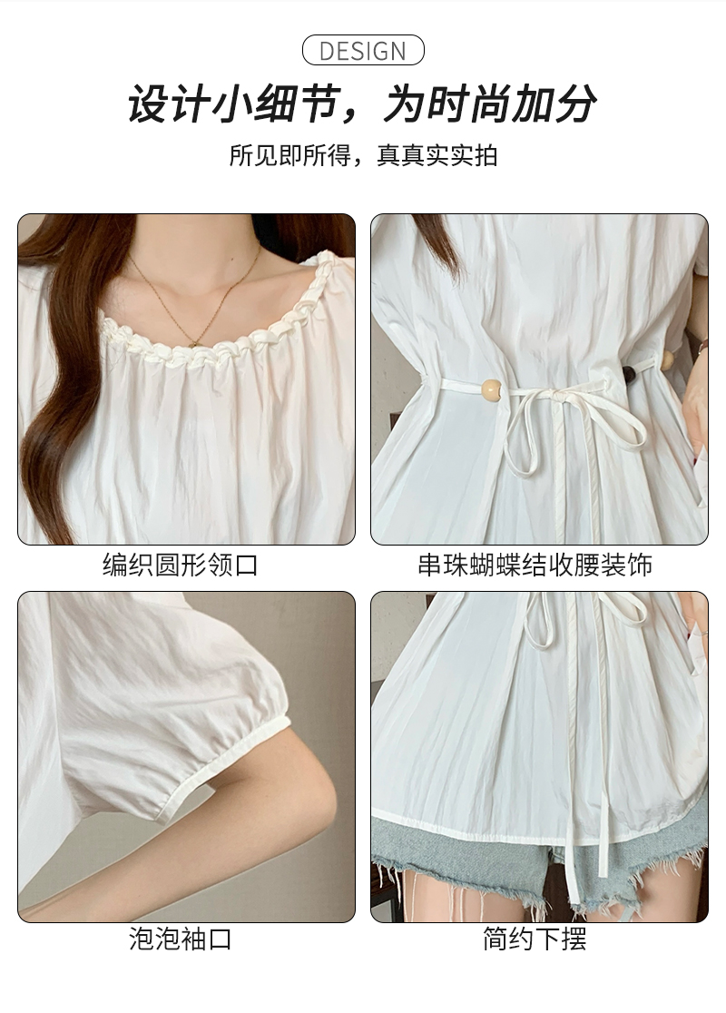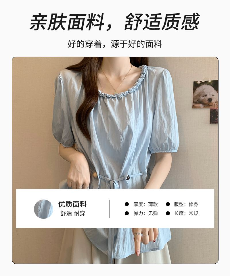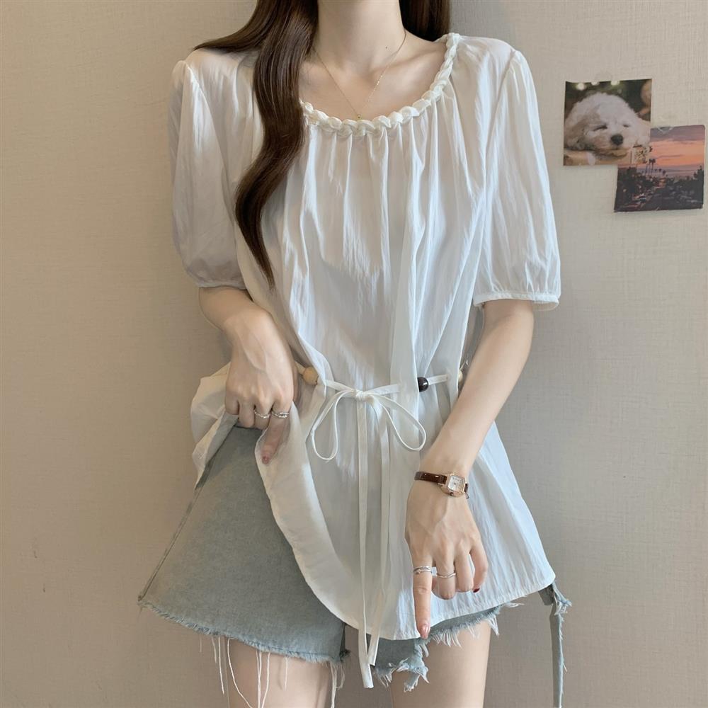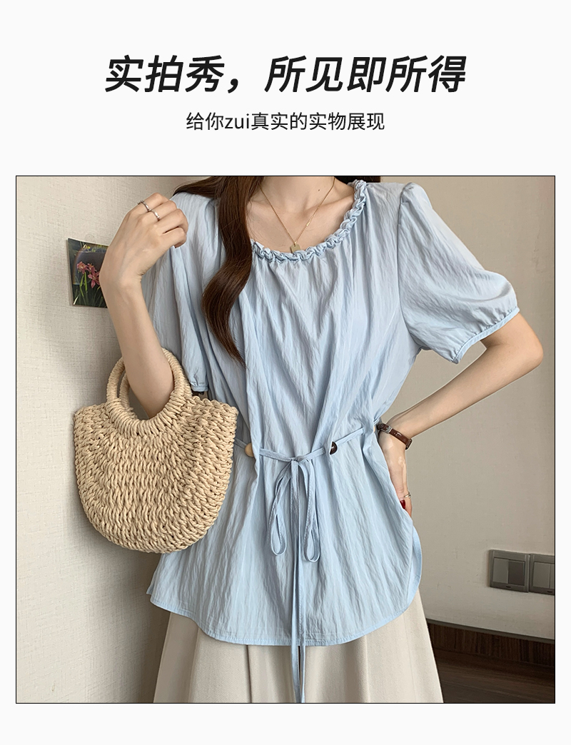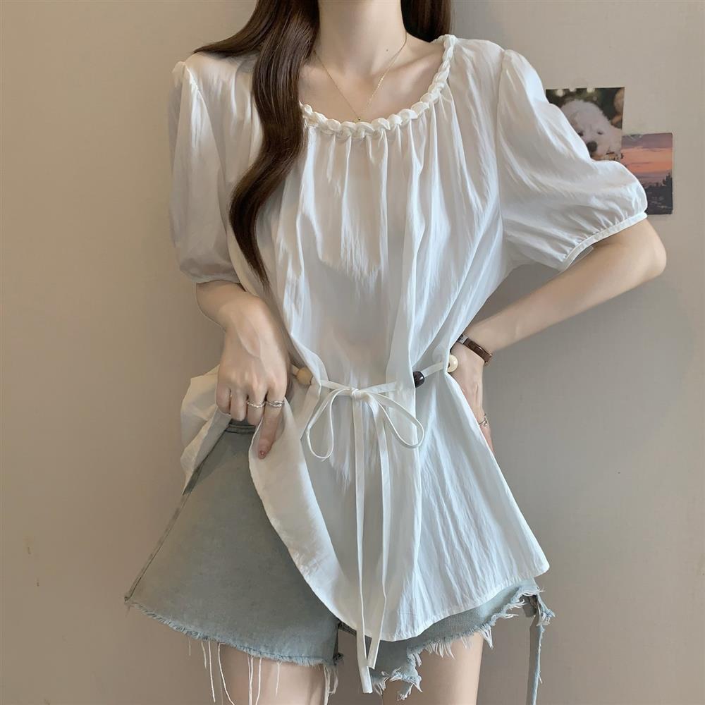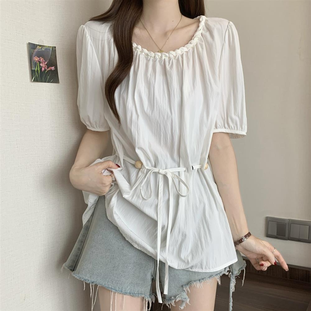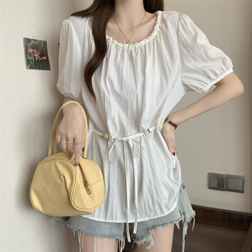 블루 버블 슬리브 쉬폰 반팔 셔츠 여성용 2025 년 여름 플러스 사이즈 통통녀 배꼽 허리 인형 셔츠 탑스토어 가기