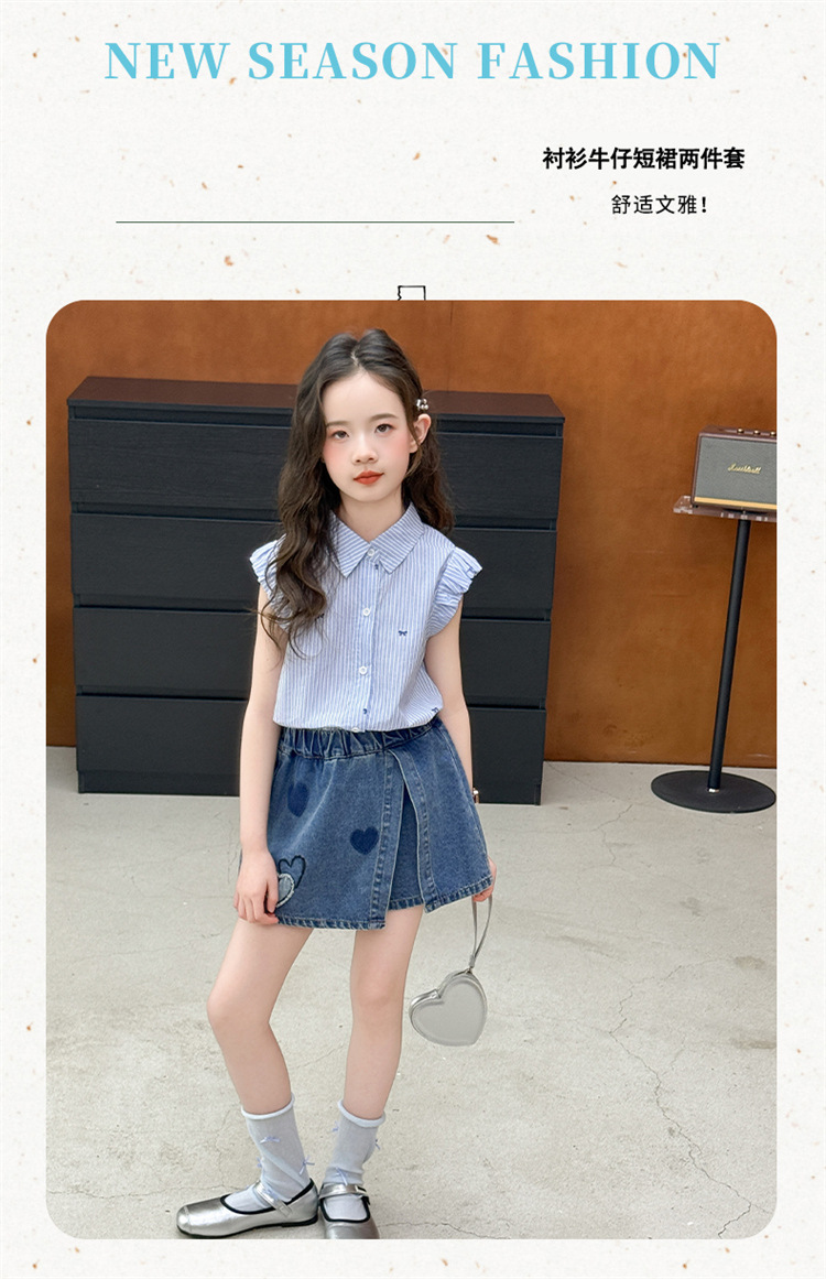 여자 세트 2025 여름 새로운 어린이 유행 서양식 줄무늬 셔츠 데님 문화 한국 2 피스 트렌디 세트스토어 가기
