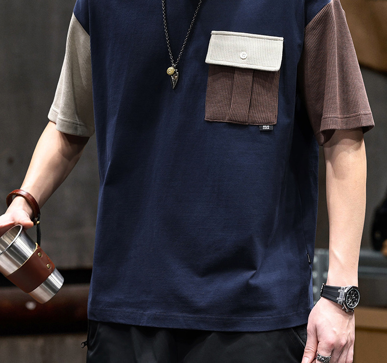 2025 여름 남성 신작 아메리칸 레트로 대비 색상 루즈 반팔 티셔츠 하이 엔드 캐주얼 스플 라이스 탑