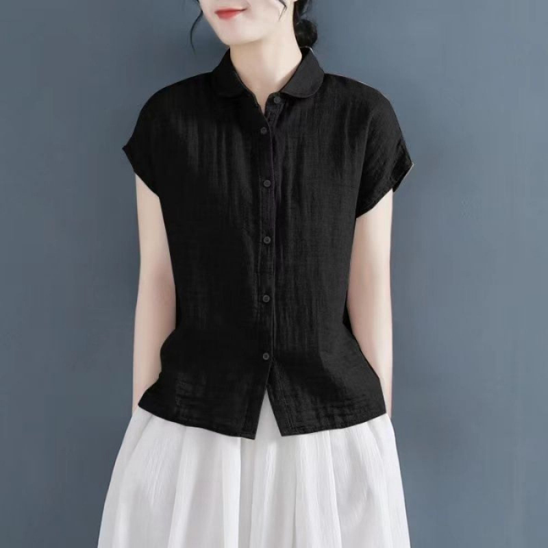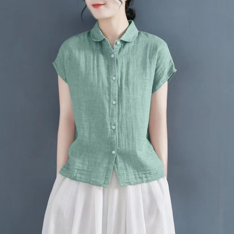 여름 폴로 칼라 디자인 코튼 린넨 짧은 소매 셔츠 여성의 느슨한 작은 플라이 슬리브 코튼 린넨 셔츠 플러스 사이즈 린넨 탑