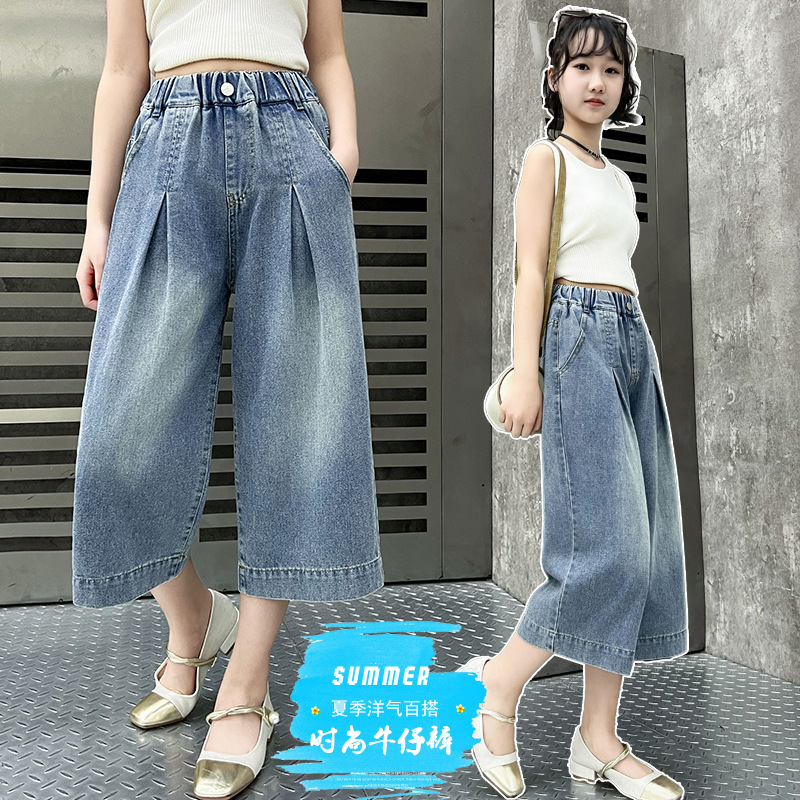 여자 얇은 청바지 2025 여름 새로운 어린이 아기 느슨한 넓은 다리 바지 한국 스타일 스트레이트 자른 유행 바지스토어 가기
