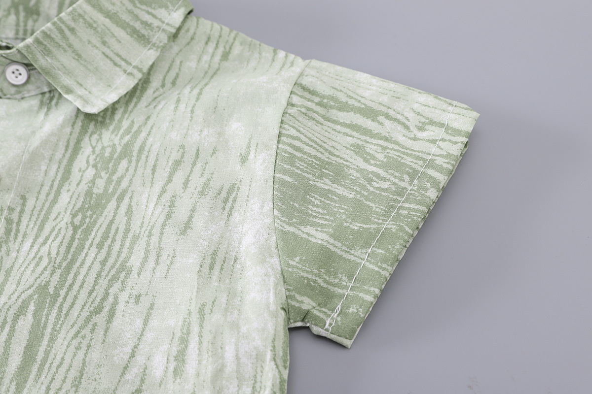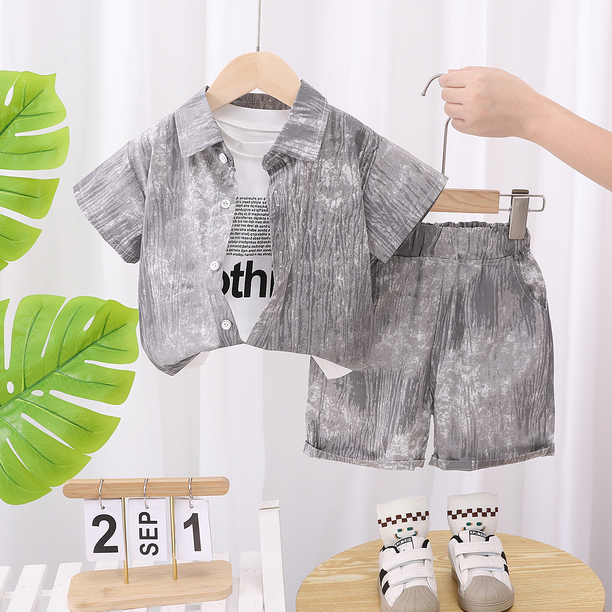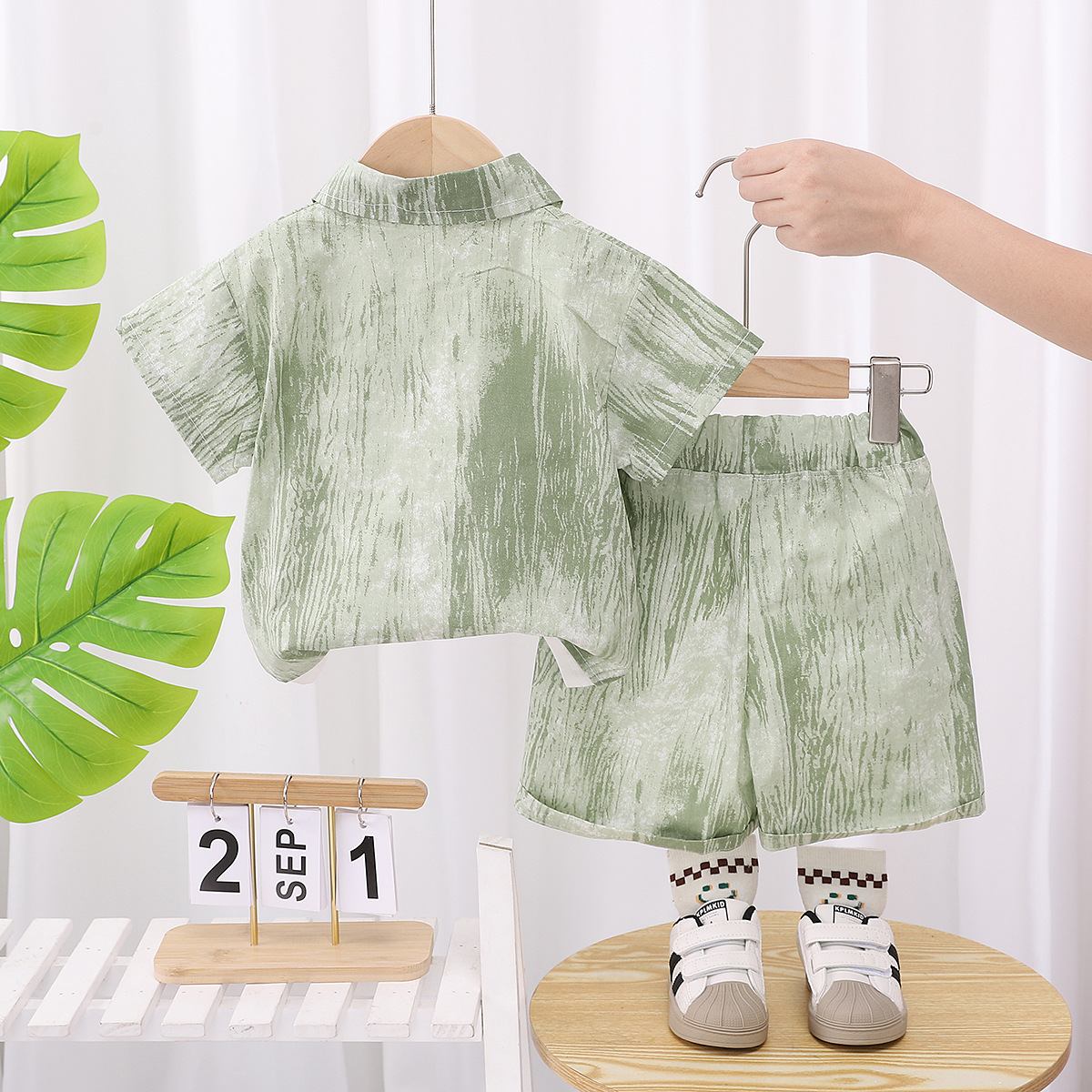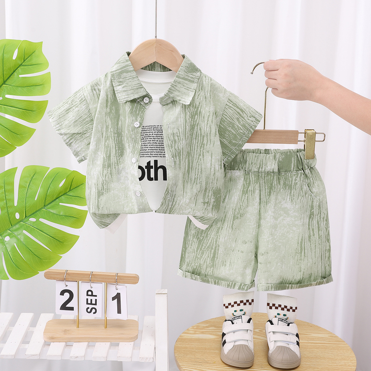 여름 정장 트렌디 한 여름 새로운 한국 스타일 소년 패션 트리 패턴 셔츠 반팔 탑 + 반바지 3 피스 슈트