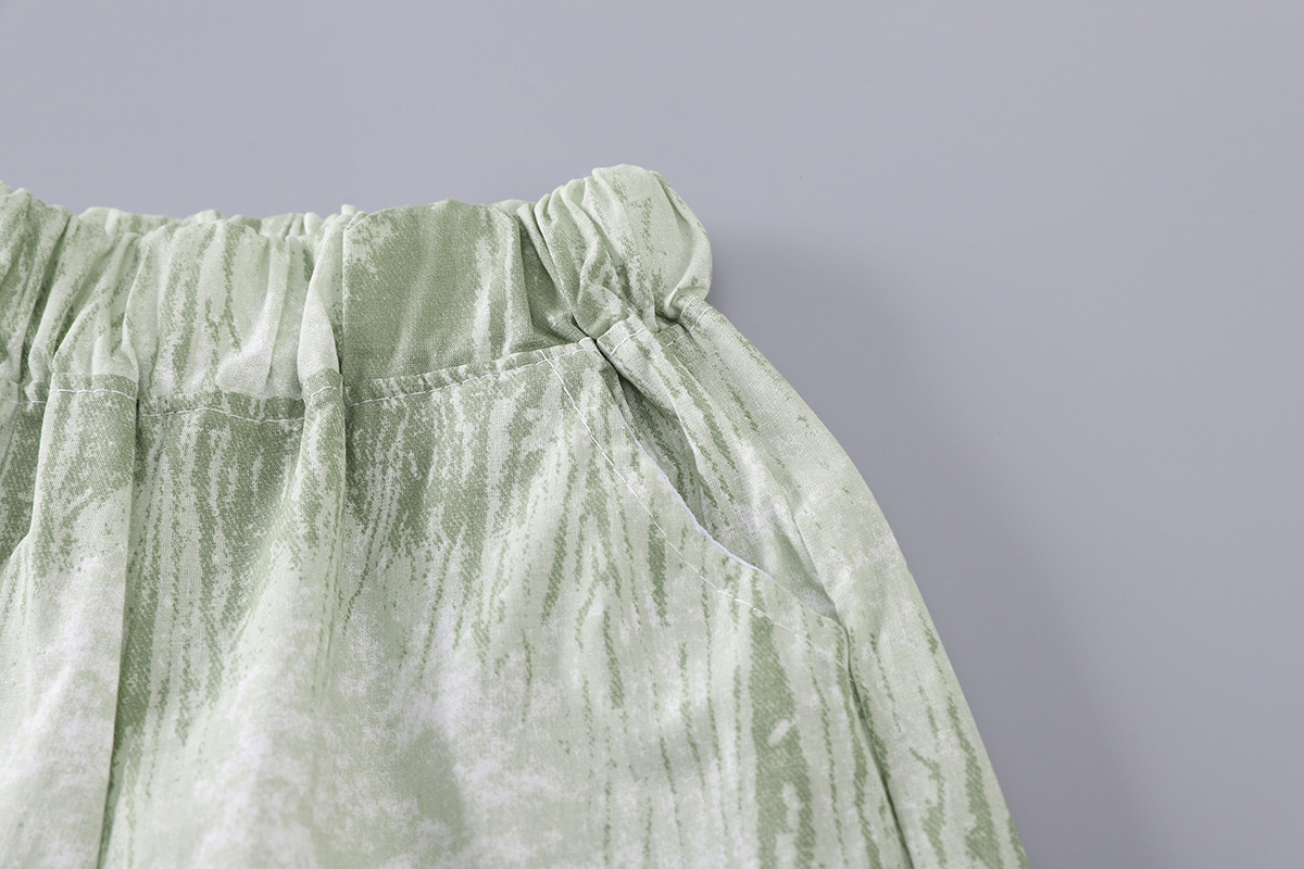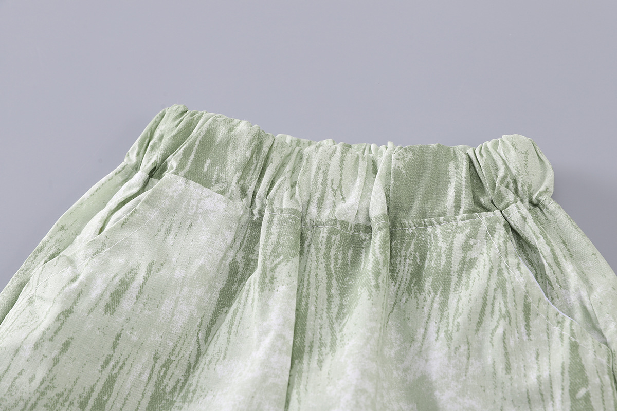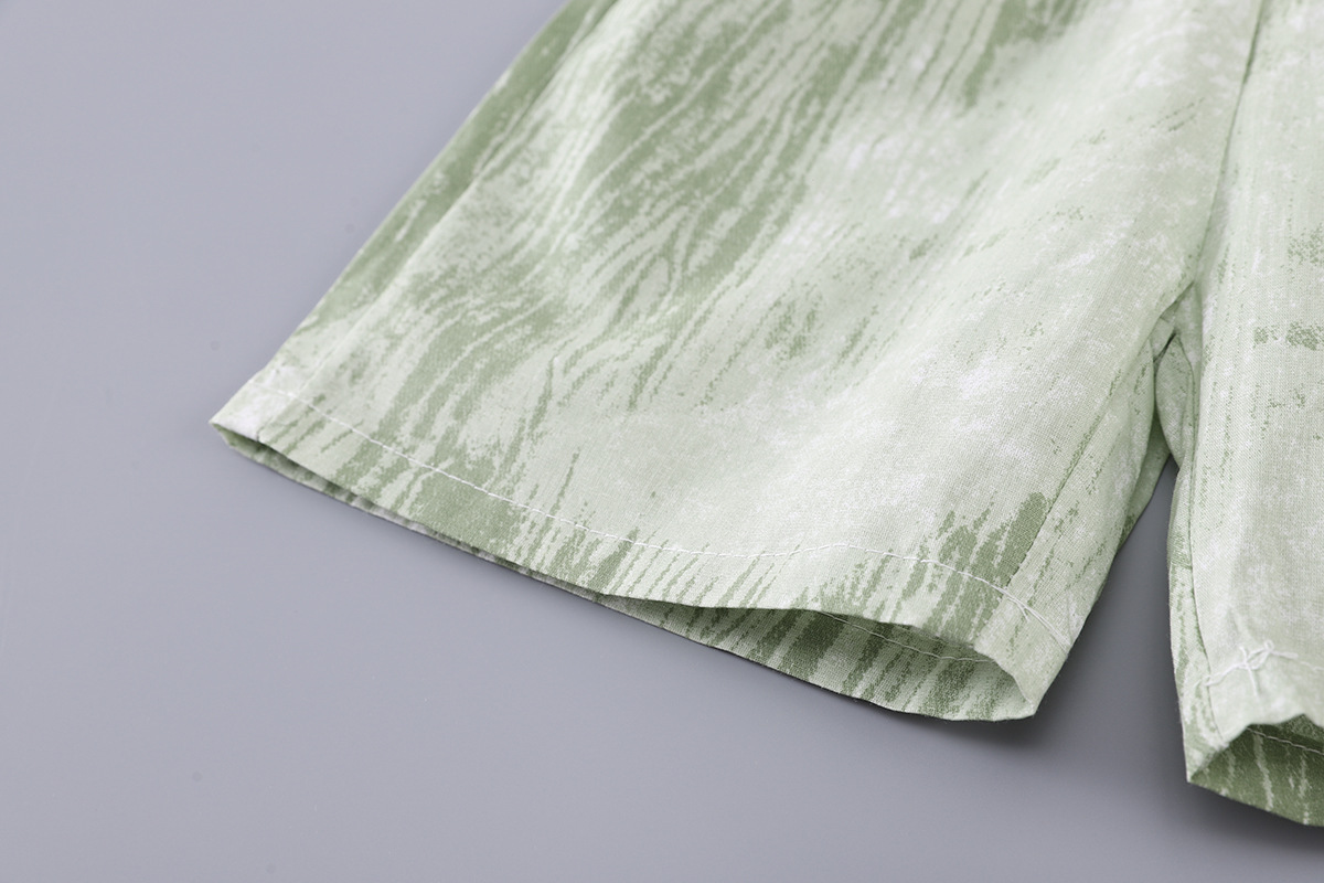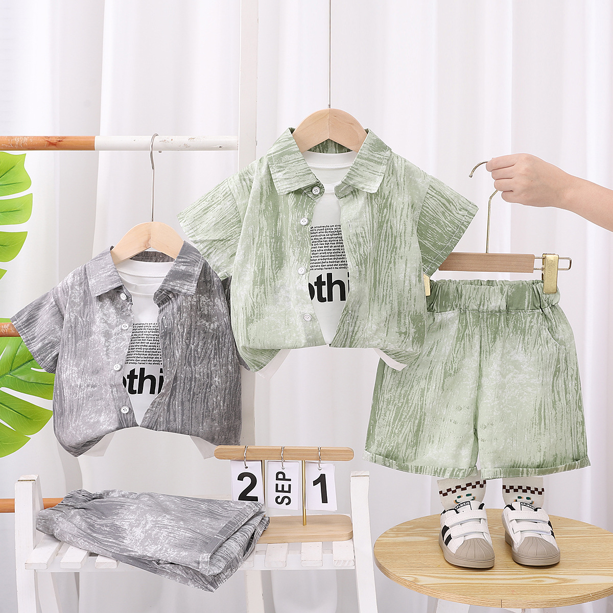 여름 정장 트렌디 한 여름 새로운 한국 스타일 소년 패션 트리 패턴 셔츠 반팔 탑 + 반바지 3 피스 슈트스토어 가기