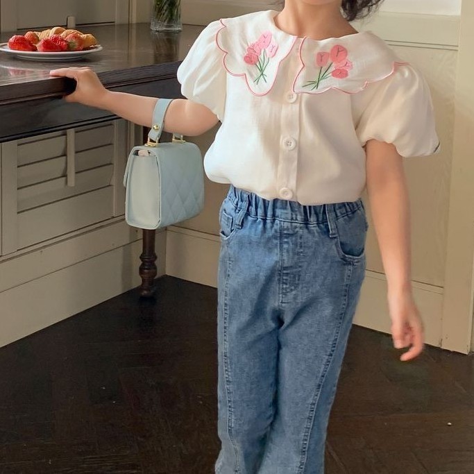 여자 여름 셔츠 아기의 서양식 어린이 성격 유행 한국 스타일 달콤한 레이스 인형 칼라 꽃 자수 셔츠스토어 가기