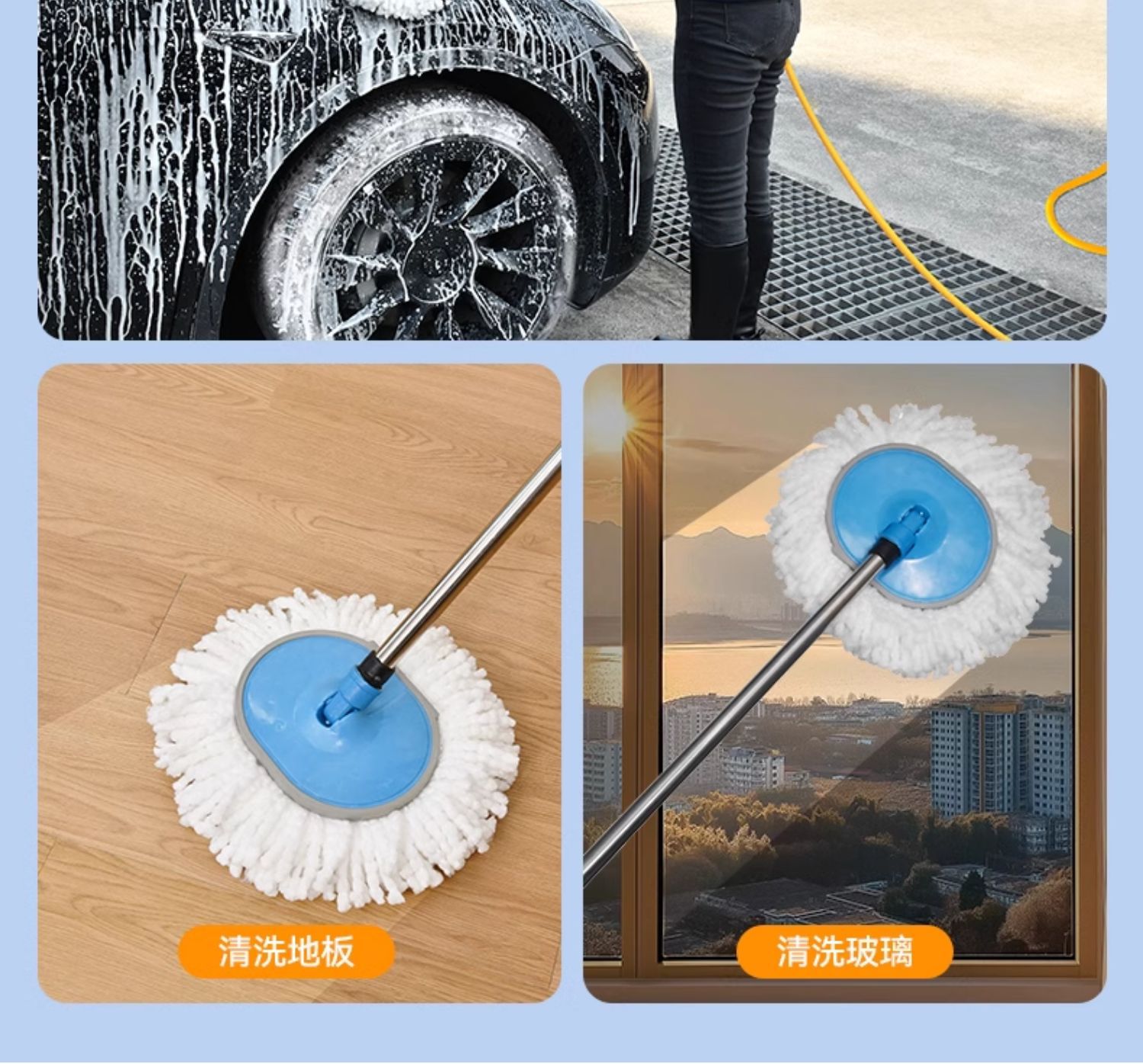 • [두꺼운 셔닐 물걸레] + 5m 수도관 + 퀵커넥터*2 + 세차타올 + 수입원료 세차액 + 유분제거필름 + 스펀지