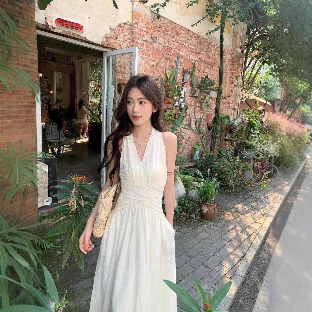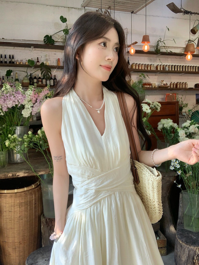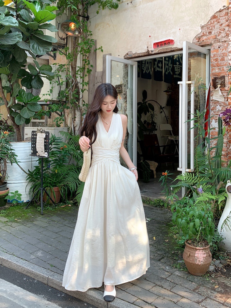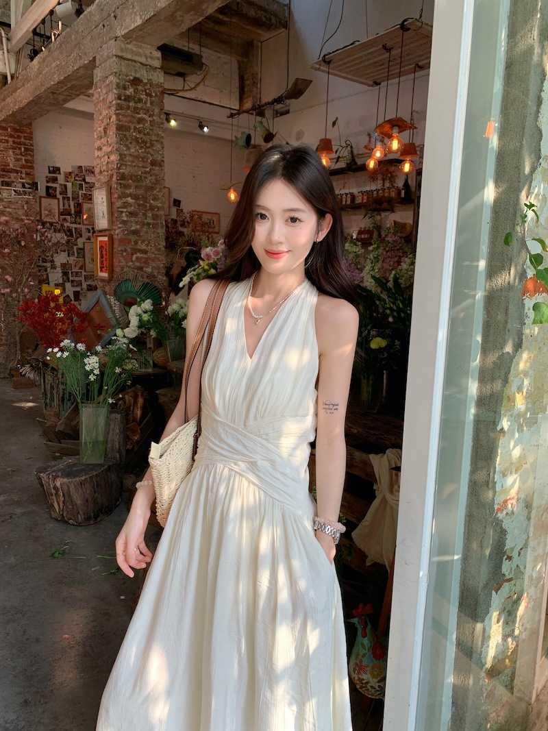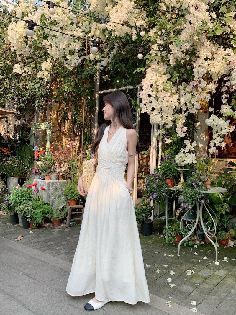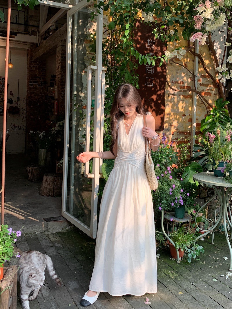 리얼 샷 2025 여름 새로운 한국 스타일 프랑스 딸 골드 디자인 느낌 매우 잘 보이는 민소매 허리 v-neck 원피스스토어 가기