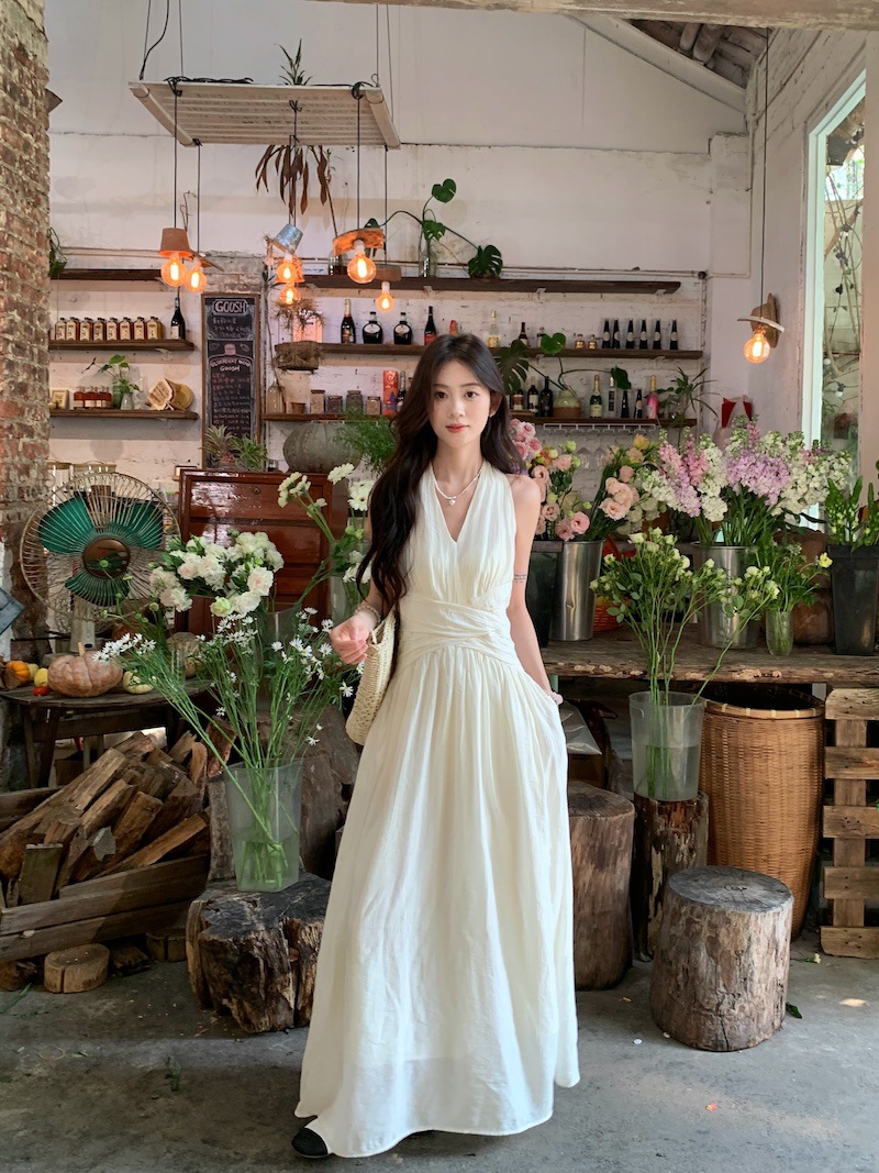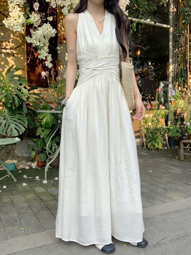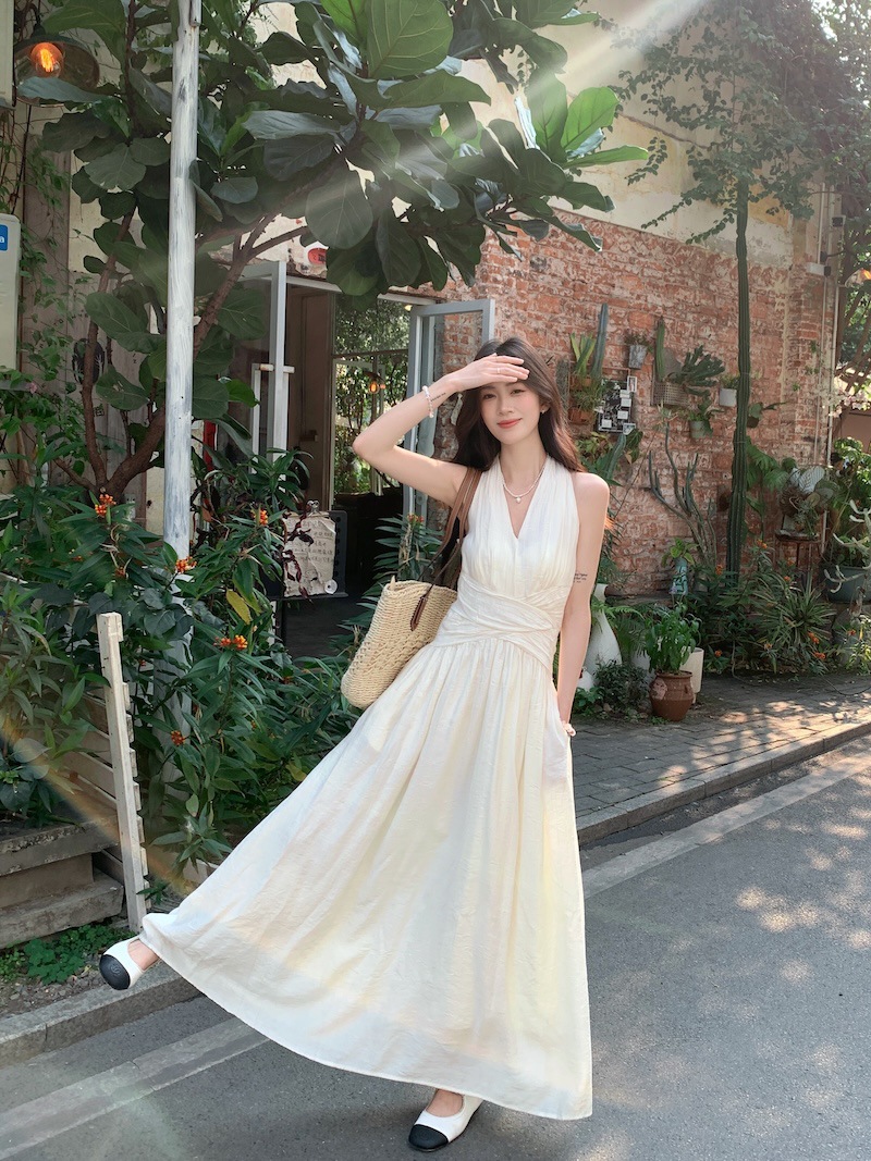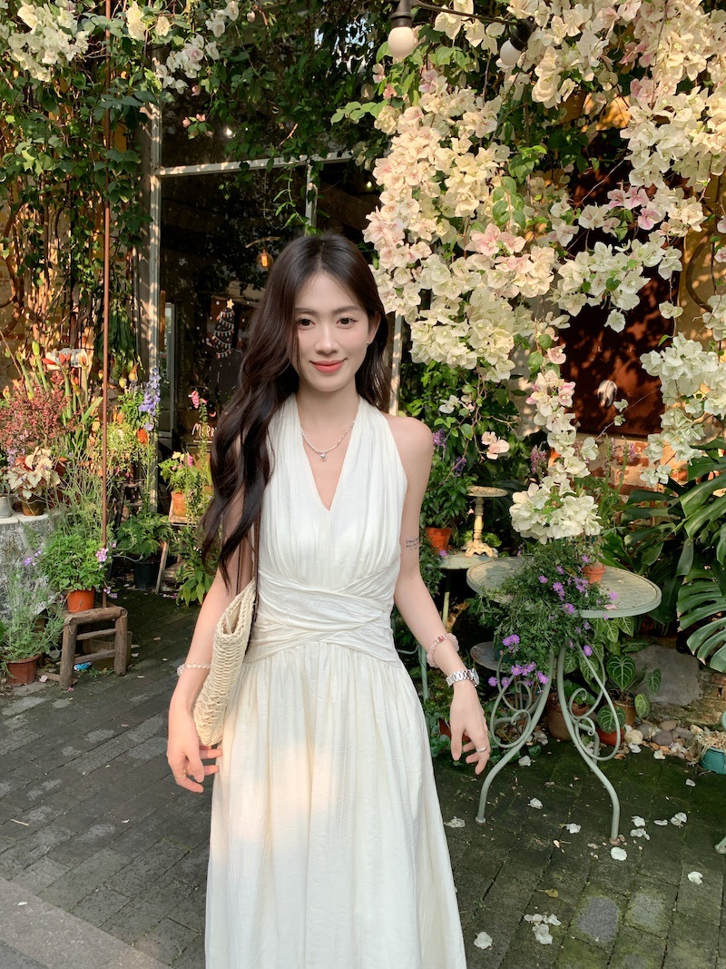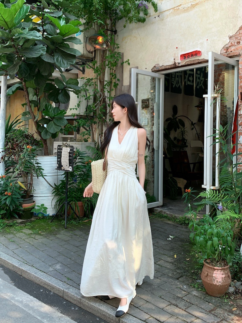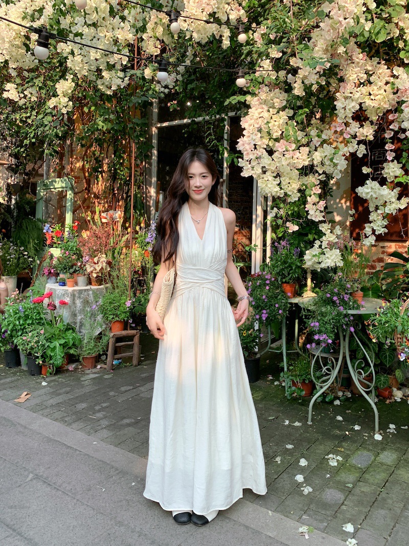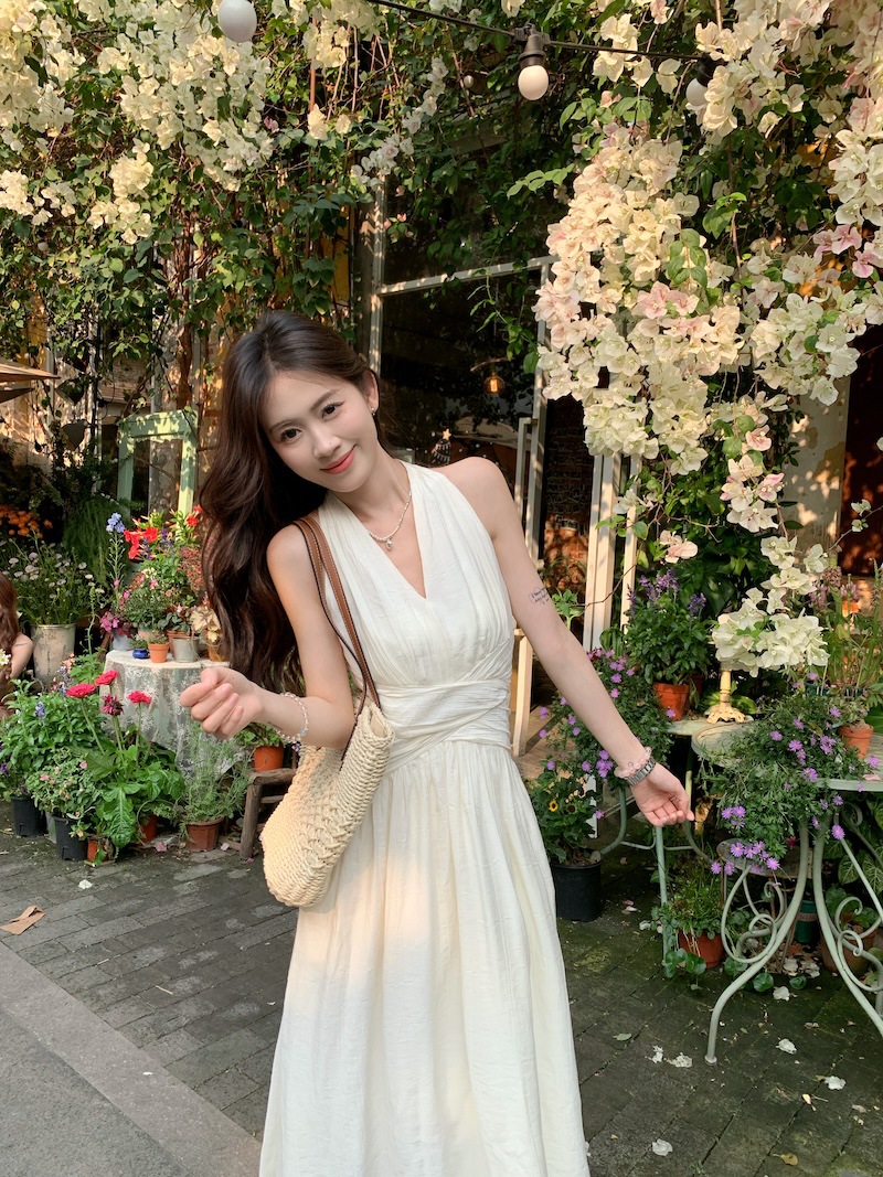 리얼 샷 2025 여름 새로운 한국 스타일 프랑스 딸 골드 디자인 느낌 매우 잘 보이는 민소매 허리 v-neck 원피스스토어 가기