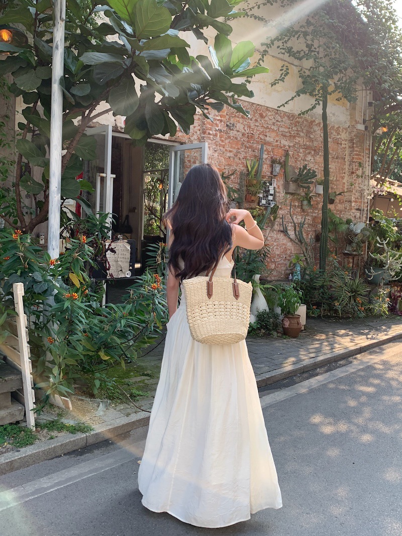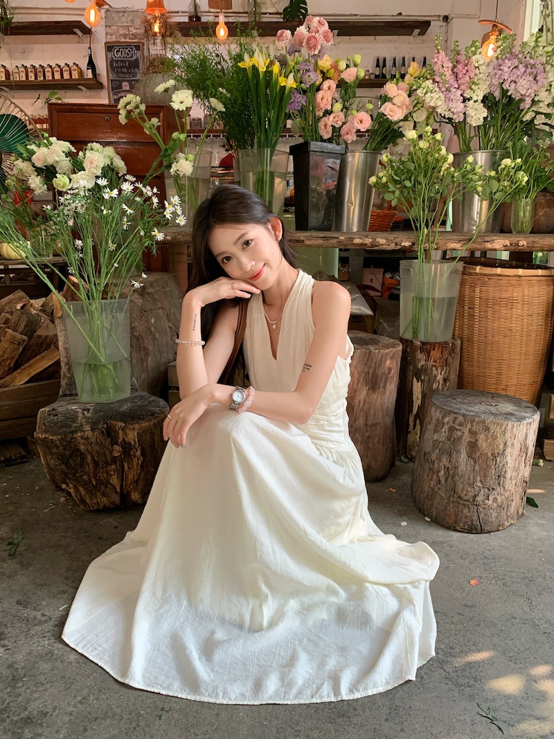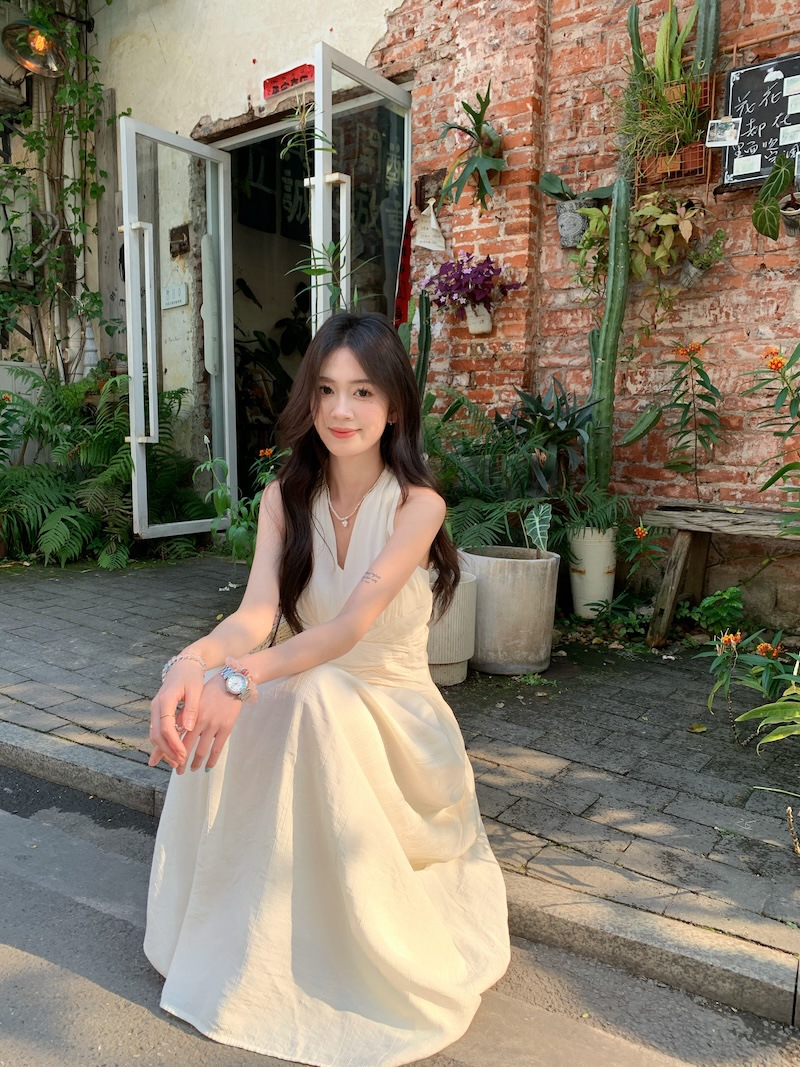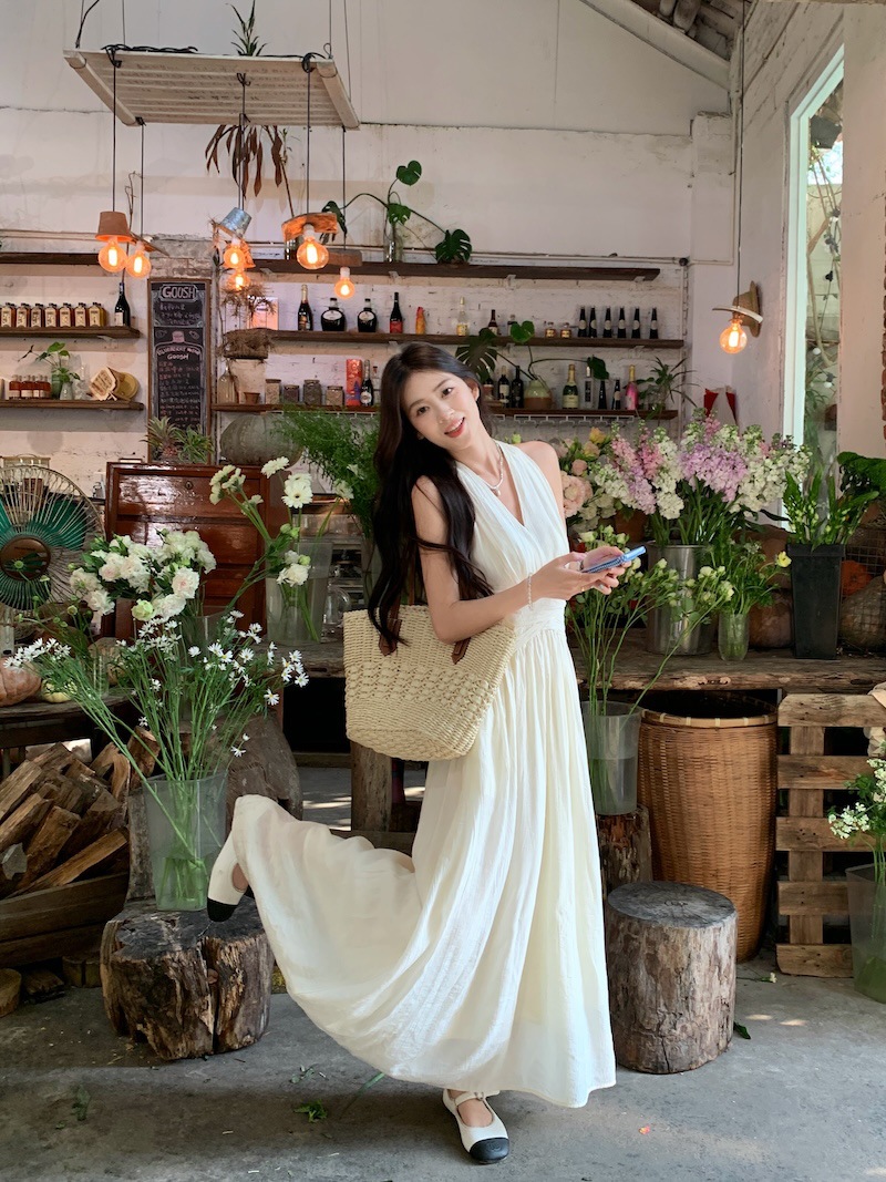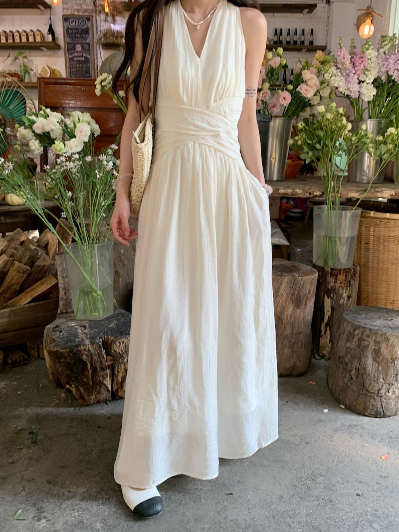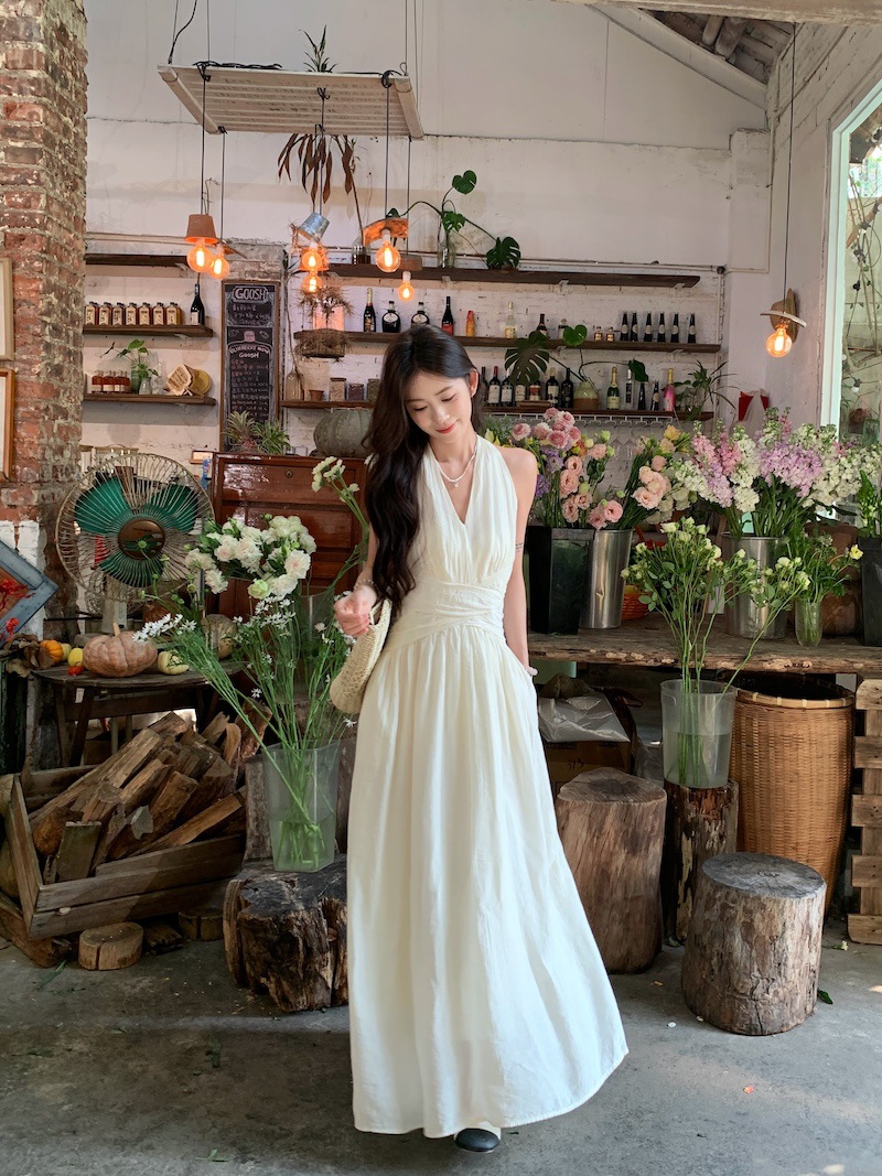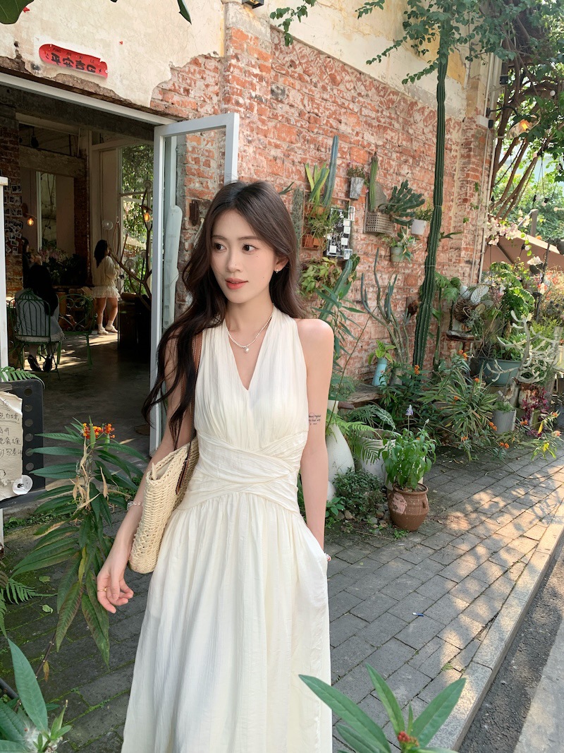 리얼 샷 2025 여름 새로운 한국 스타일 프랑스 딸 골드 디자인 느낌 매우 잘 보이는 민소매 허리 v-neck 원피스스토어 가기
