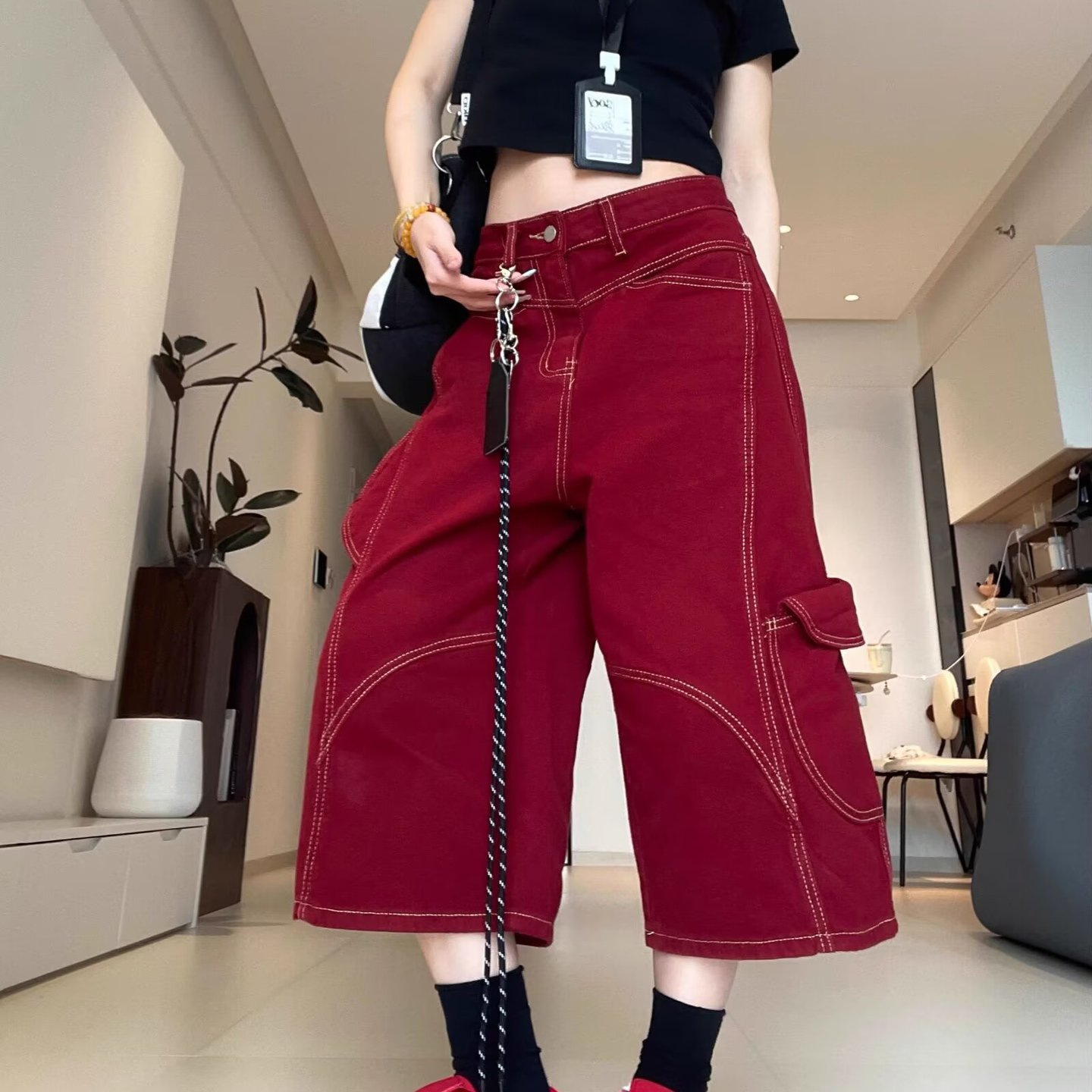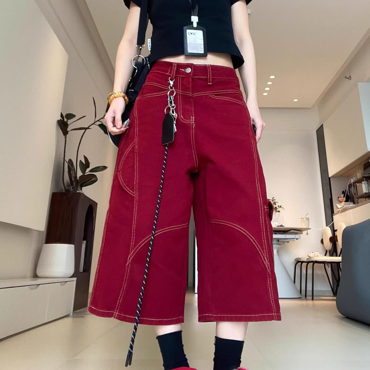 아메리칸 스타일 레트로 레드 카프리 팬츠 청바지 남성 여름 넓은 다리 느슨한 디자인 하이 스트리트 오픈 라인 툴링 청바지