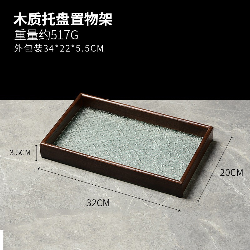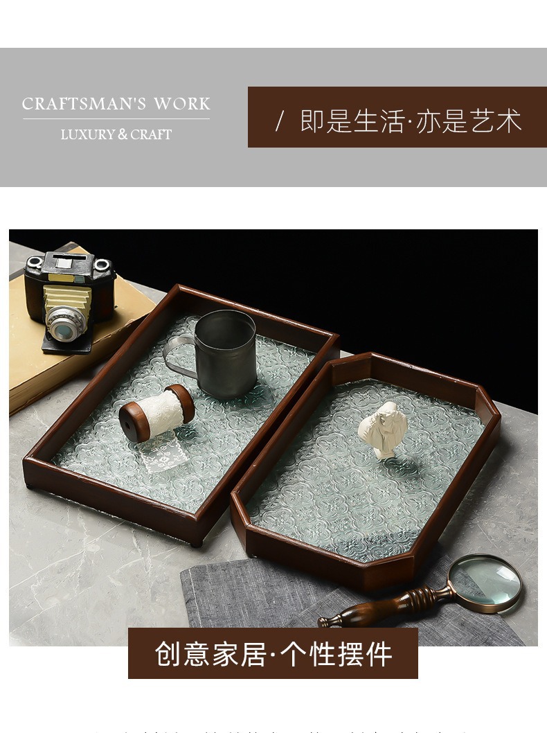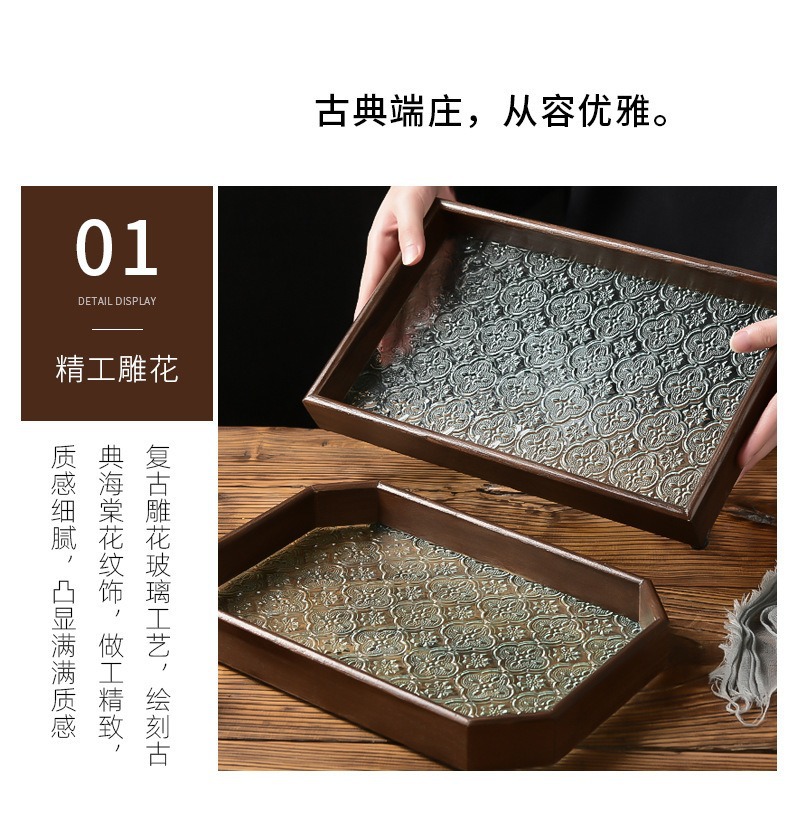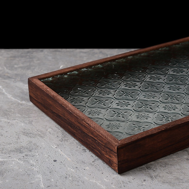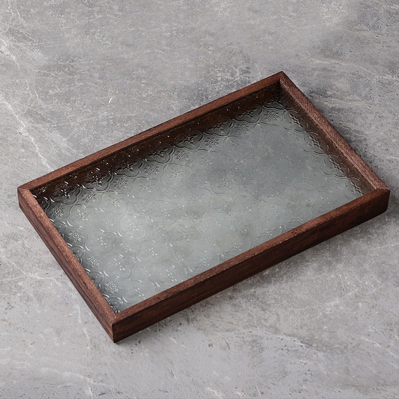 가정용 라이트 럭셔리 베고니아 양각 유리 트레이 호두 색상 직사각형 나무 차 트레이 두꺼운 차 컵 케이스