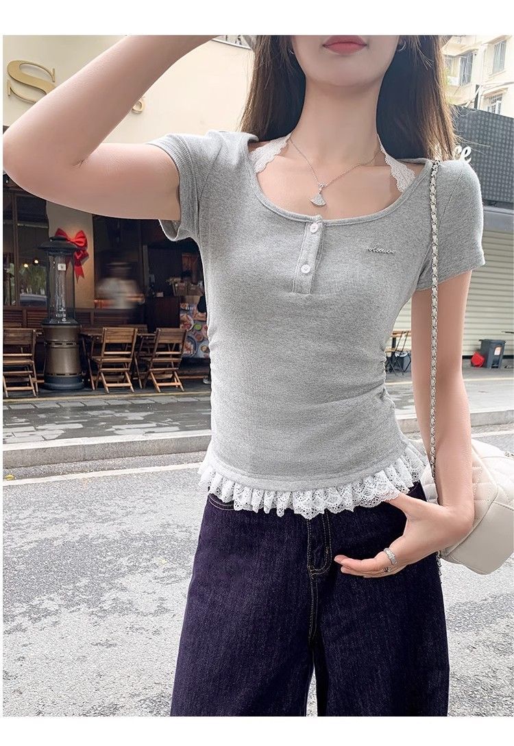 순수한 욕망 발레 스타일 버튼 짧은 소매 티셔츠 여성 여름 2025 새로운 허리 슬리밍 레이스 스티칭 넥 탑