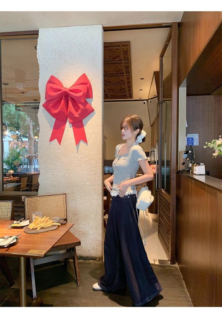 순수한 욕망 발레 스타일 버튼 짧은 소매 티셔츠 여성 여름 2025 새로운 허리 슬리밍 레이스 스티칭 넥 탑스토어 가기