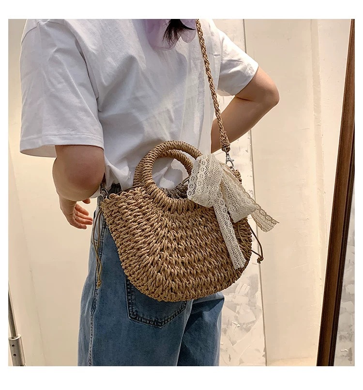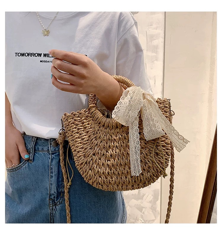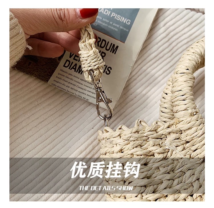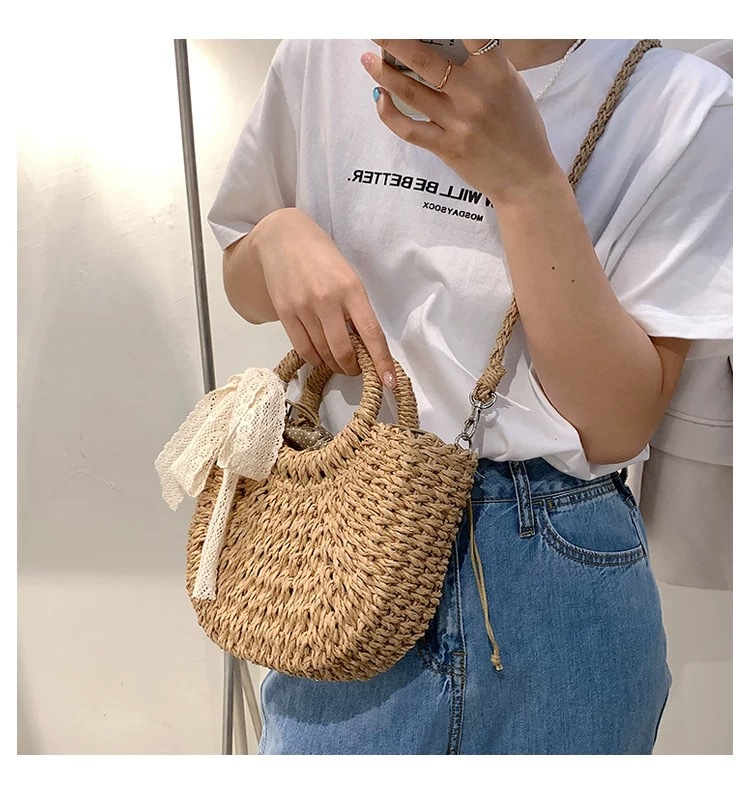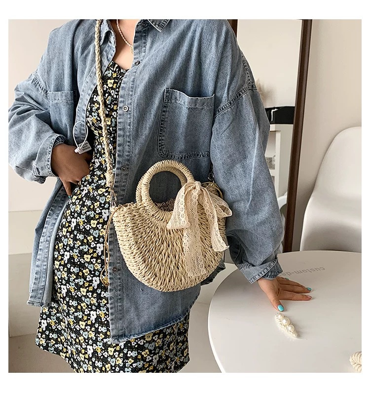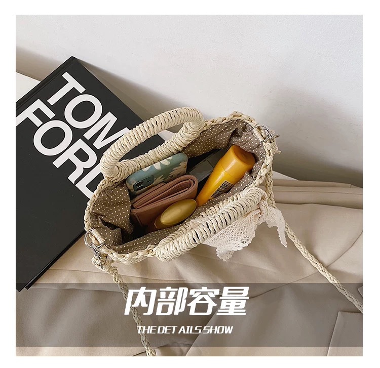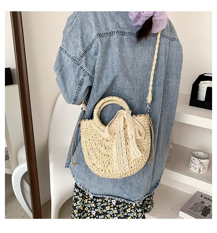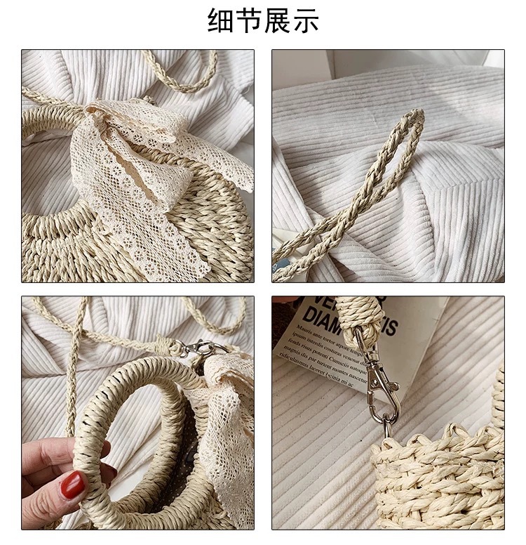재고 도매 작은 둥근 양동이 밀짚 가방 위안 버킷 종이 로프 손으로 짠 가방 레이스 핸드백 비치 백스토어 가기