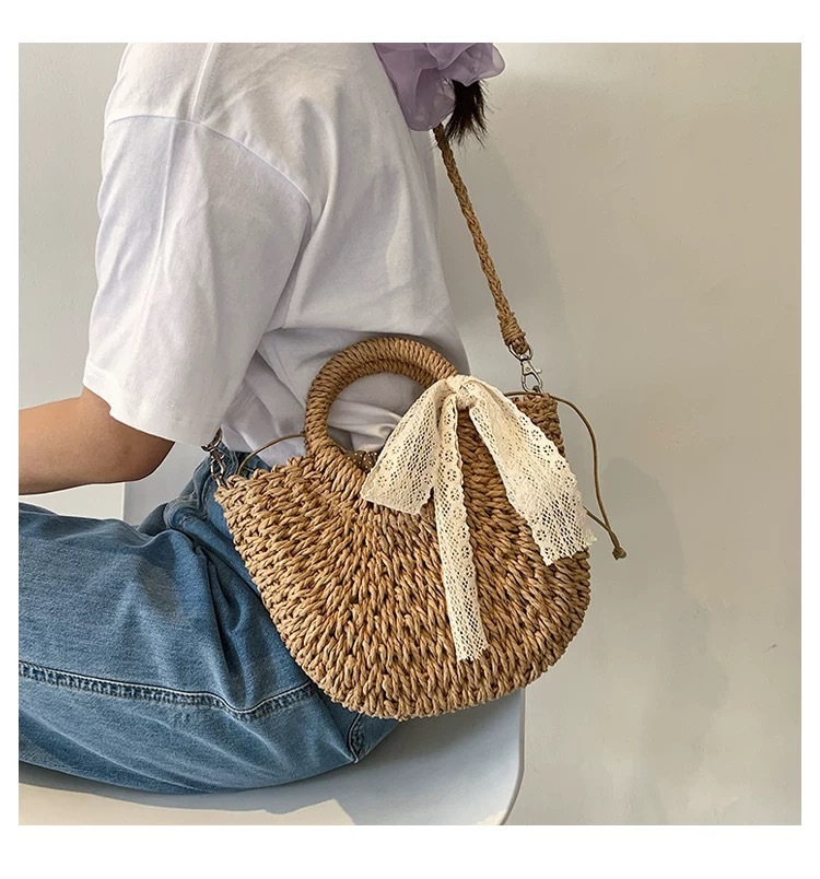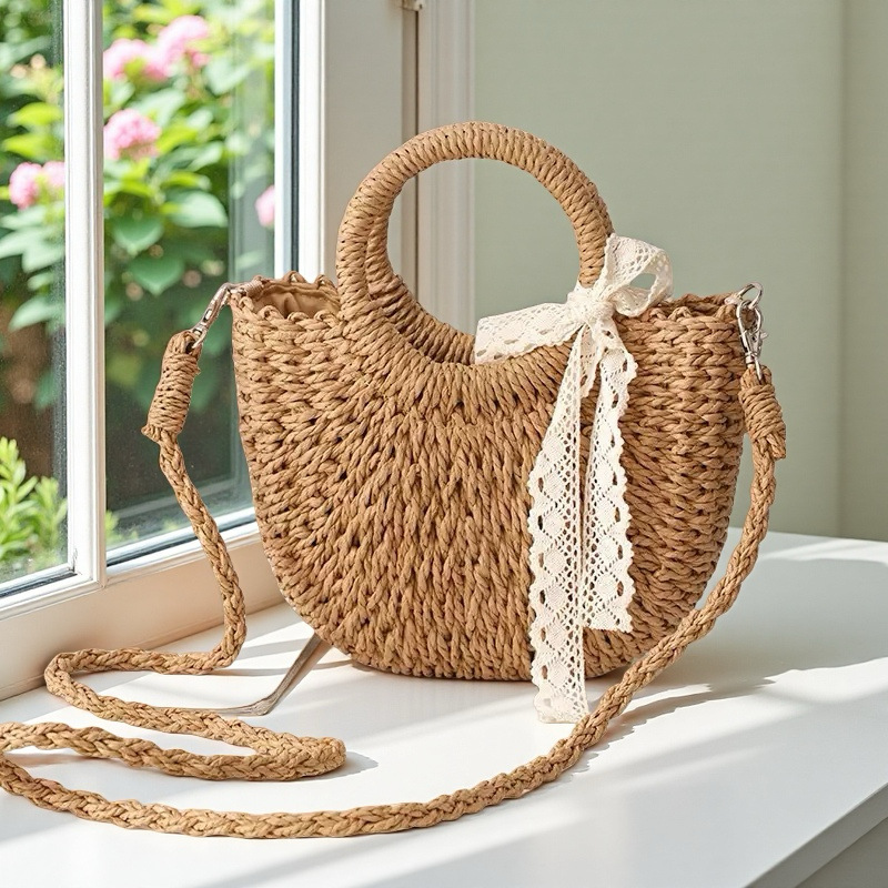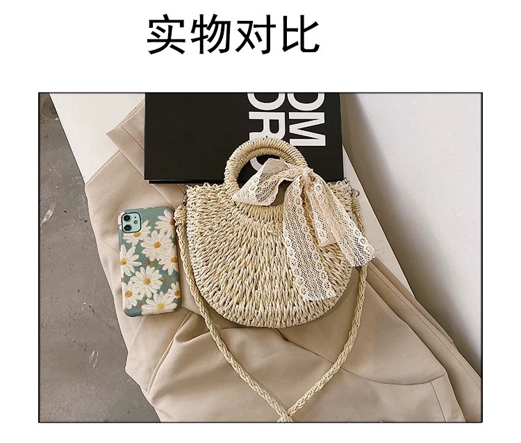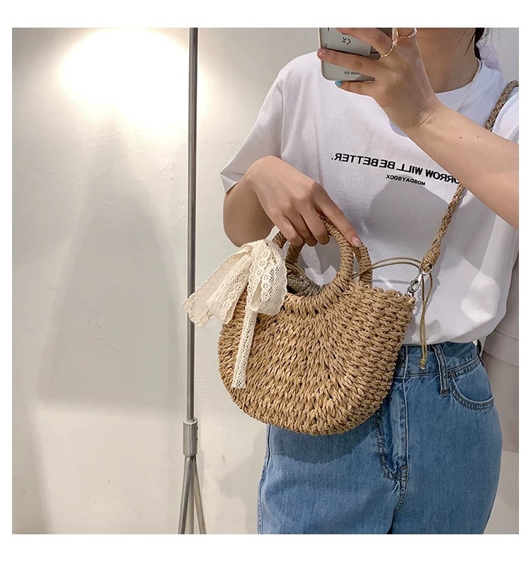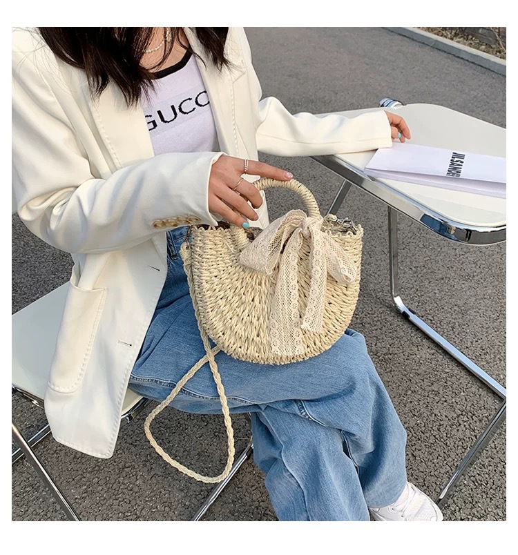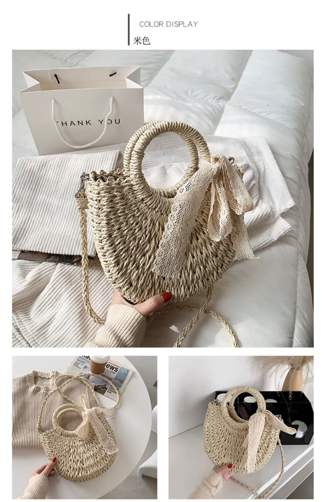 재고 도매 작은 둥근 양동이 밀짚 가방 위안 버킷 종이 로프 손으로 짠 가방 레이스 핸드백 비치 백스토어 가기