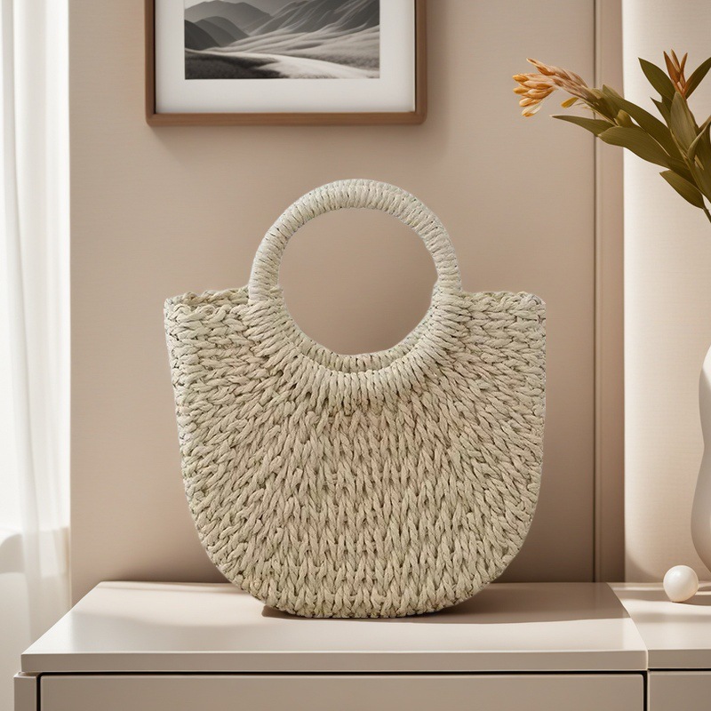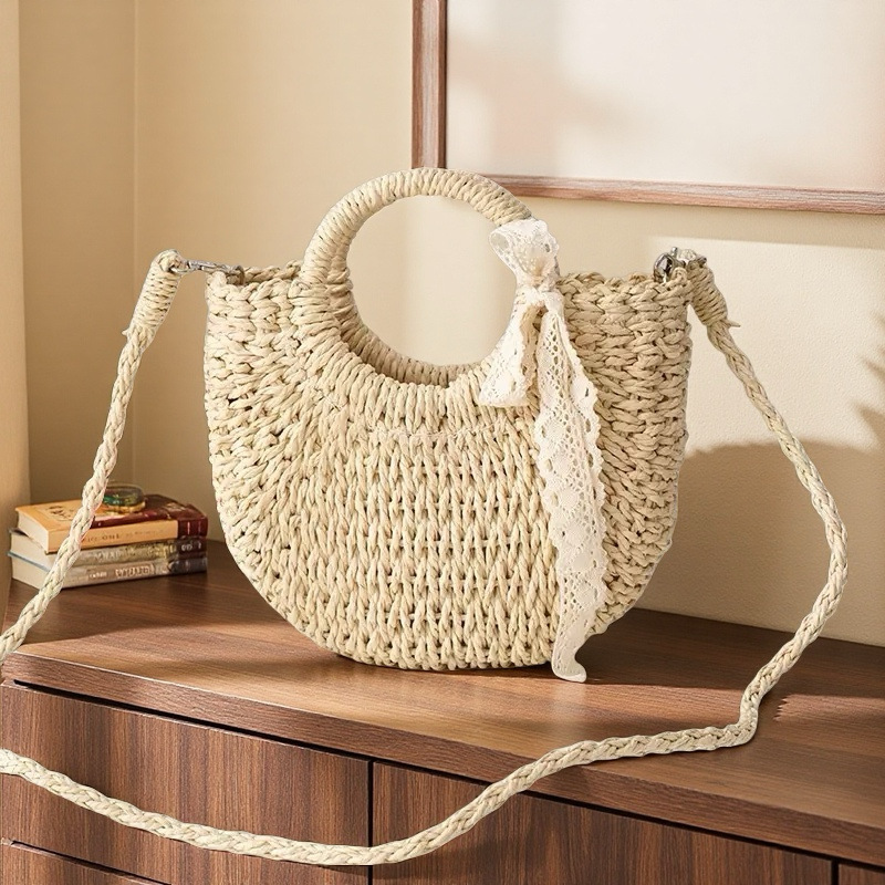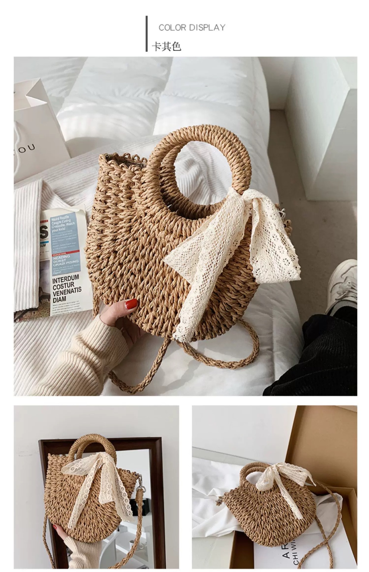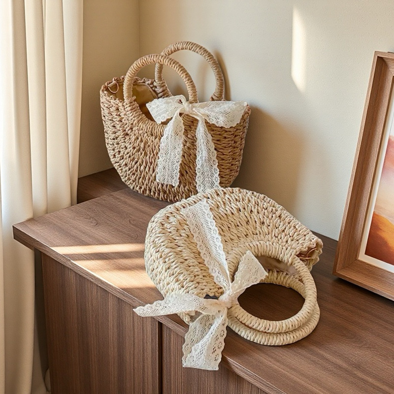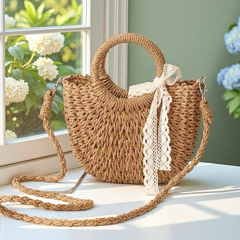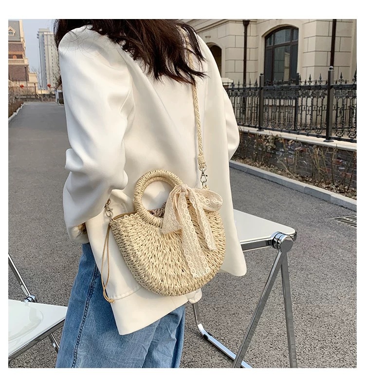 재고 도매 작은 둥근 양동이 밀짚 가방 위안 버킷 종이 로프 손으로 짠 가방 레이스 핸드백 비치 백스토어 가기