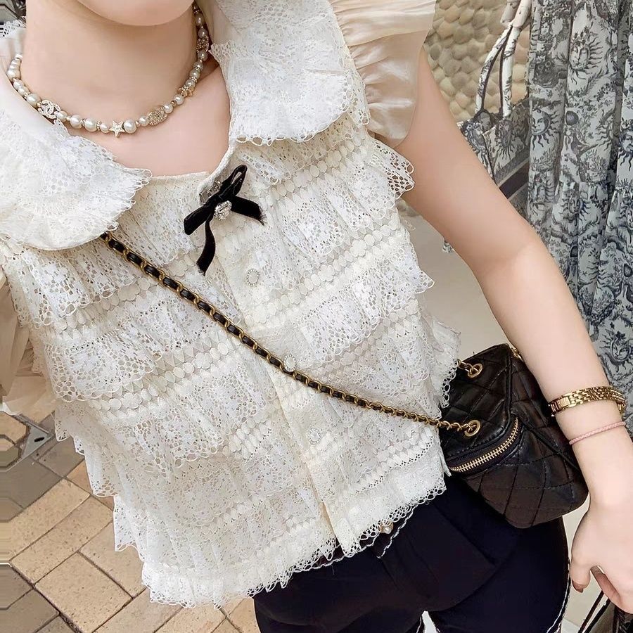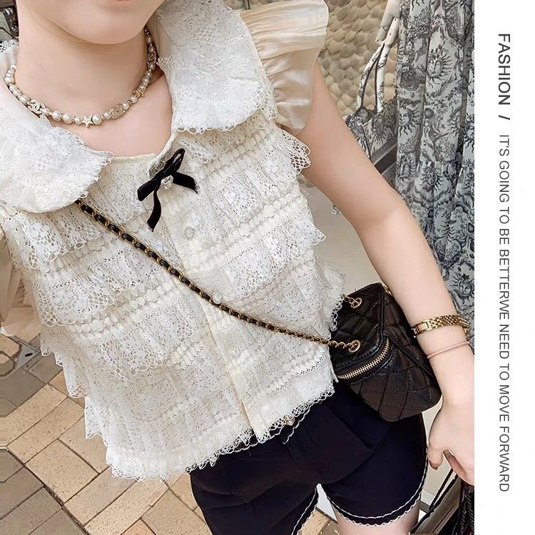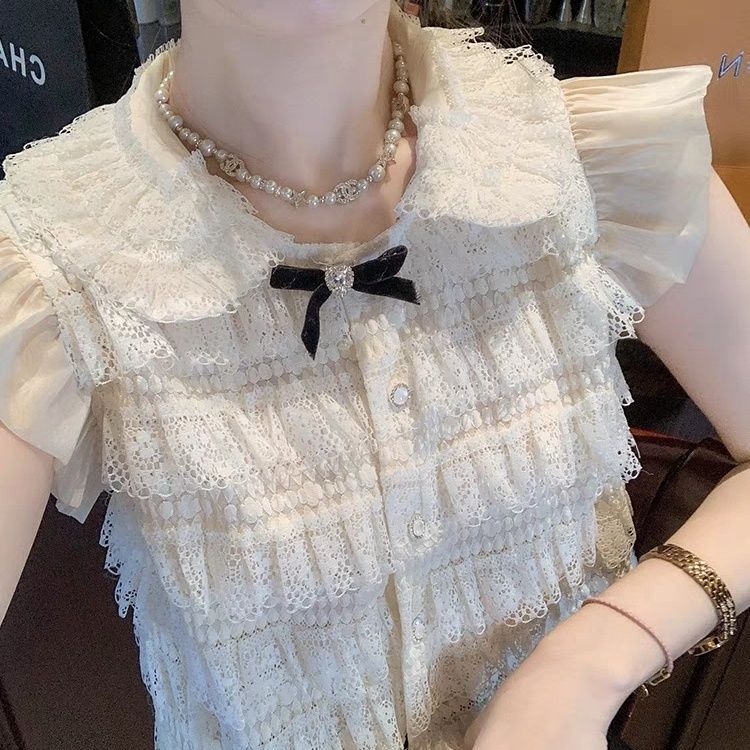샤넬 스타일 인형 칼라 레이스 셔츠 여자 2025 년 여름 뉴 쉬폰 티셔츠 쇼트탑 스위트 패션 올매치