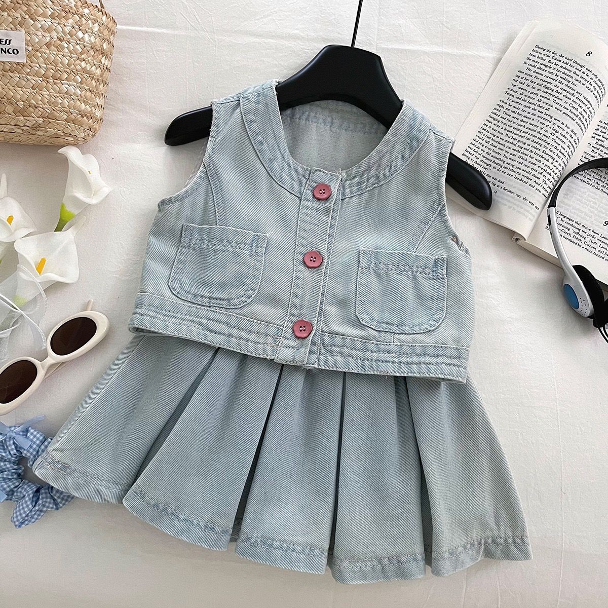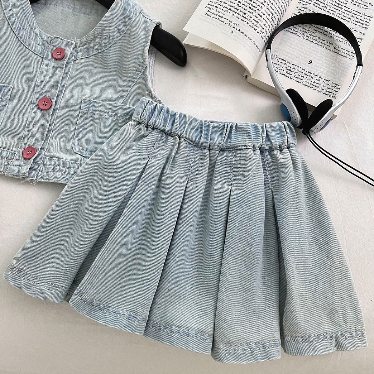 여자 세트 여름 새 2025 데님 조끼 최고 주름 치마 여성 아기 한국 캐주얼 투피스 세트