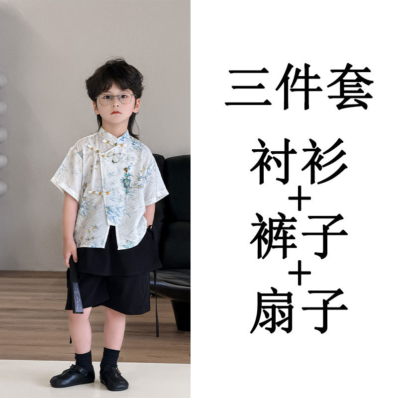 2025 새로운 소년 한푸 여름 세트 골동품 여름 탕 셔츠 어린이 중국 스타일 머리카락 세대스토어 가기