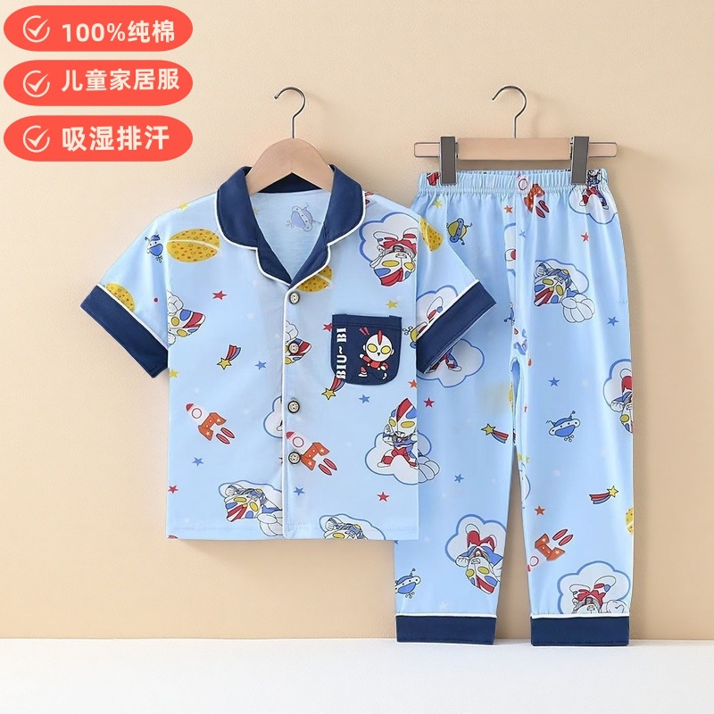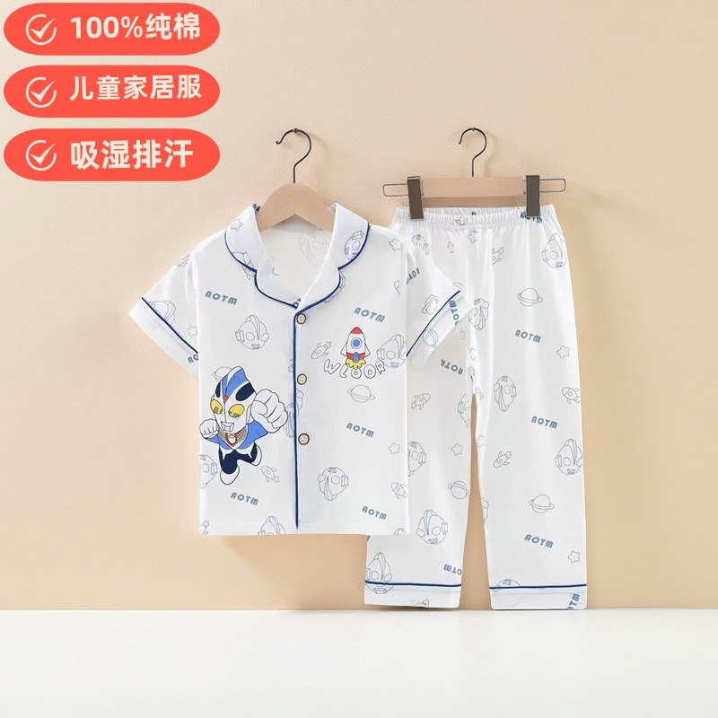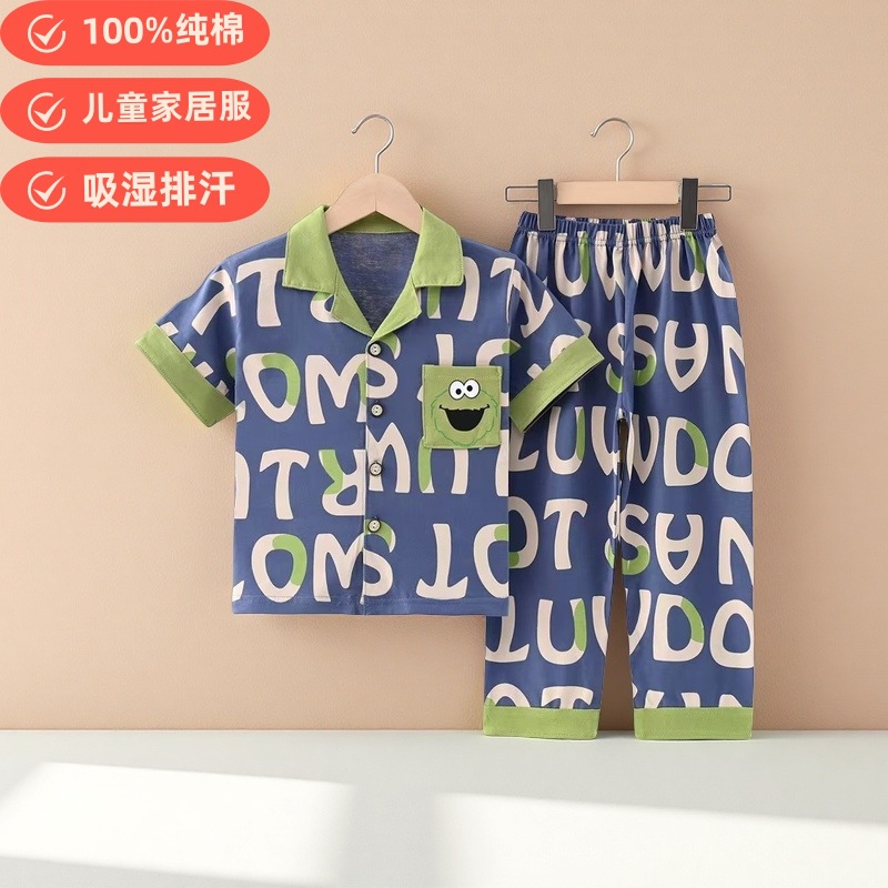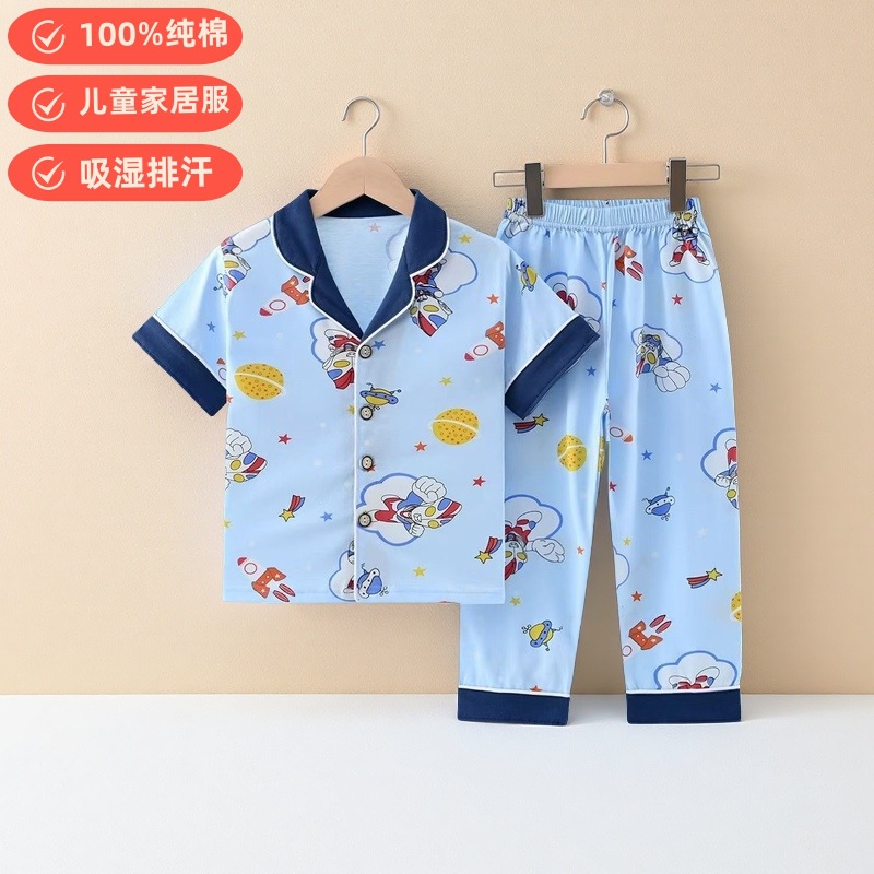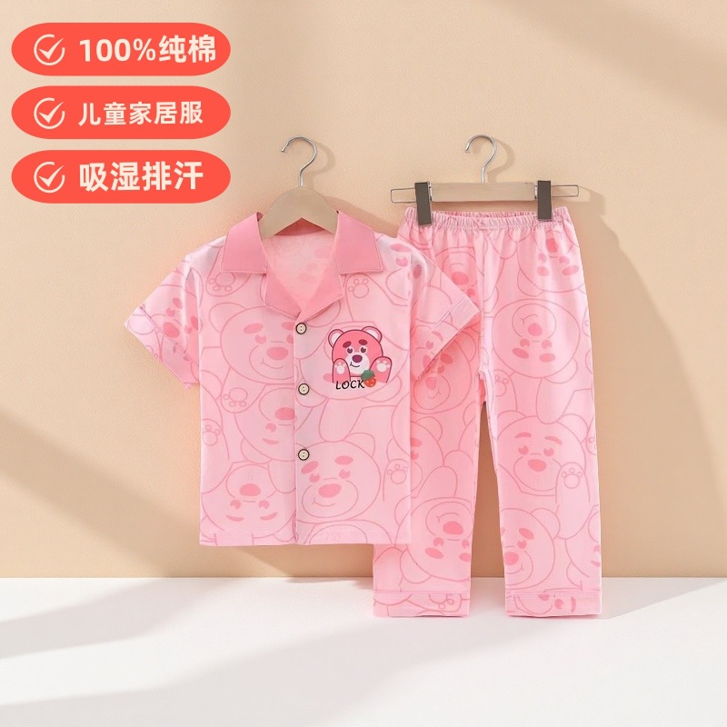 여름 반팔 바지 어린이 파자마 얇은 코튼 클래스 소년 소녀를위한 홈 의류 만화 에어컨 옷스토어 가기