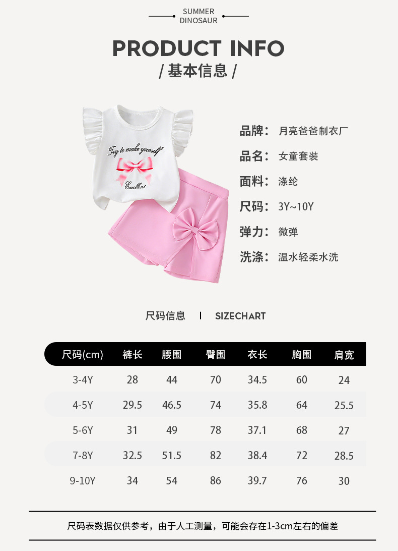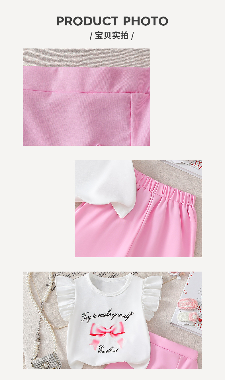 대외 무역 소녀 반바지 세트 여름 비행 소매 화이트 탑 활 핑크 반바지 어린이 투피스 세트