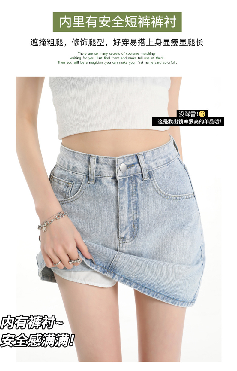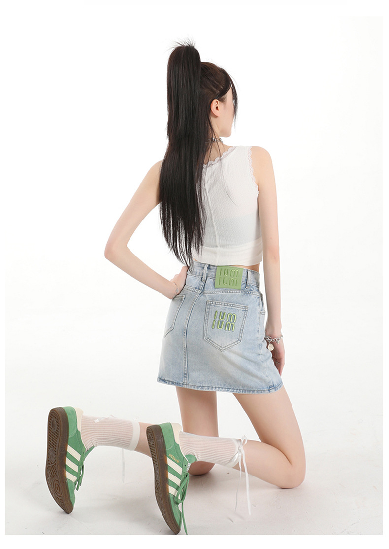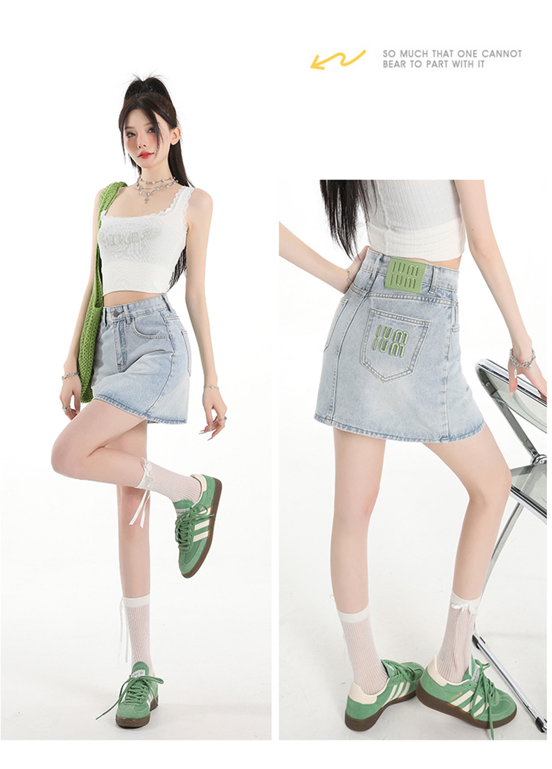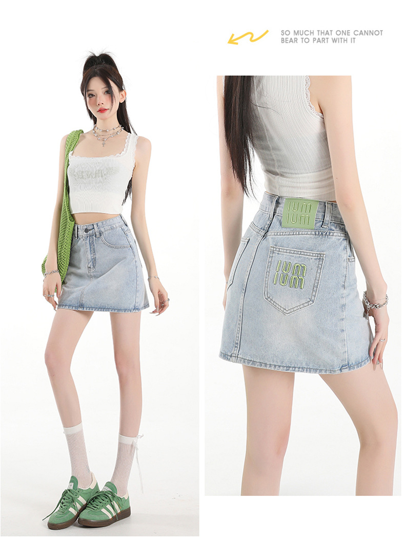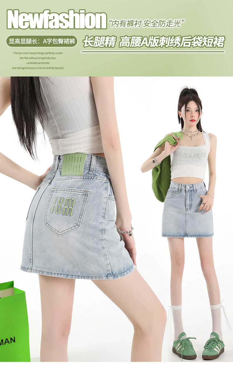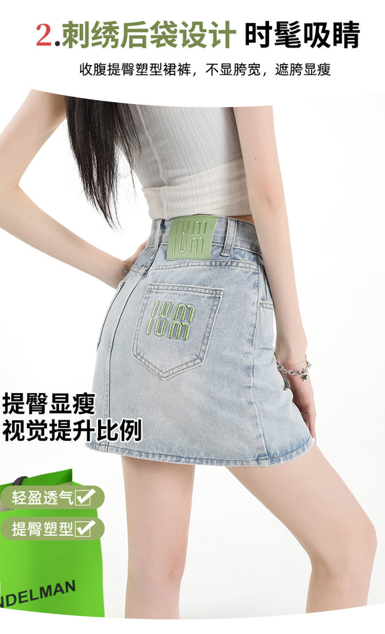 여성을위한 자수 데님 스커트 2025 여름 새로운 스타일 노출 방지 다목적 a 라인 안감 슬리밍 힙 스커트 핫 소녀