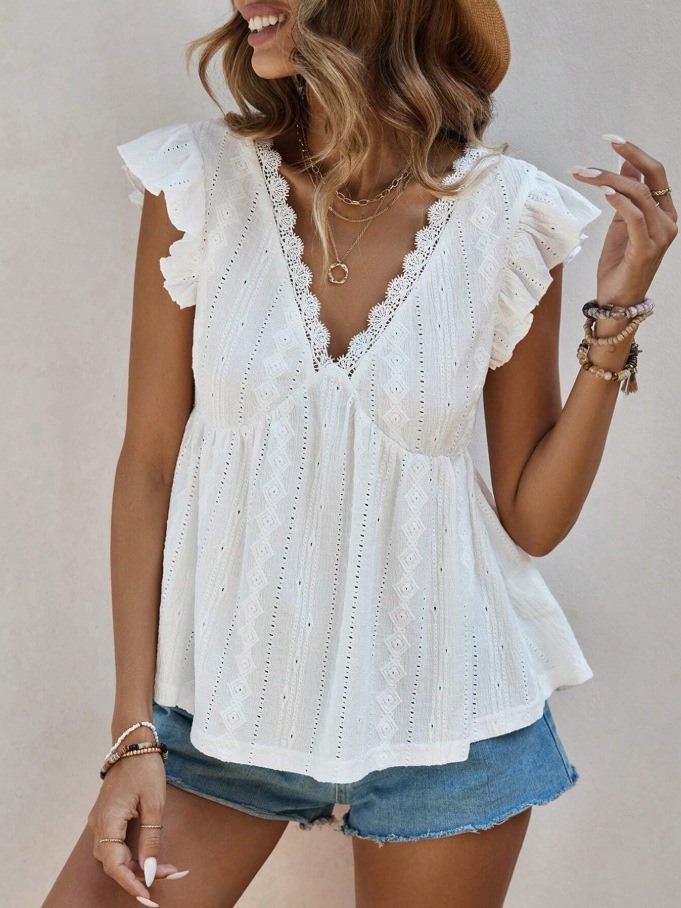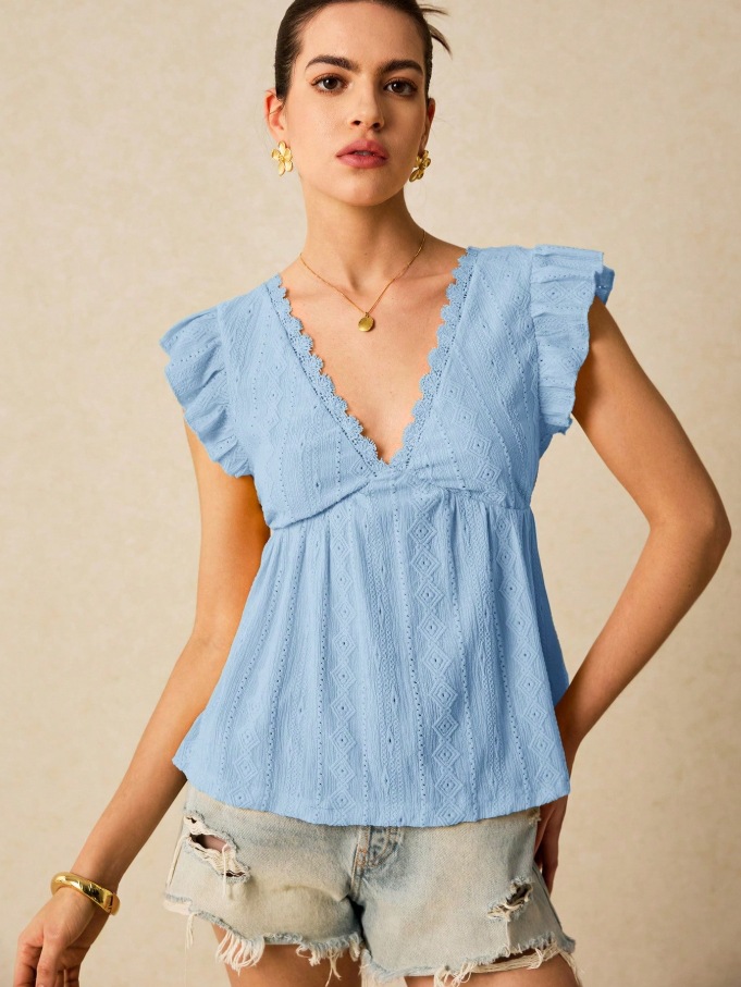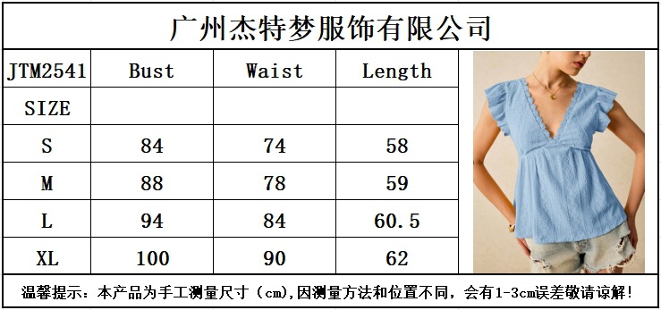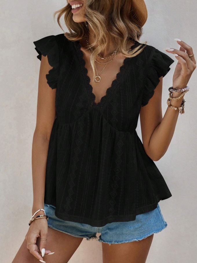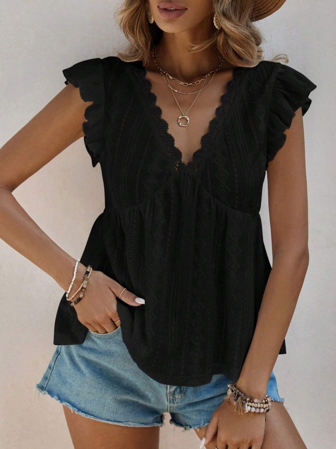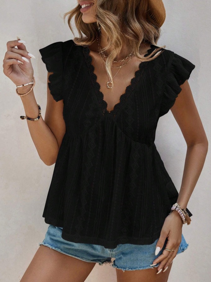 2025 유럽과 미국 국경 여성 의류 아마존 봄과 여름 새로운 패션 속이 빈 V 넥 연꽃 잎 짧은 소매 레이스 티셔츠 탑