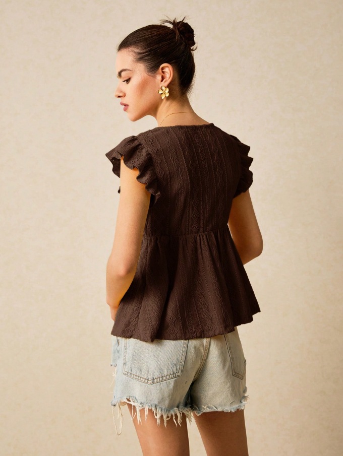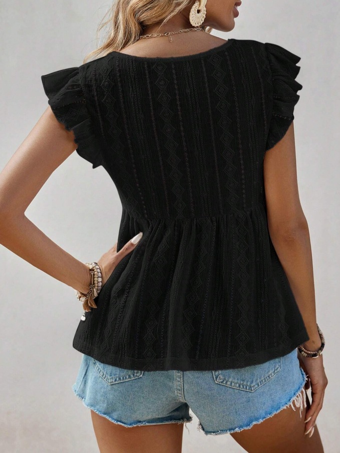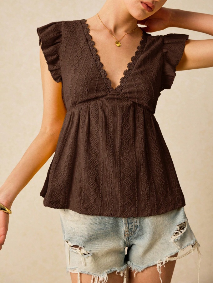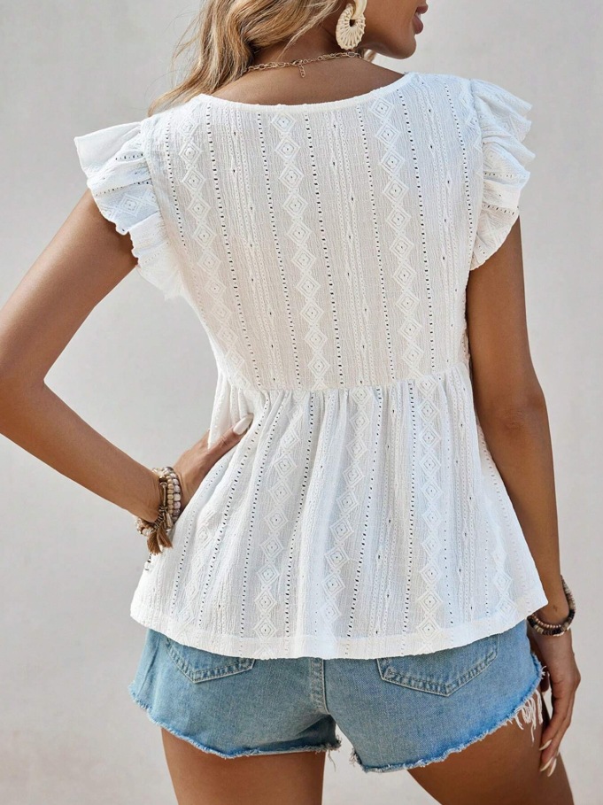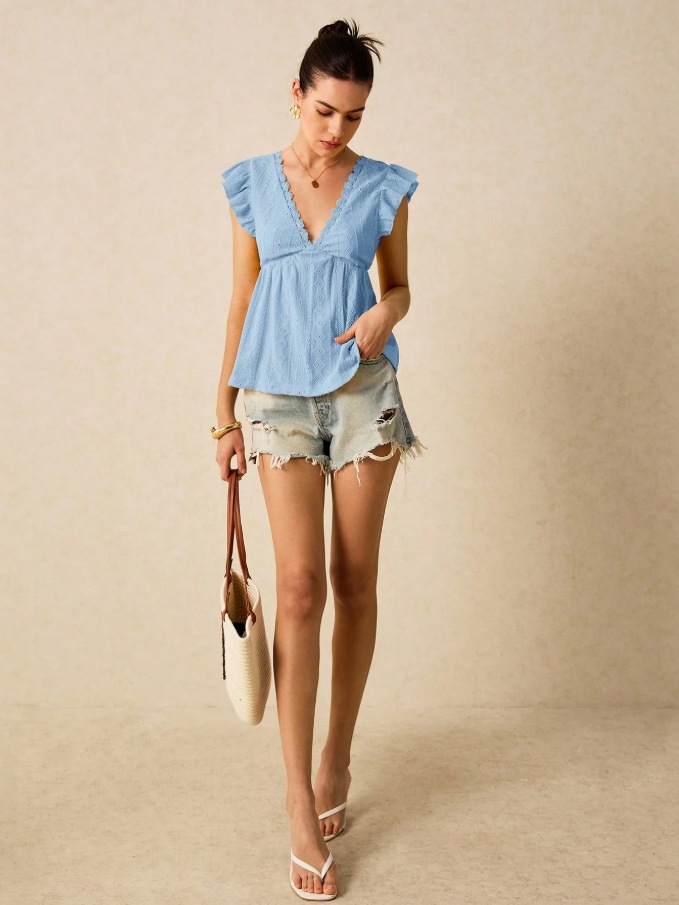 2025 유럽과 미국 국경 여성 의류 아마존 봄과 여름 새로운 패션 속이 빈 V 넥 연꽃 잎 짧은 소매 레이스 티셔츠 탑