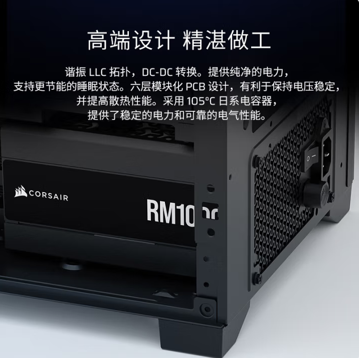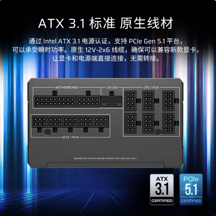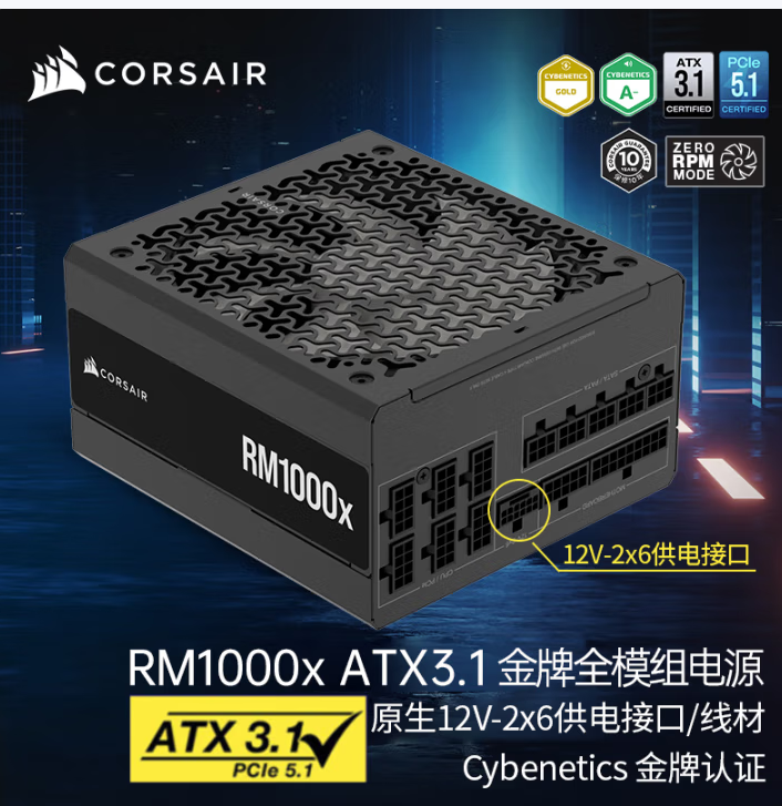 美商海盗船(USCORSAIR)RMx系列 台式机主机电脑电源1000W认证 金牌认证全模组16pin显卡线原生12V-2×6 RM1000x ATX3.1认证电源