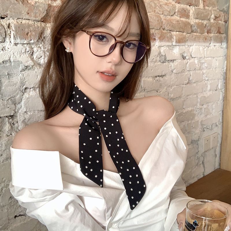 프랑스 스타일 폴로 도트 화이트 실크 스카프 목 헤어 밴드 넥타이 여자 2025 봄 여름 긴 스카프 올 매치 리본 작은 넥타이