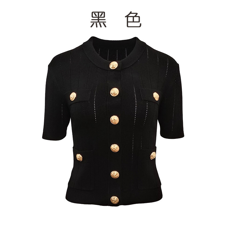 2025 여름 프랑스 여성 신상 스웨터 고급 금속 버클 반팔 니트 가디건 아이스 실크 탑 여성