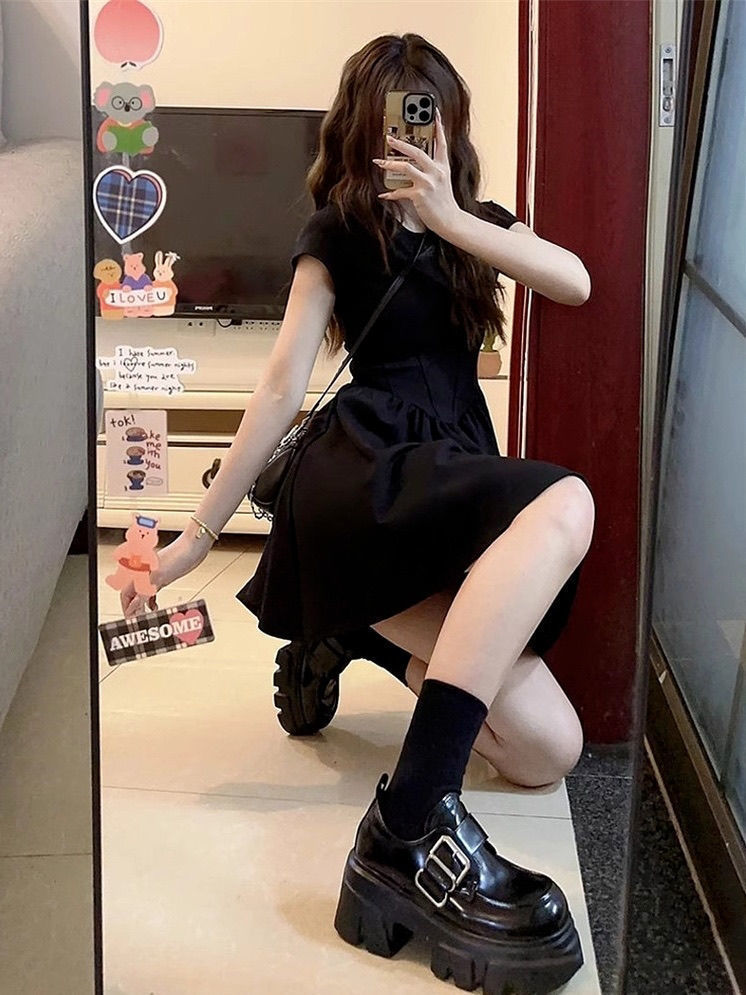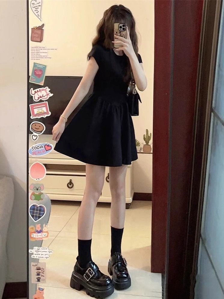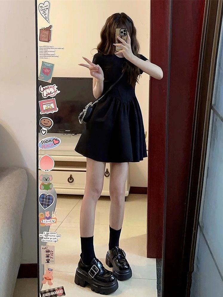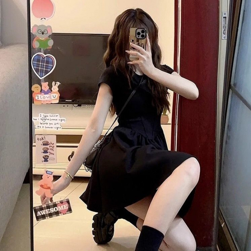 프랑스 헵번 스타일 블랙 원피스 어린이 여름 2025 새로운 도착 작은 검은 치마 타이트 허리 슬리밍 스커트스토어 가기