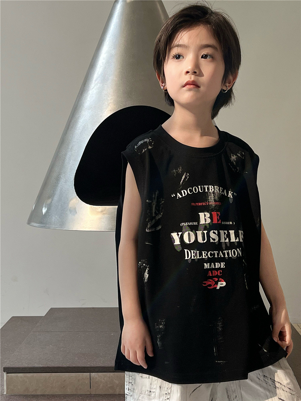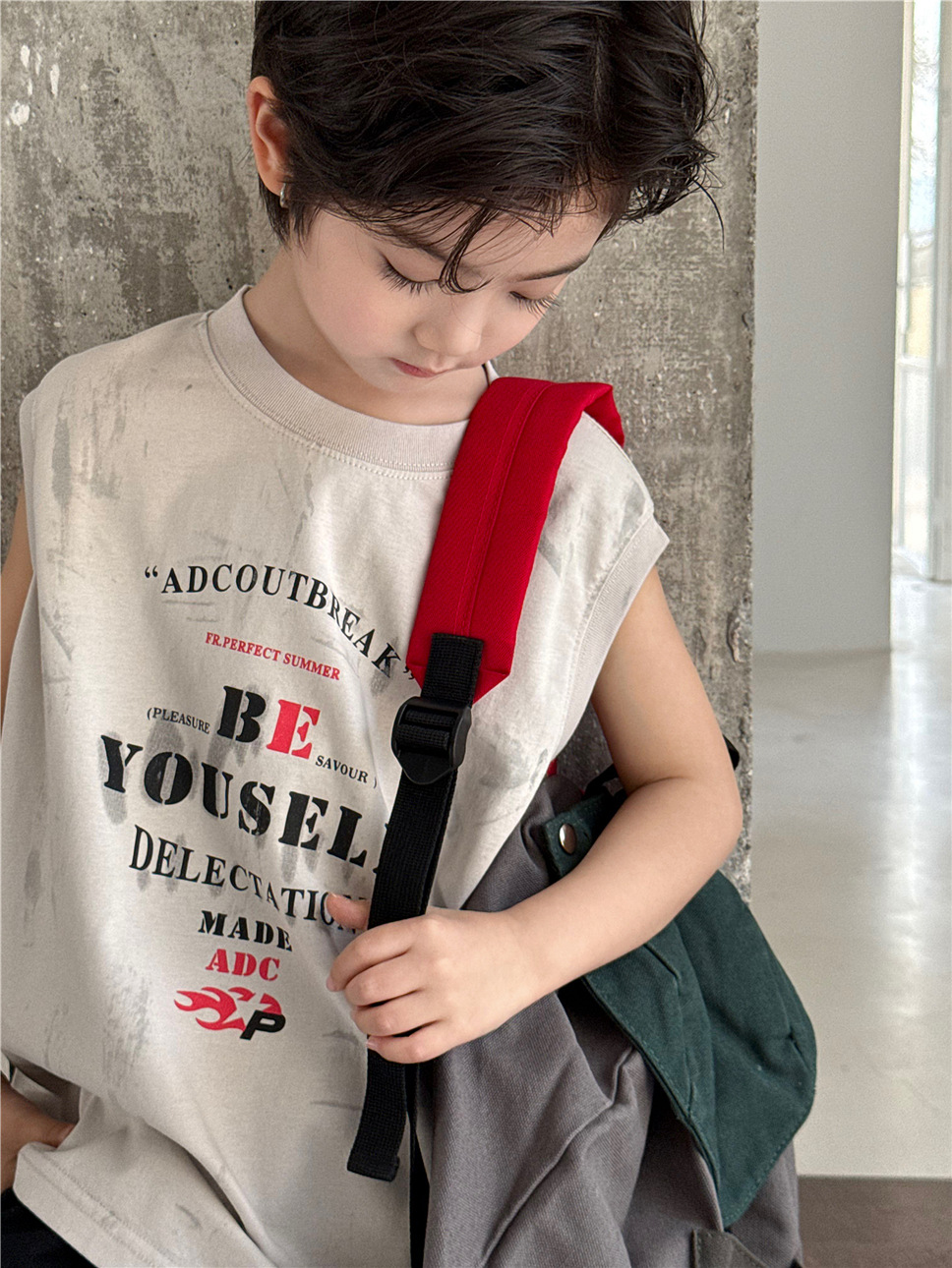 2025 년 여름 어린이 조끼 한국 빈티지 손으로 그린 더러운 오래된 편지 스레드 소매 민소매 소년 소녀 용 티셔츠스토어 가기