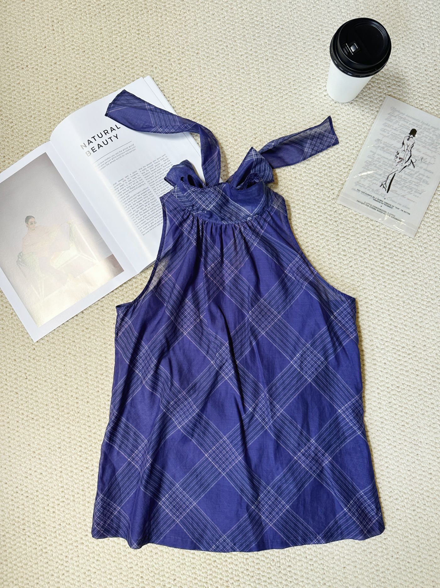 재고 있음/오타쿠 소녀 같은 스타일의 파란색과 보라색 격자 무늬 스탠드 칼라 접이식 리본 민소매 셔츠스토어 가기
