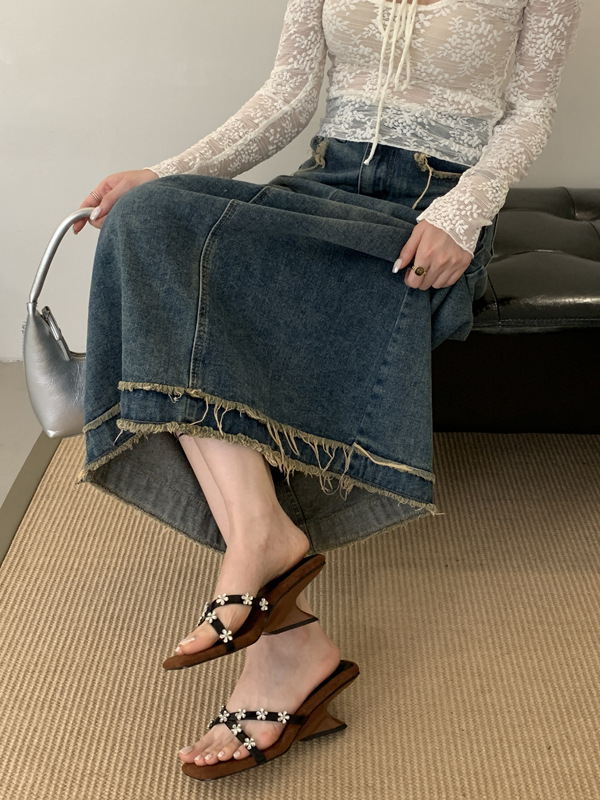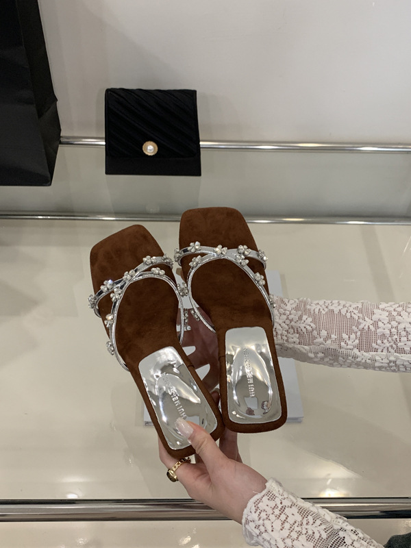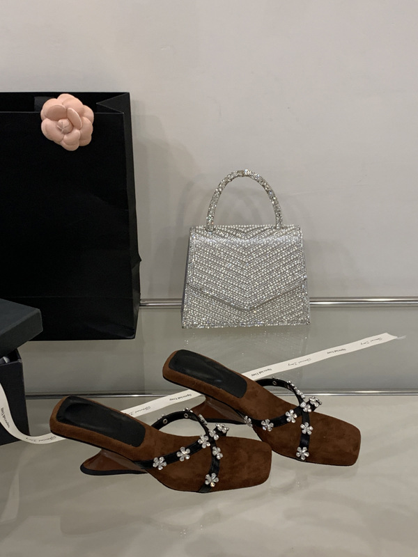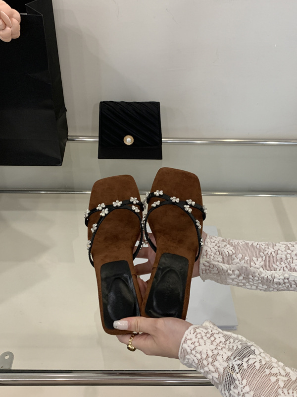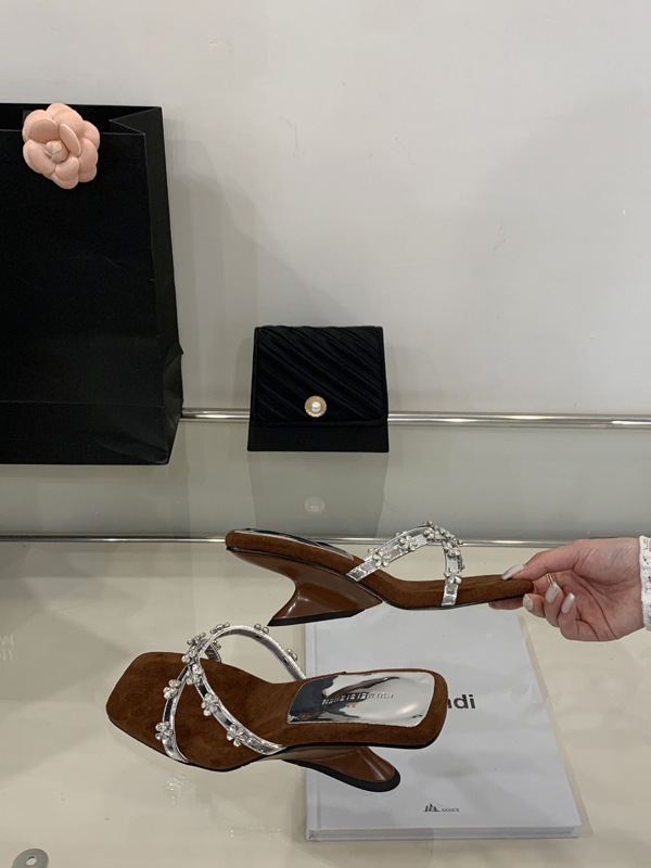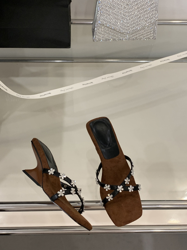 여성을 위한 아름다운 라인스톤 샌들 2025 신상 여름 아우터 하프 드래그 특별한 모양의 힐 프렌치 하이힐 웨지 샌들스토어 가기