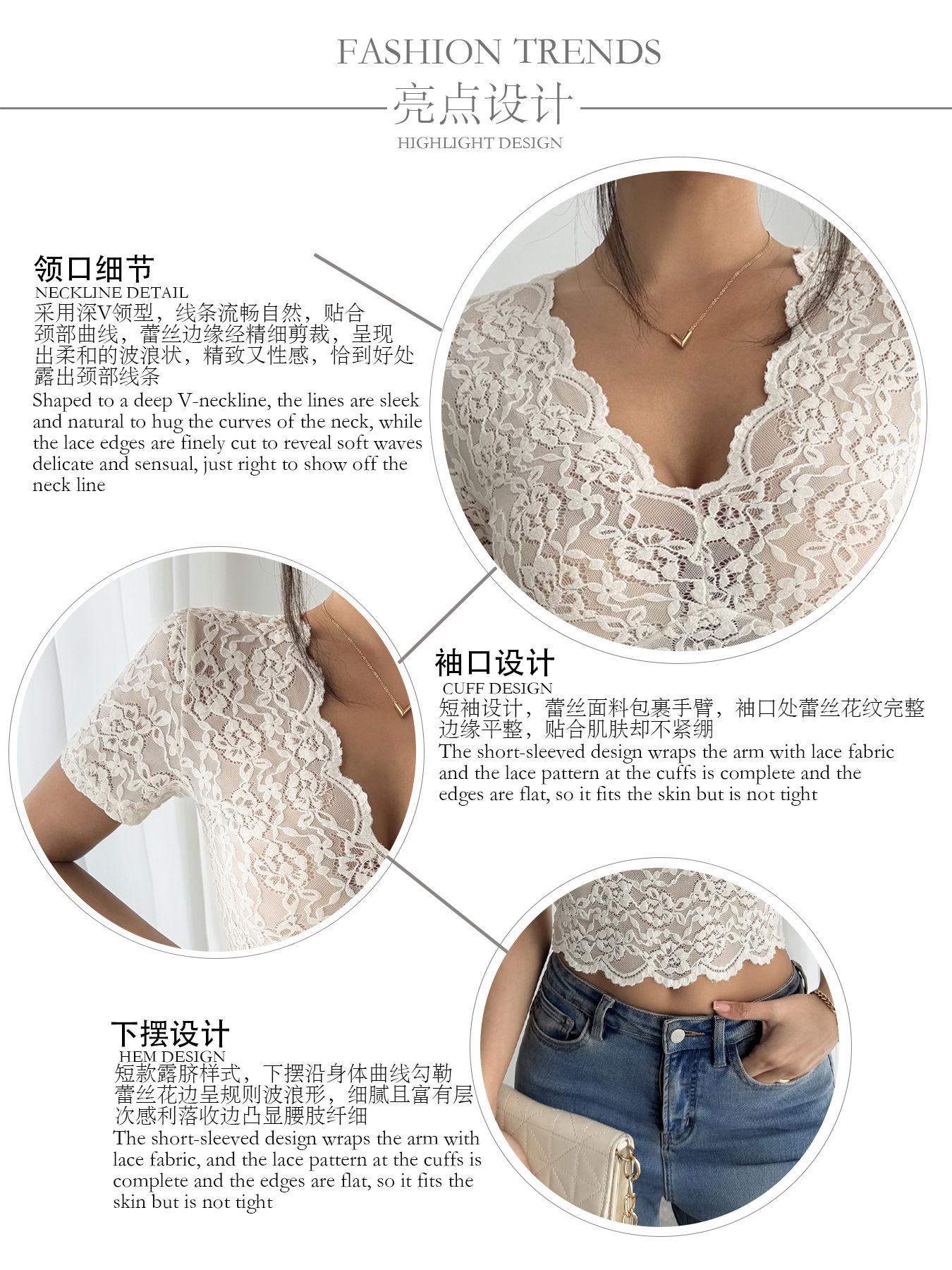 유럽과 미국의 국경 2025 여름 새로운 섹시한 레이스 V-넥 티셔츠 여성용 슬림 슬리밍 짧은 스파이스 걸 탑스토어 가기