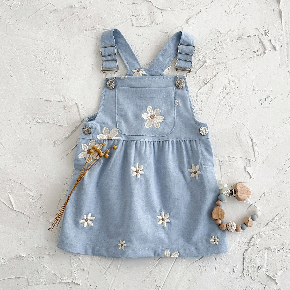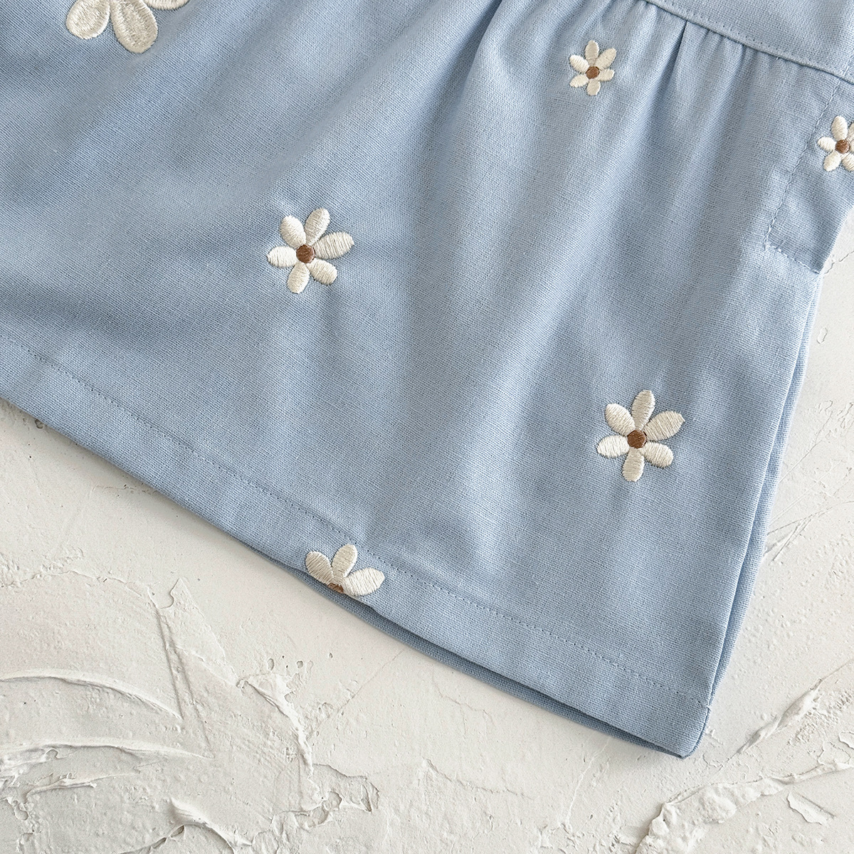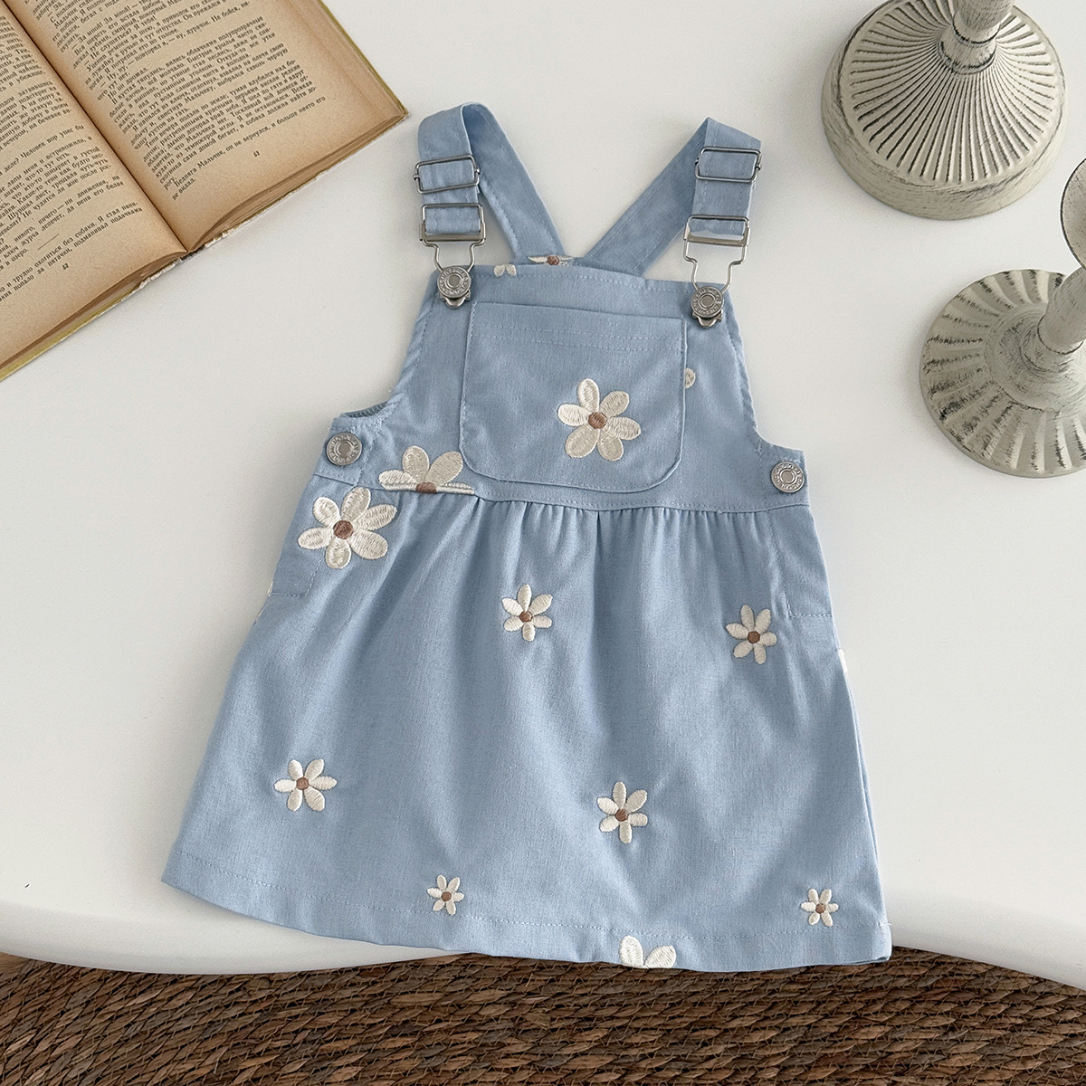 2025 여름 귀여운 꽃 자수 스트랩 원피스 블루 프린세스 스타일 느슨한 소녀 편안한 원피스