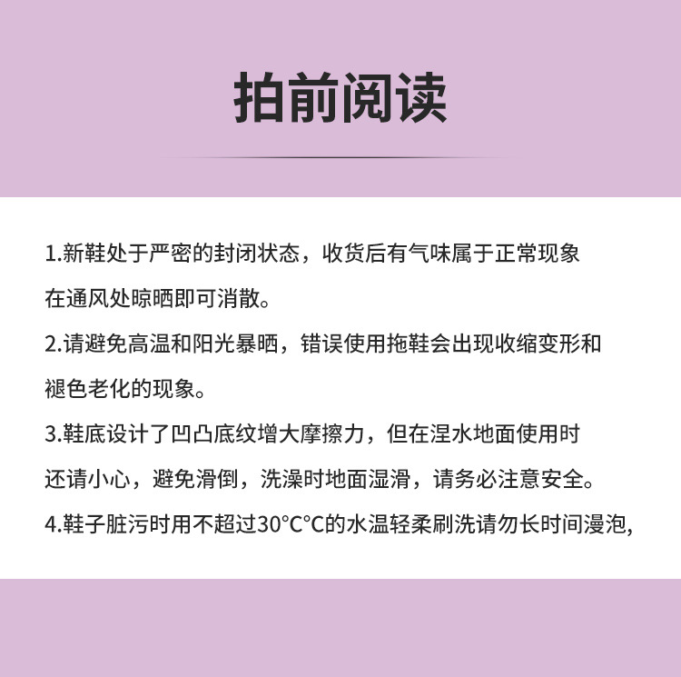 我们发货前都会检查仔细,万一有落网之鱼,请及时联系客服,把有问题的拖鞋拍照留底提交给我们,我们会妥善处理,由于生产过程中鞋处于密封包装,少许新鞋气味,放置通风出些许时间即可散发,产品生产均处于严格管控中,无毒无害放心使用!希望我们的全心全意跟努力能换回你们的5星好评!