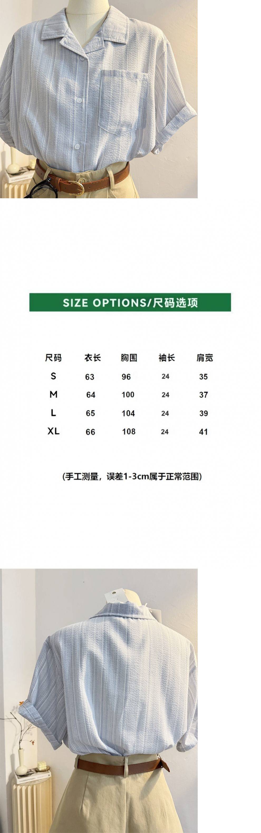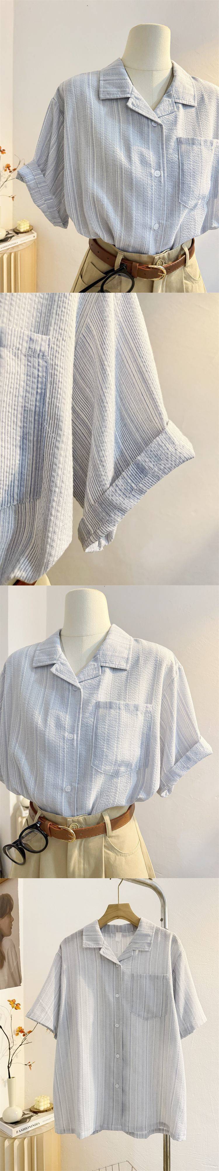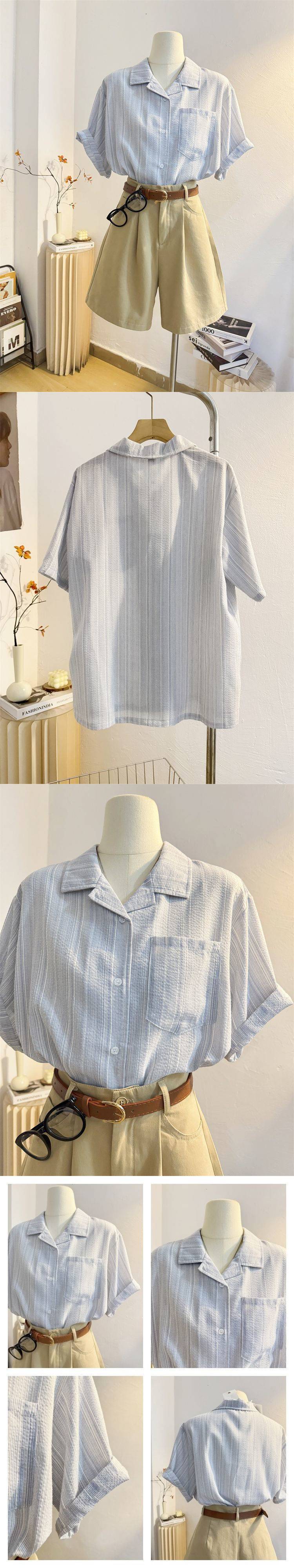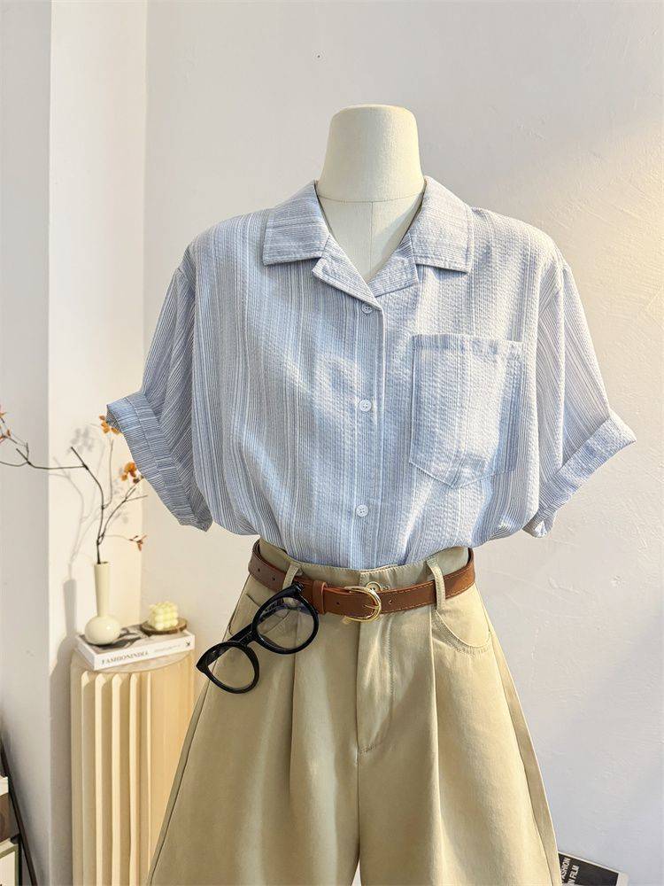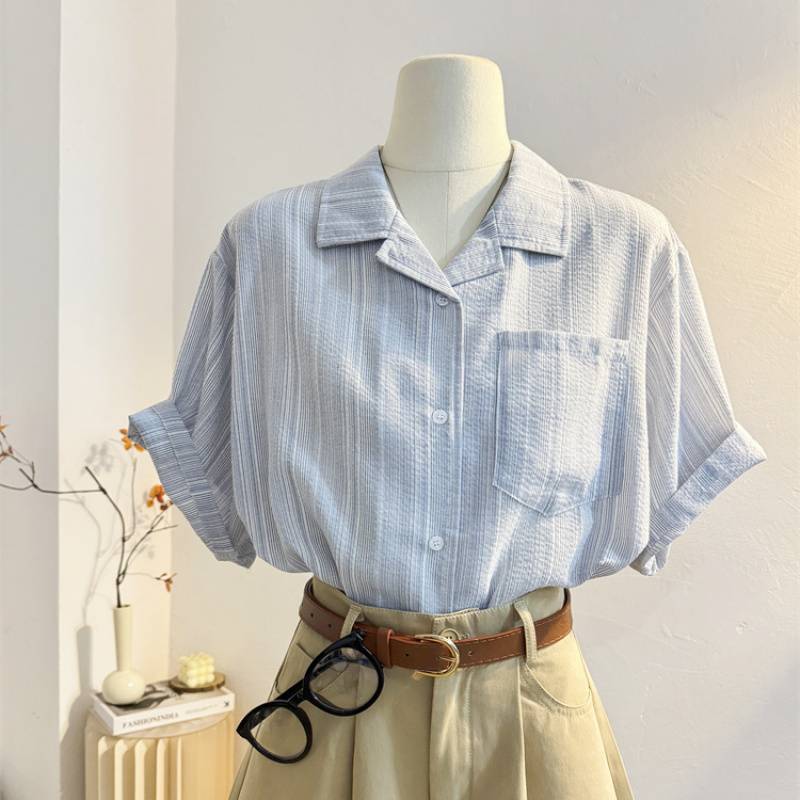 빈티지 홍콩 스타일 스트라이프 짧은 소매 셔츠 새로운 프랑스 디자인 셔츠 느슨한 커밍 여름 캐주얼 탑