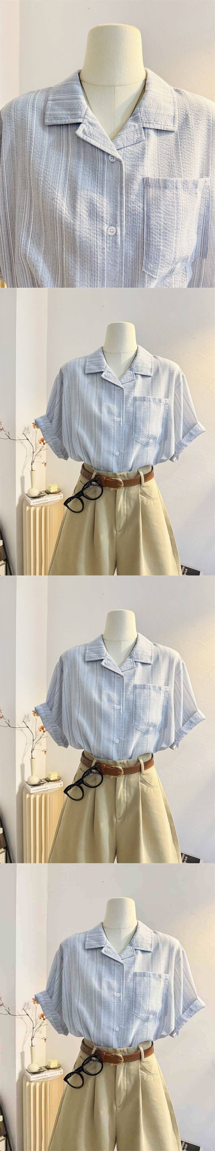 빈티지 홍콩 스타일 스트라이프 짧은 소매 셔츠 새로운 프랑스 디자인 셔츠 느슨한 커밍 여름 캐주얼 탑스토어 가기