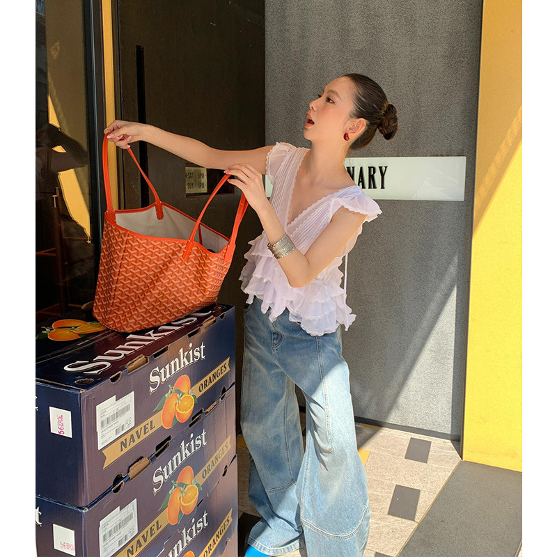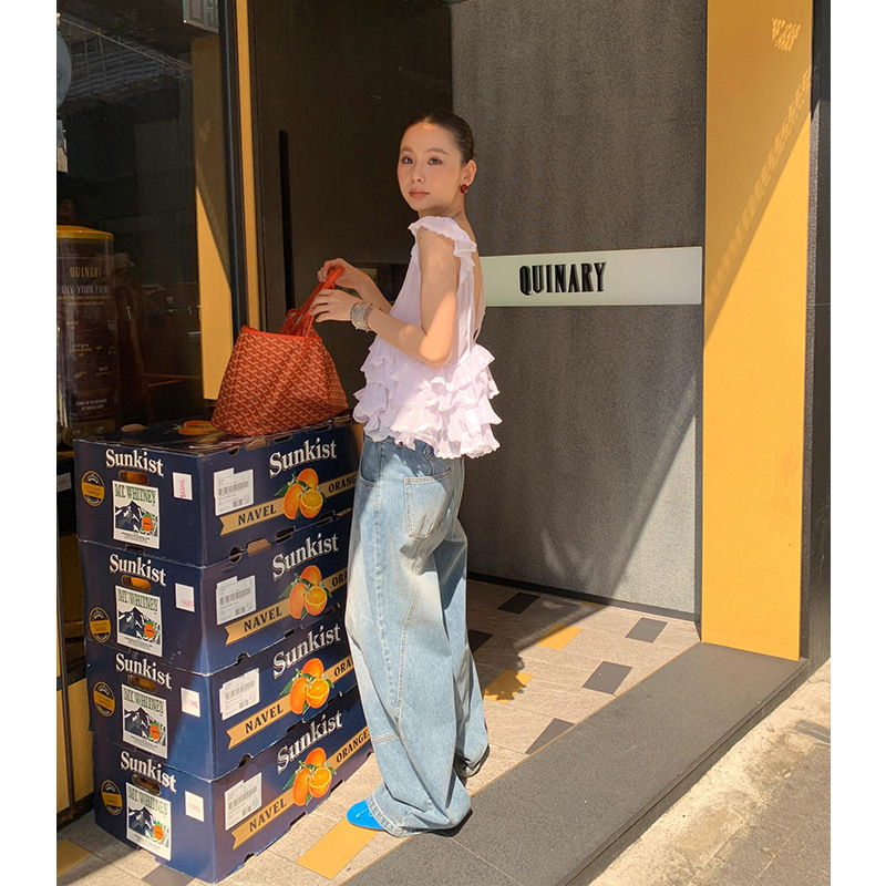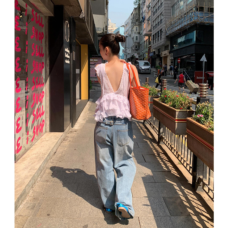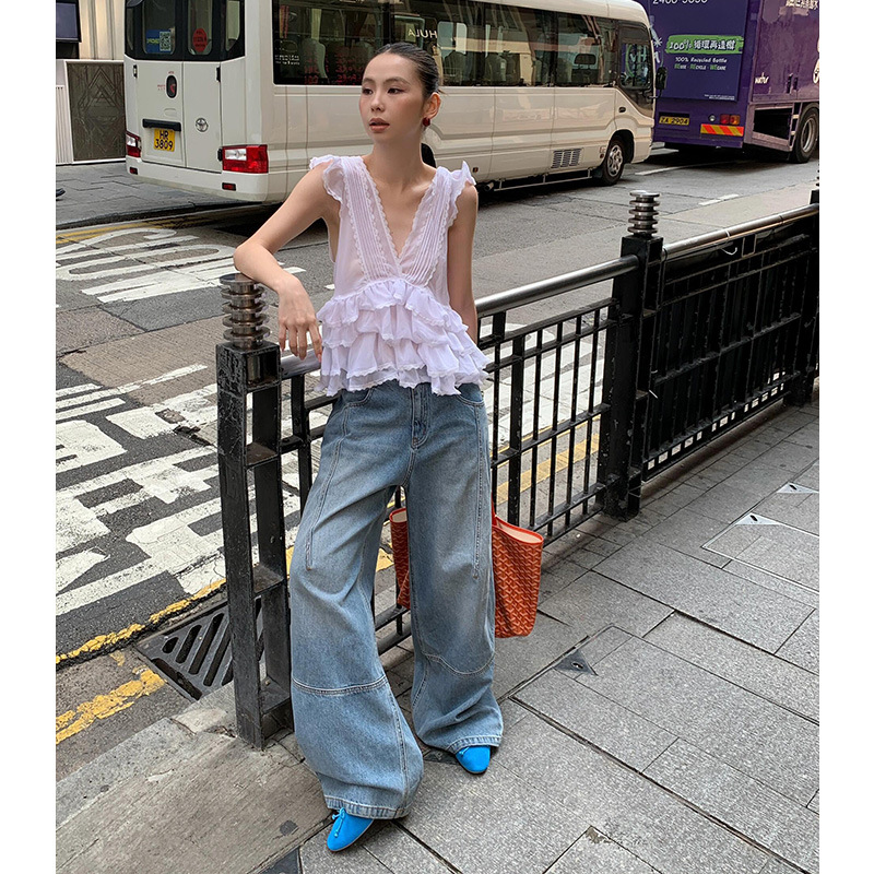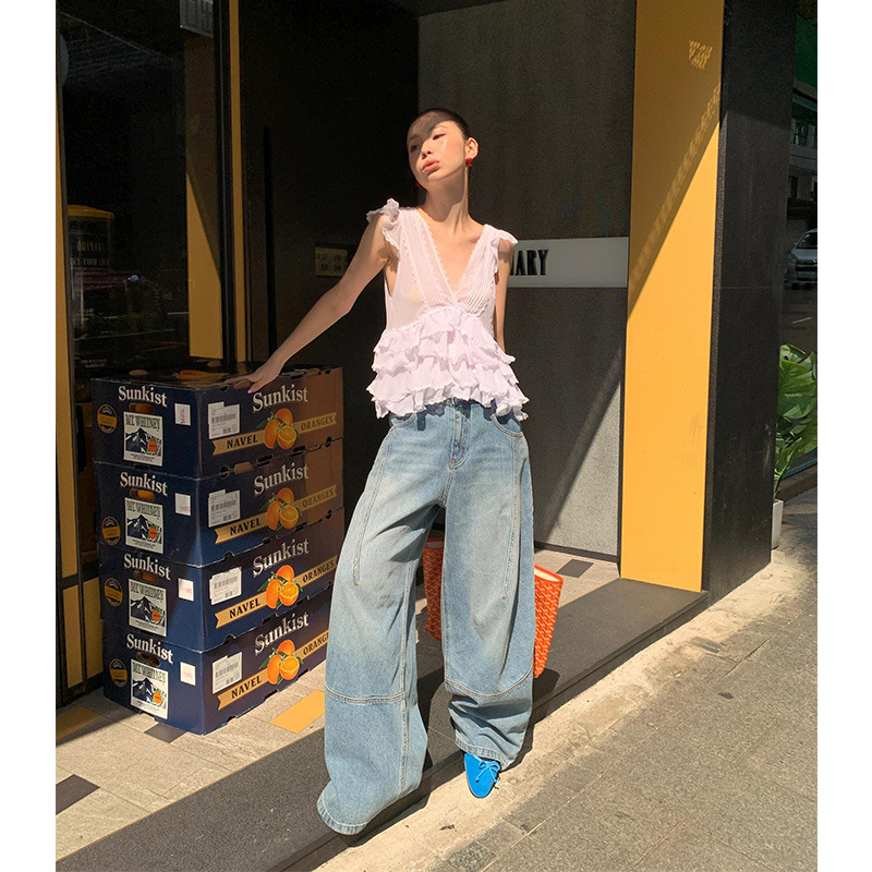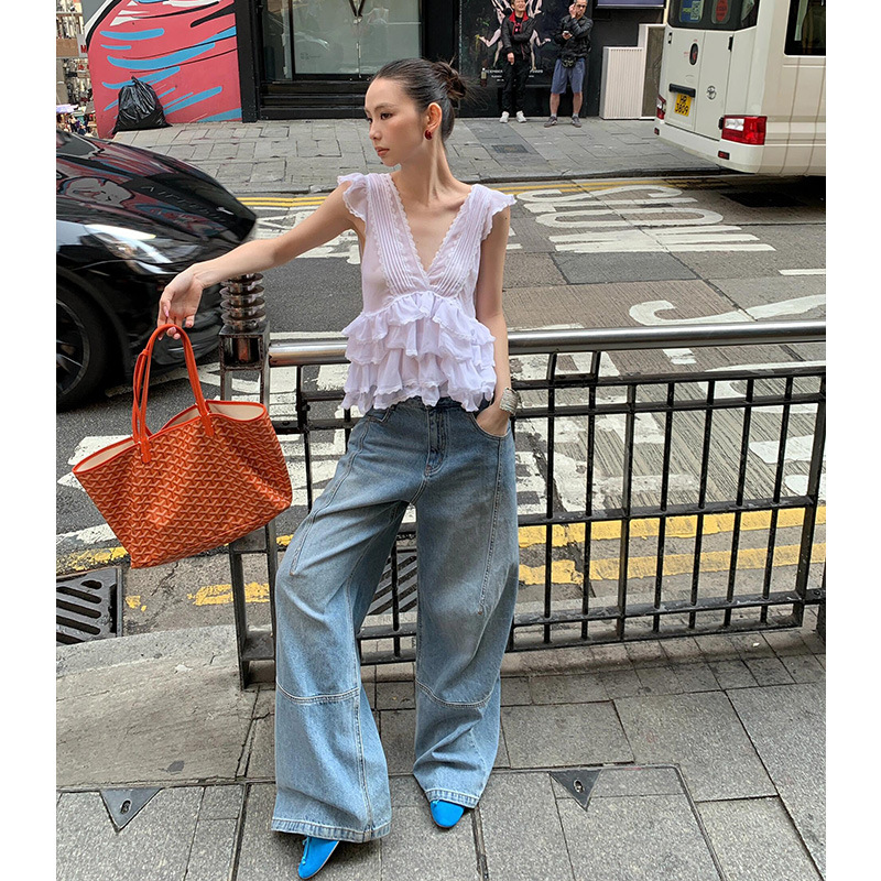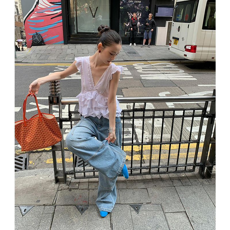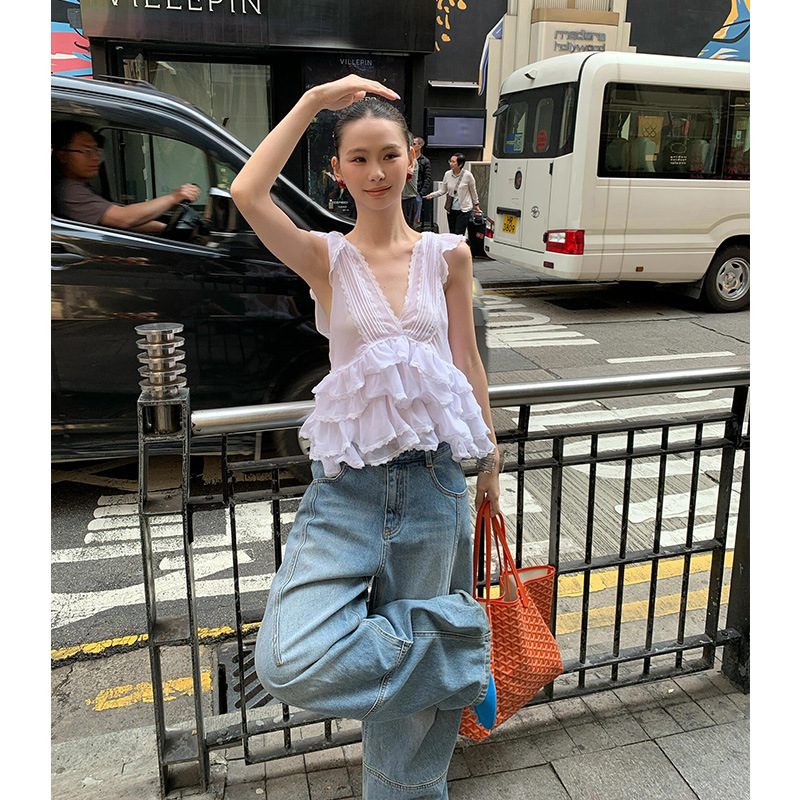 화이트 디자인 센스 레이스 민소매 V 넥 셔츠 여성의 2025 여름 스파이스 걸스 틈새 슬림 핏 셔츠 쇼트 탑스토어 가기