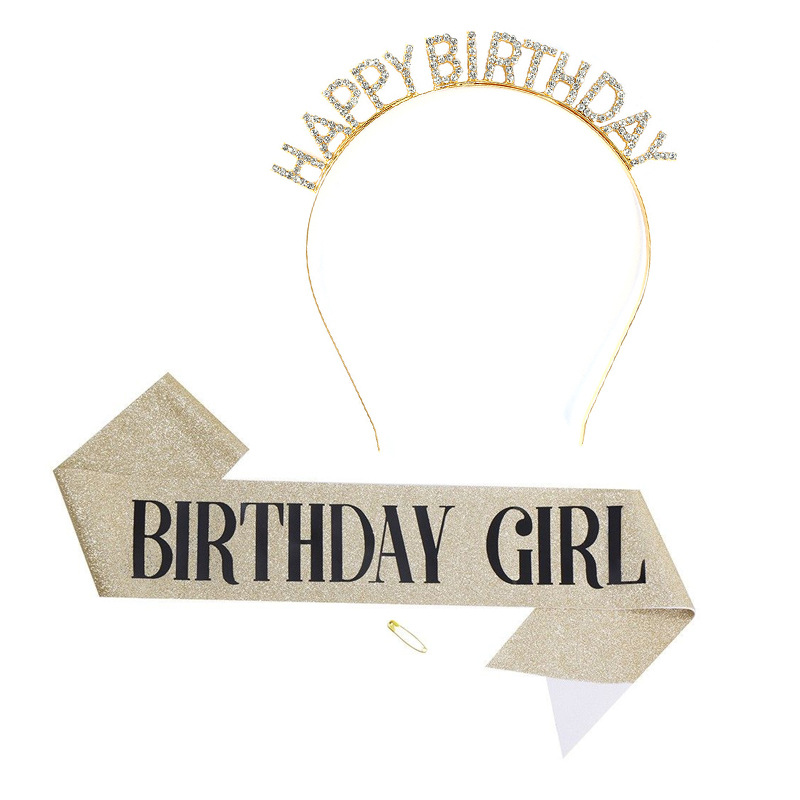 • 다이아몬드 머리띠가 달린 골드 생일 + 골드 소녀 어깨끈