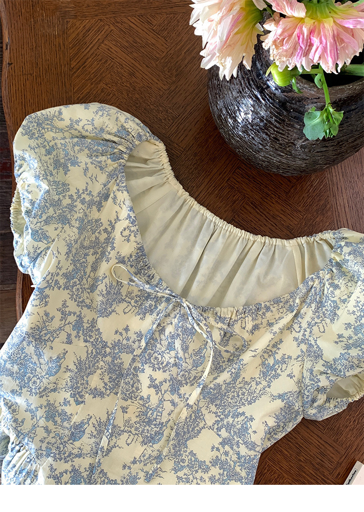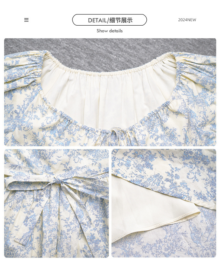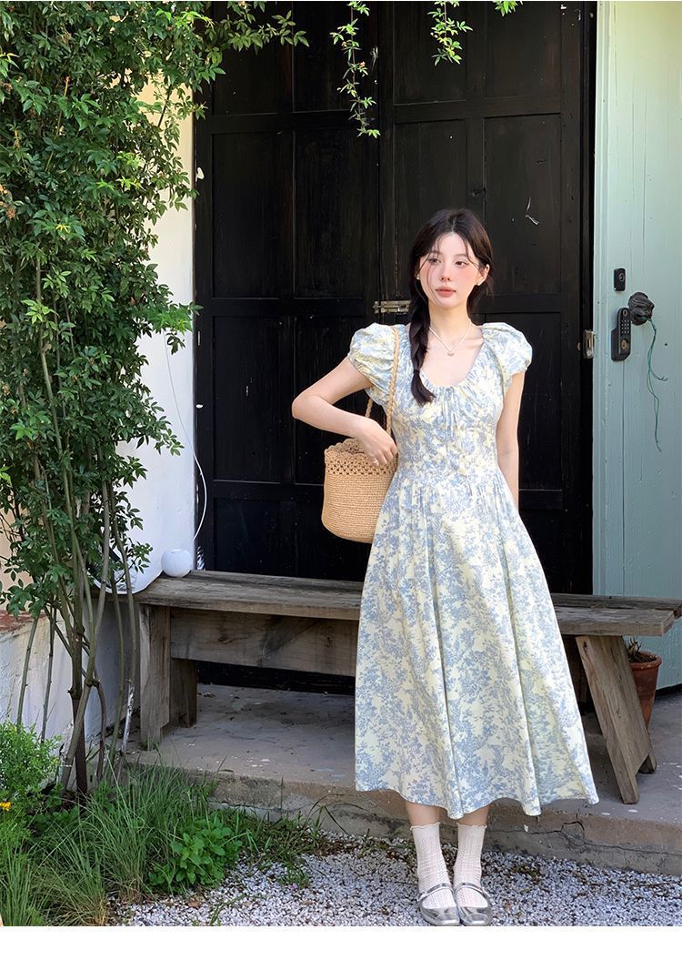 프랑스 블루 타이트 허리 부드러운 긴 원피스 우아한 꽃 원피스 여름 새로운 휴일 치마스토어 가기