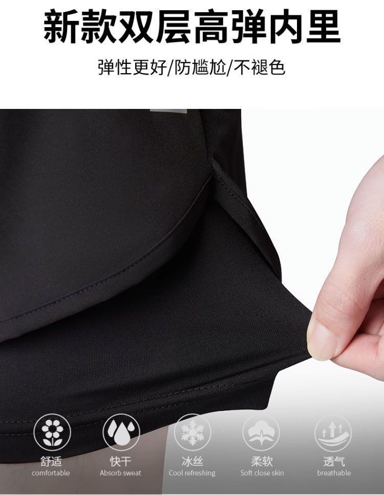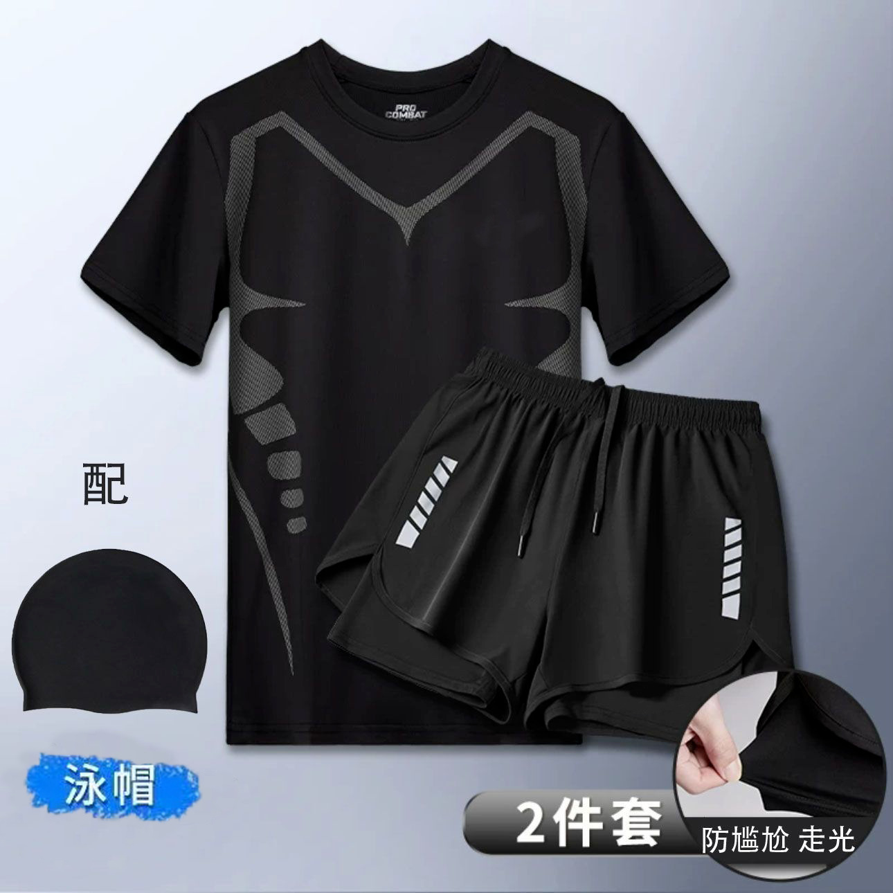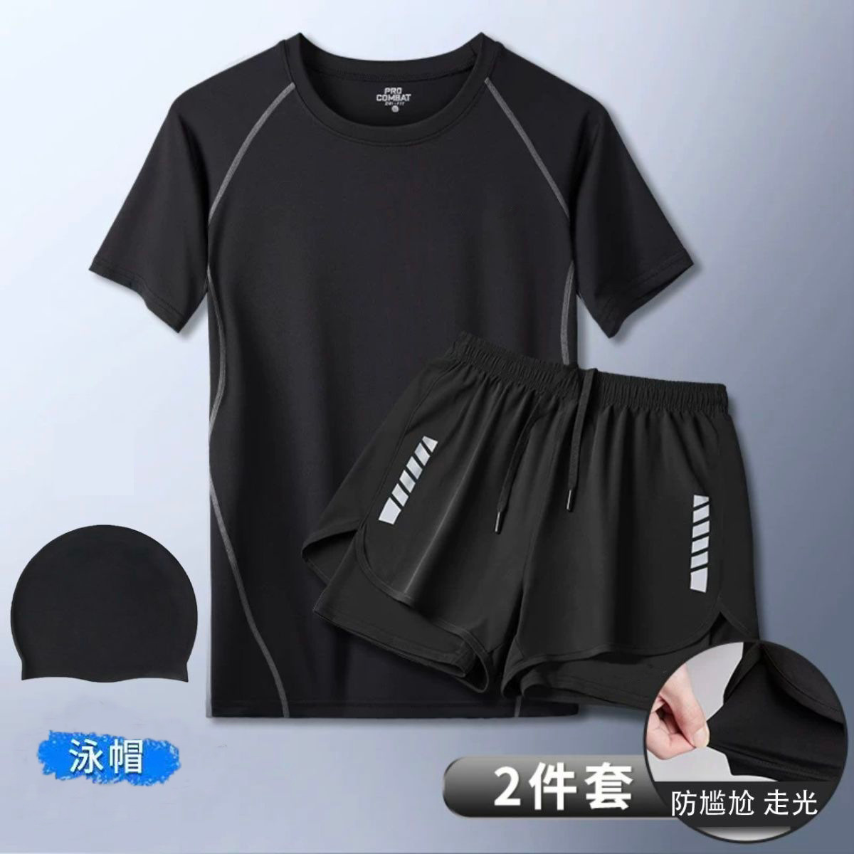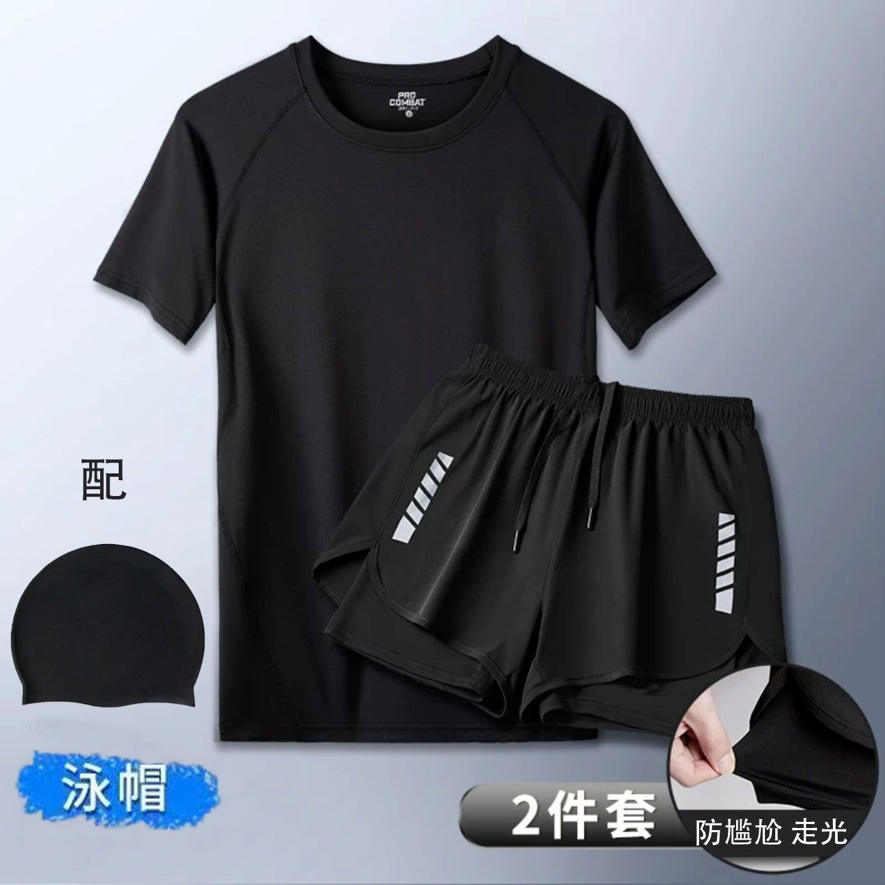 • 심플한 반팔 + 블랙 더블 레이어 반바지 [수영모 포함]