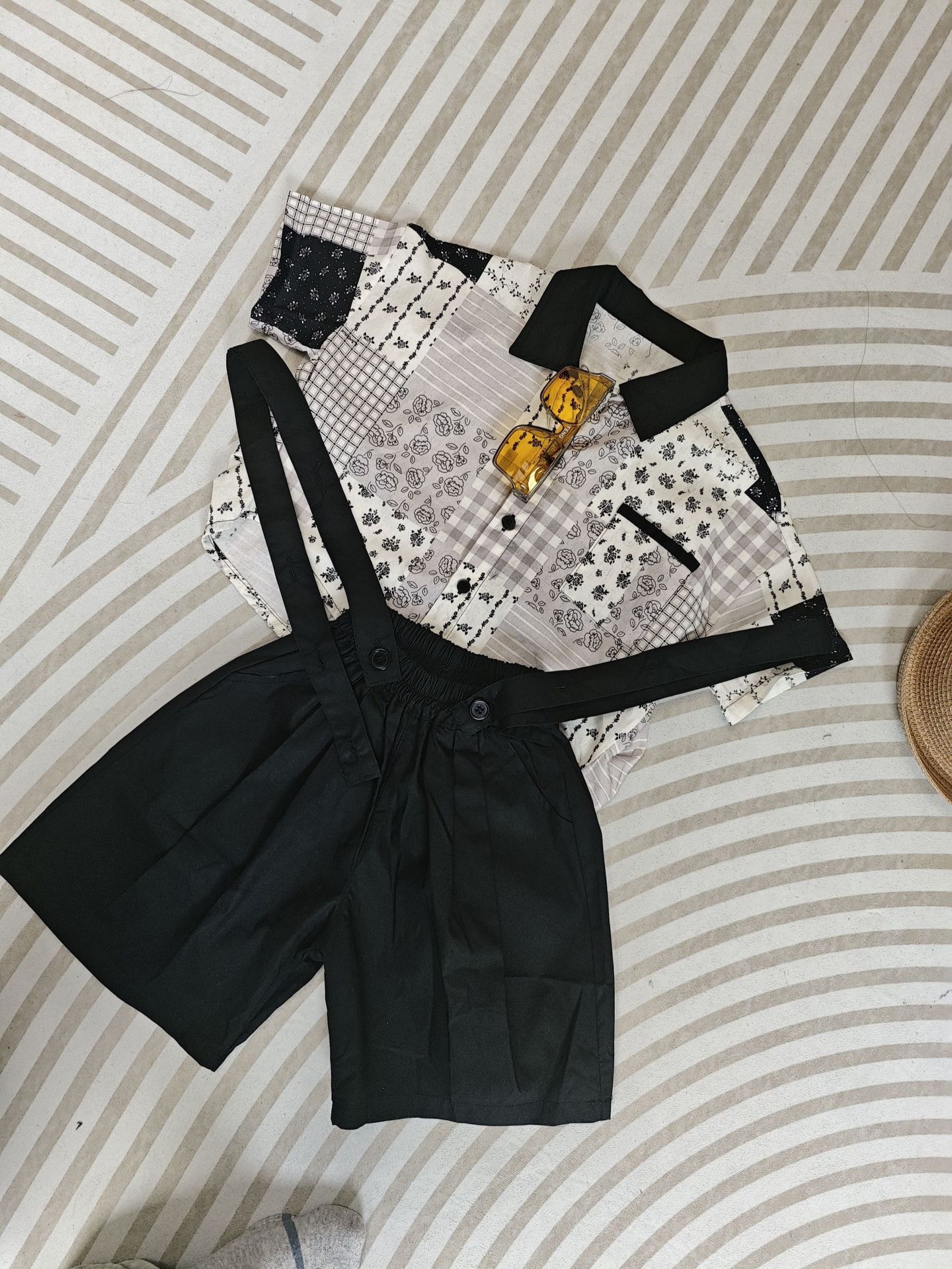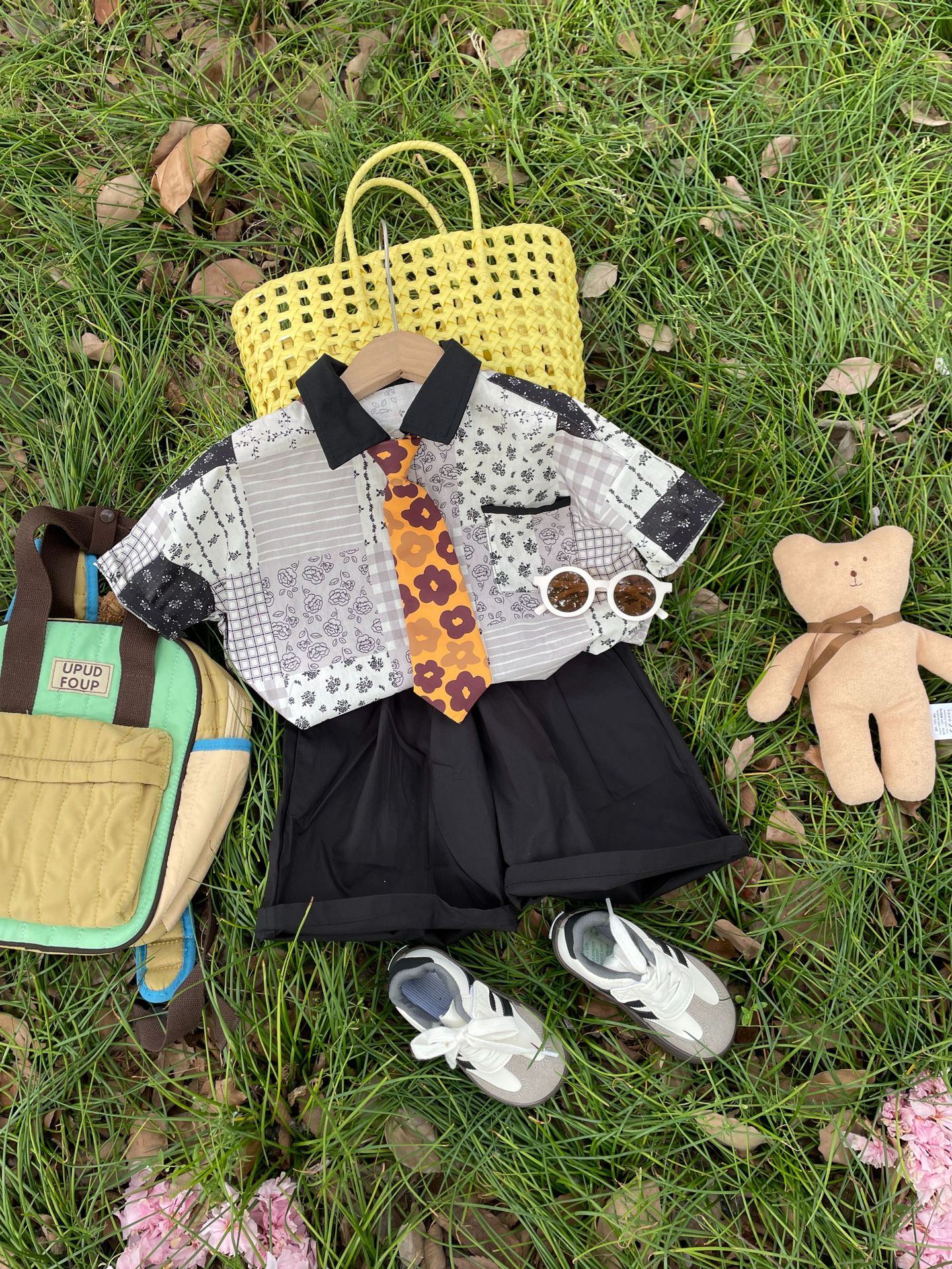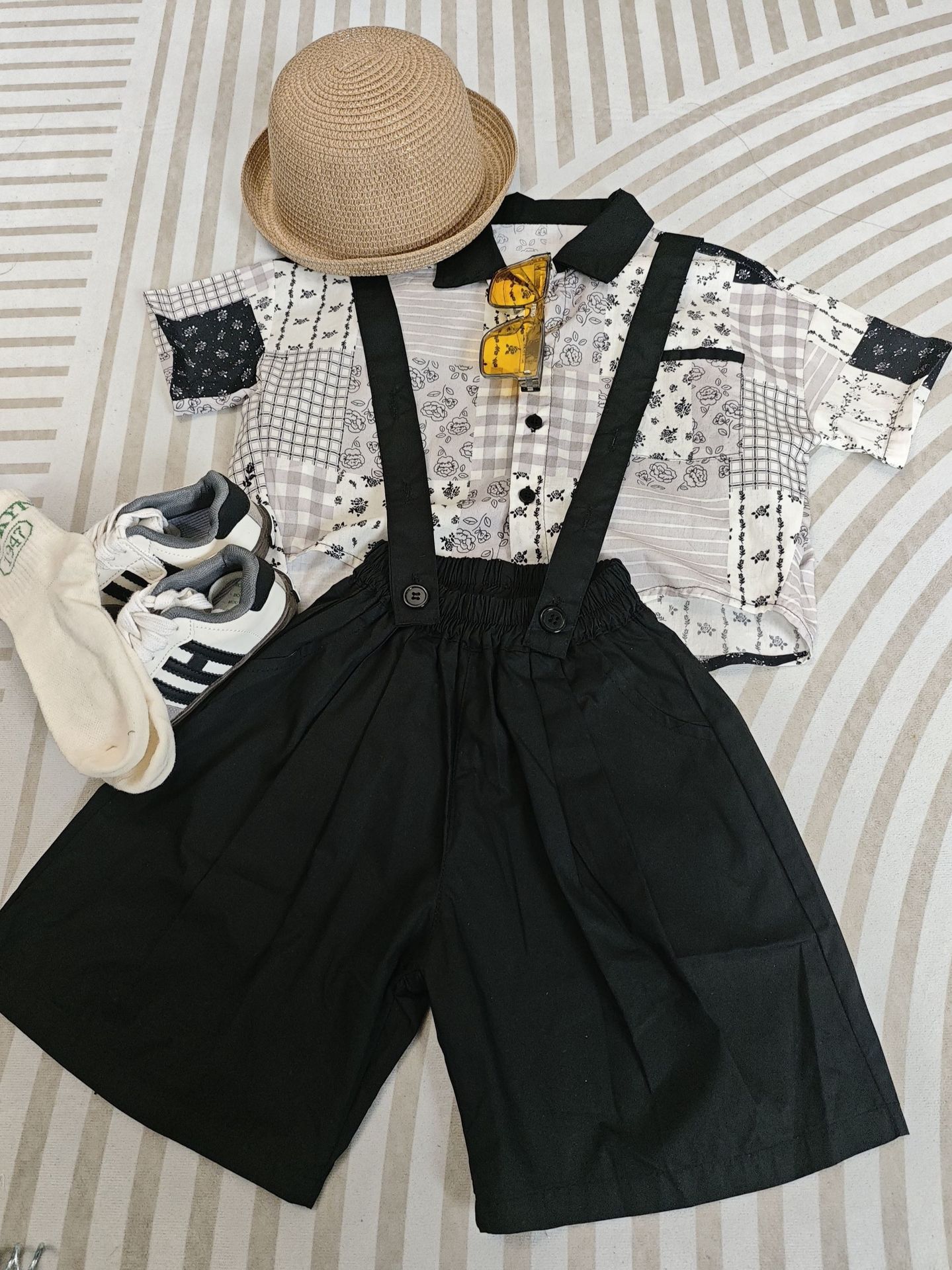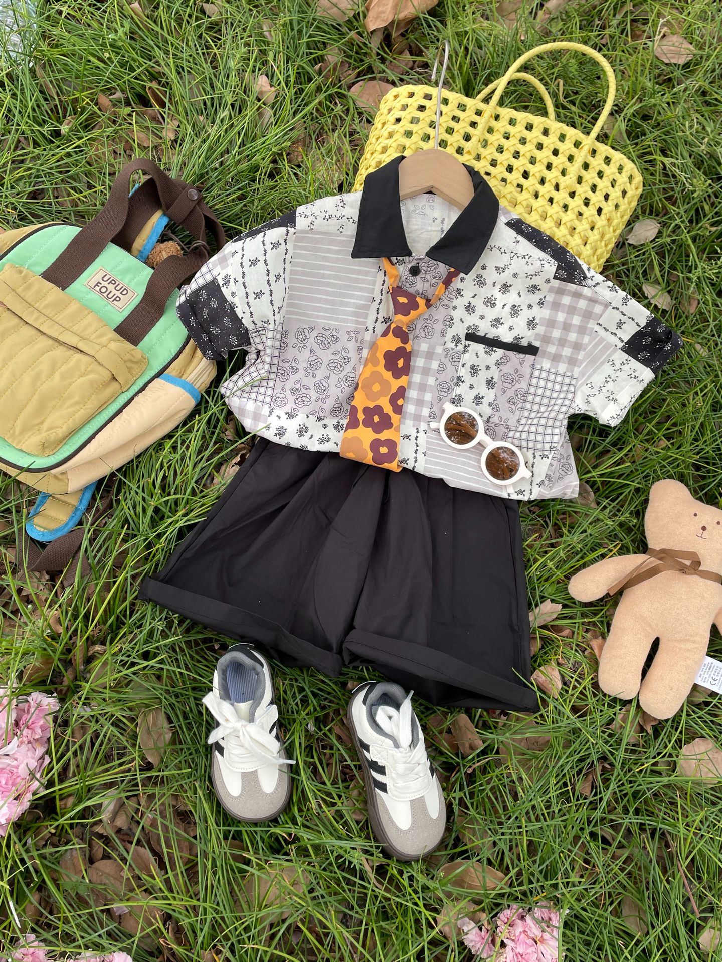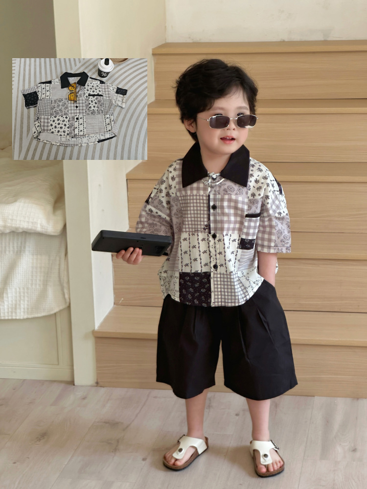 2025 소년 여름 세트 새로운 어린이 소년 여름 서양 스타일 전체 인쇄 셔츠 반팔 투피스 유행 세트스토어 가기