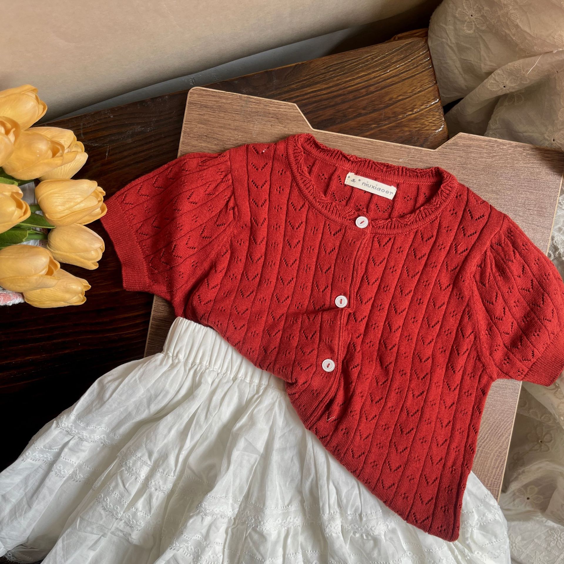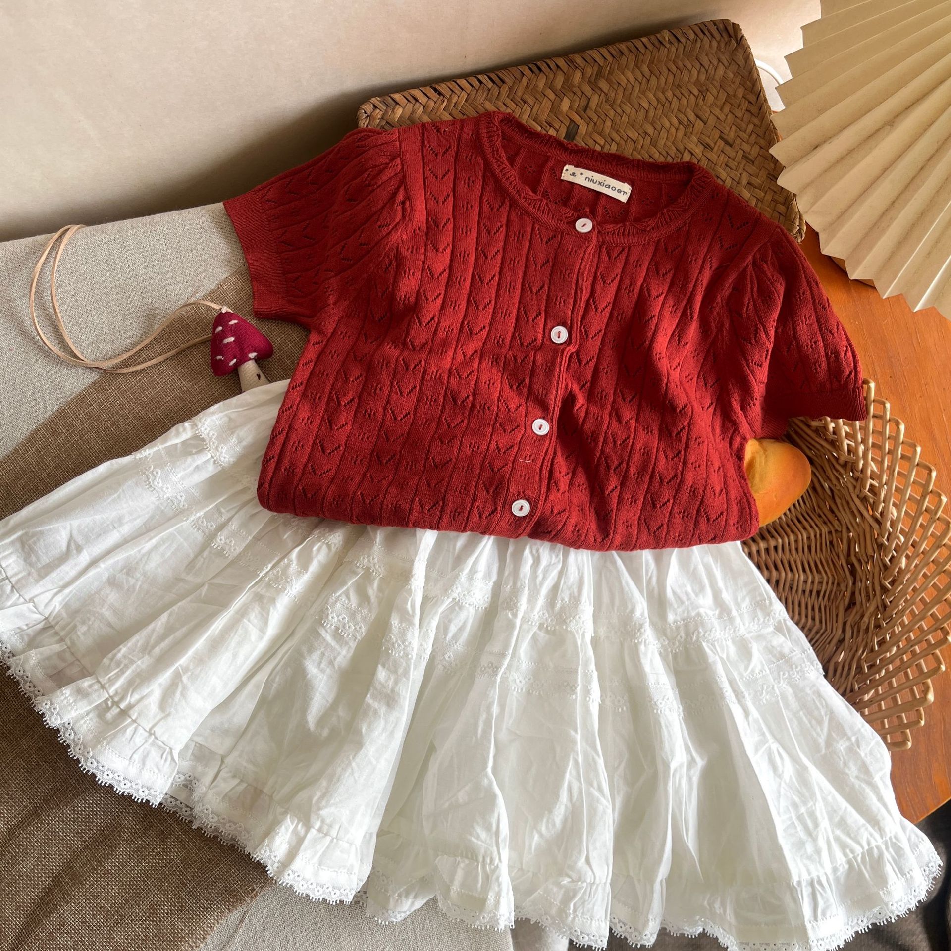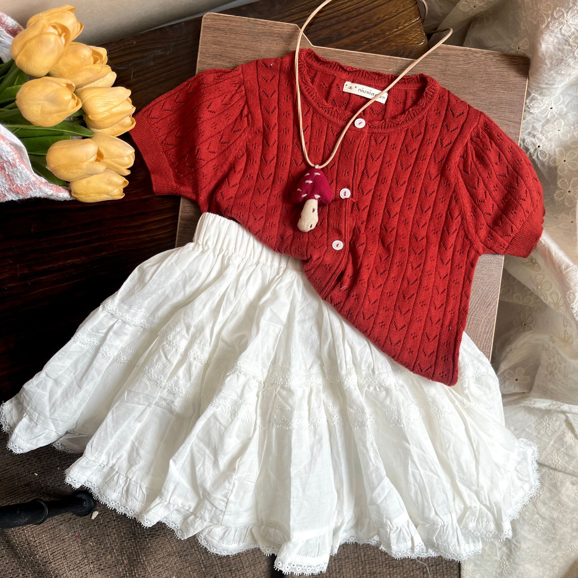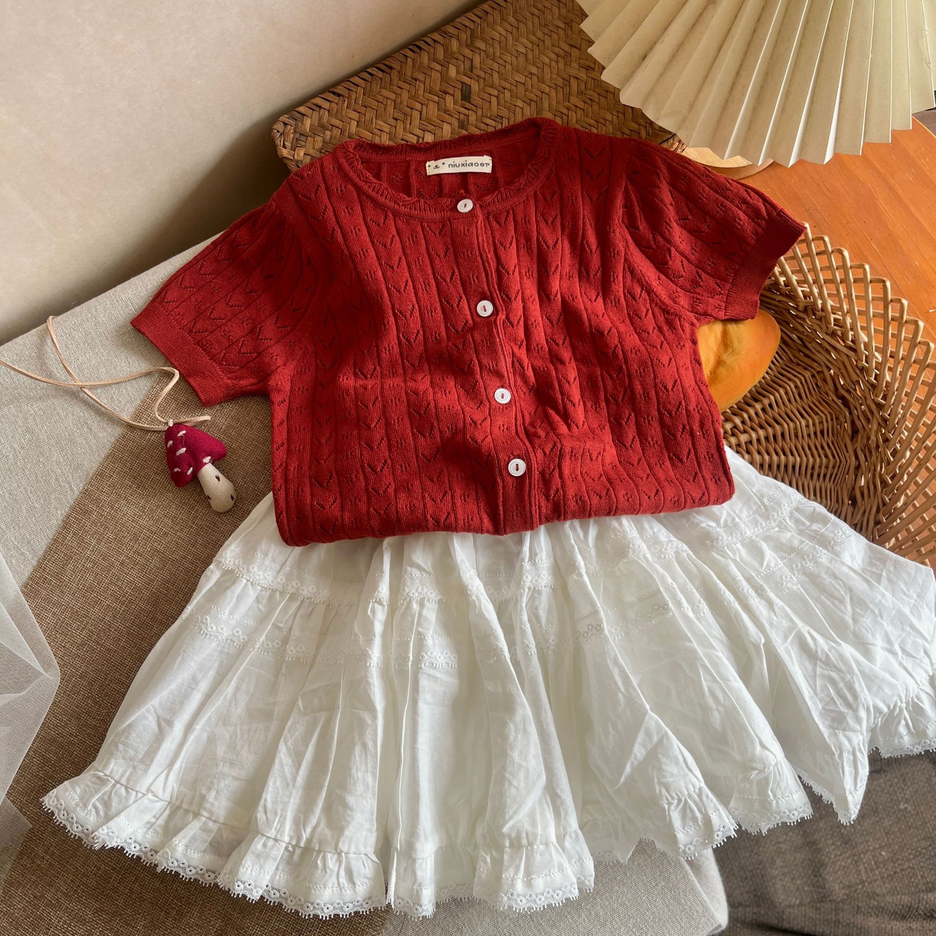 2025 여름 소녀 틈새 싱글웨어 코트 레이스 할로우 퍼프 슬리브 니트 카디건 세트 스커트