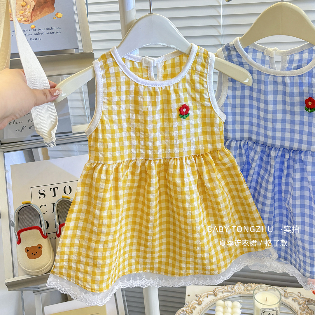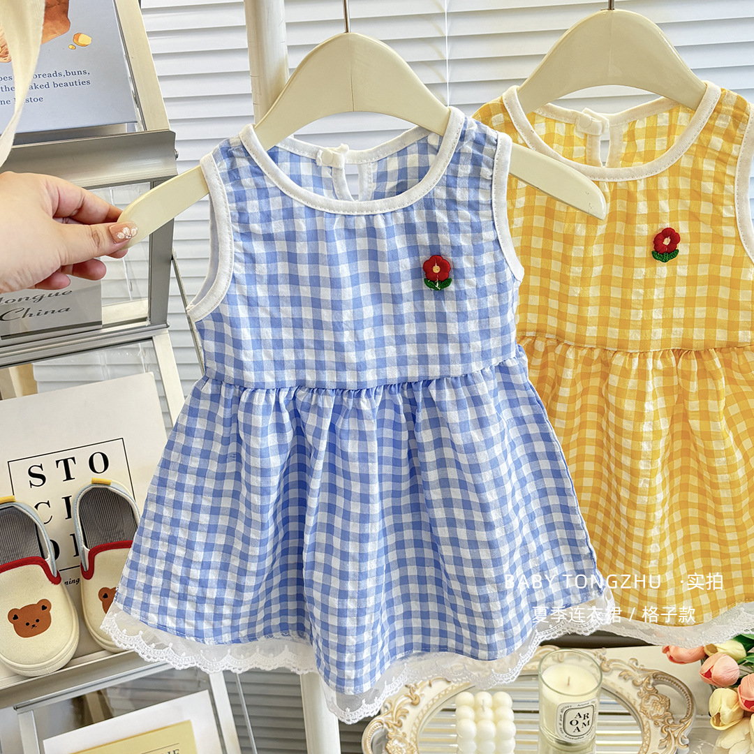 여름 새로운 달콤한 여자 격자 무늬 치마 한국 버전의 여성 아기 원피스 소년 소녀 조끼 반바지 세트 도매스토어 가기