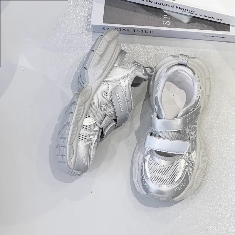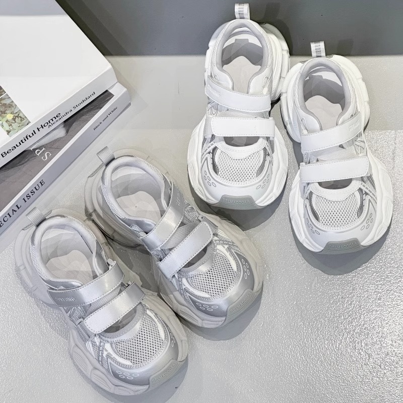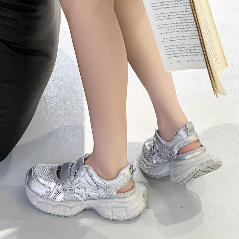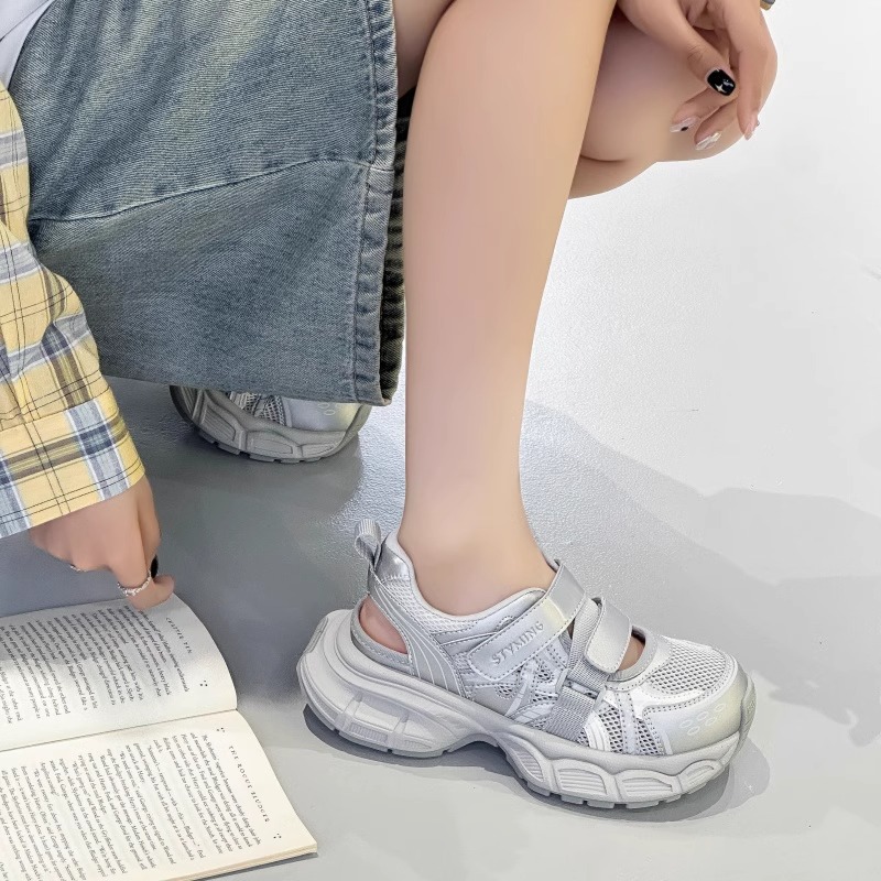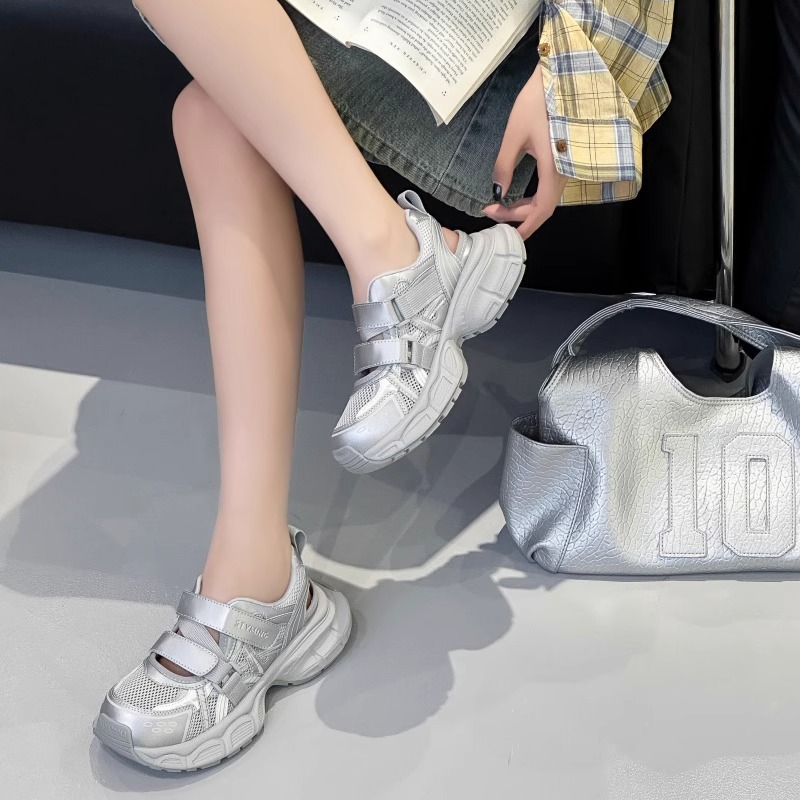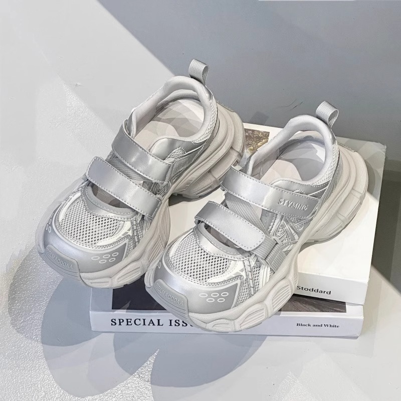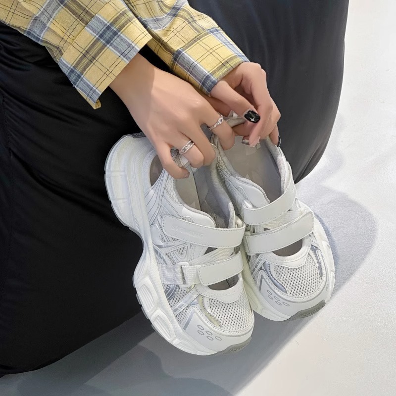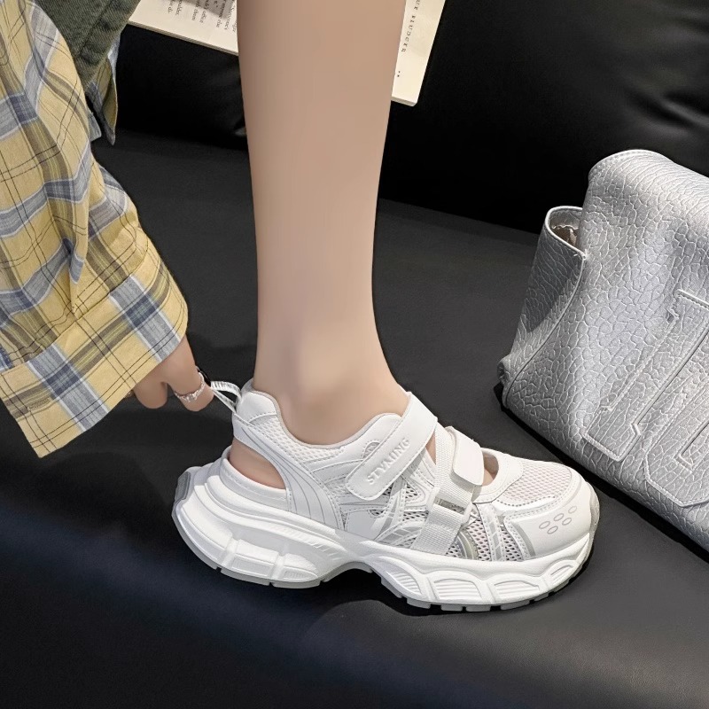 여성을위한 여름 중공 메쉬 아빠 신발 2025 새로운 두꺼운 밑창 초경량 벨크로 통기성 스포츠 및 레저 샌들 유행